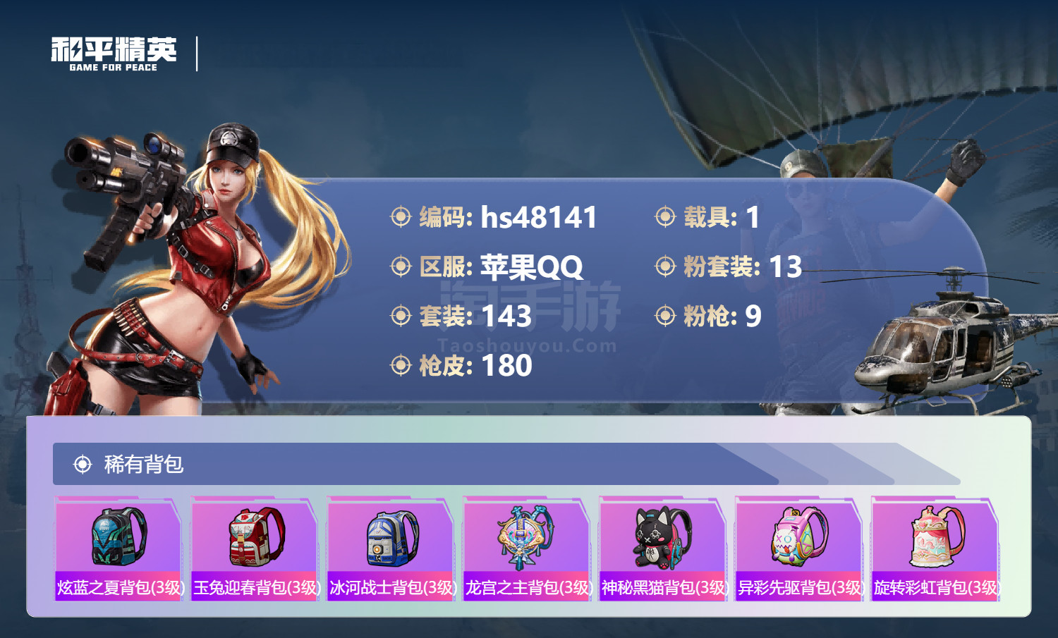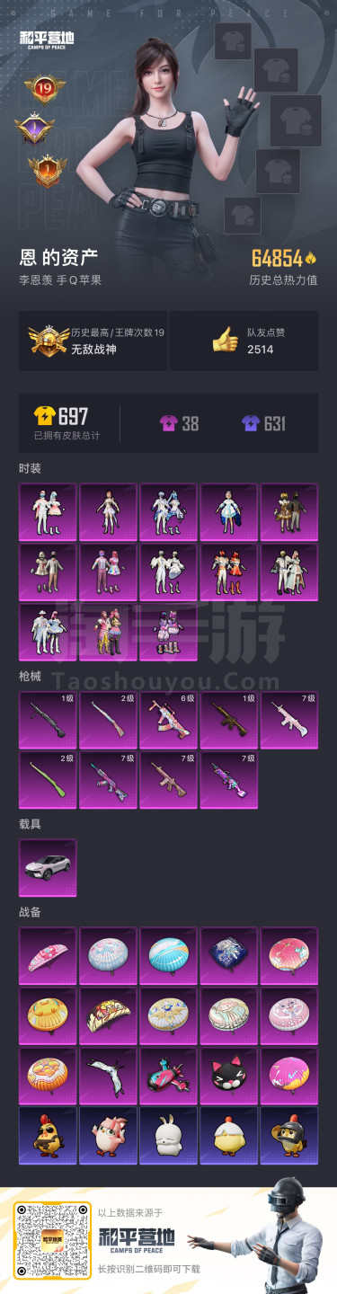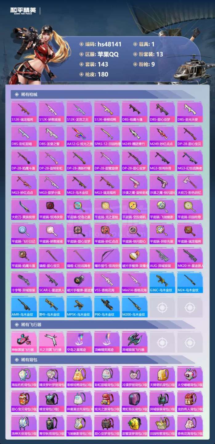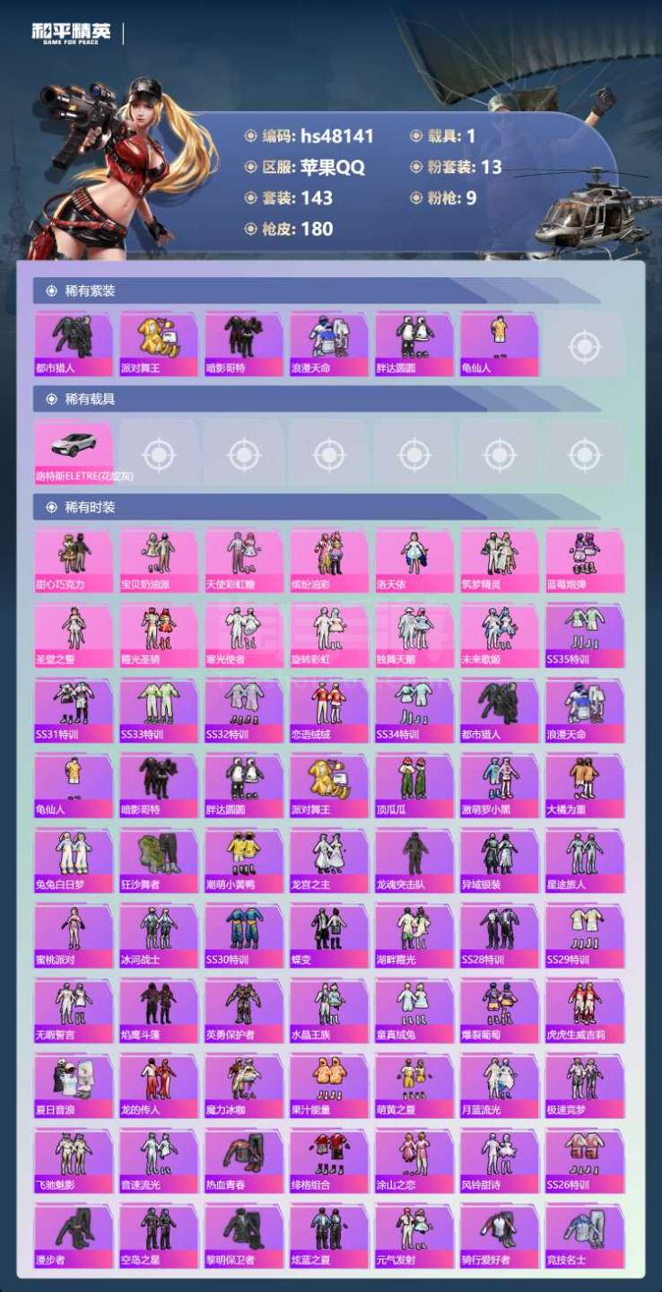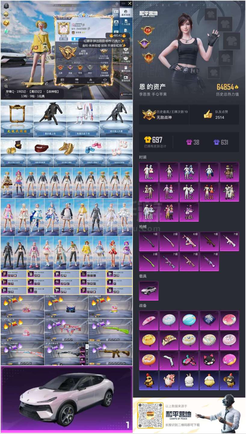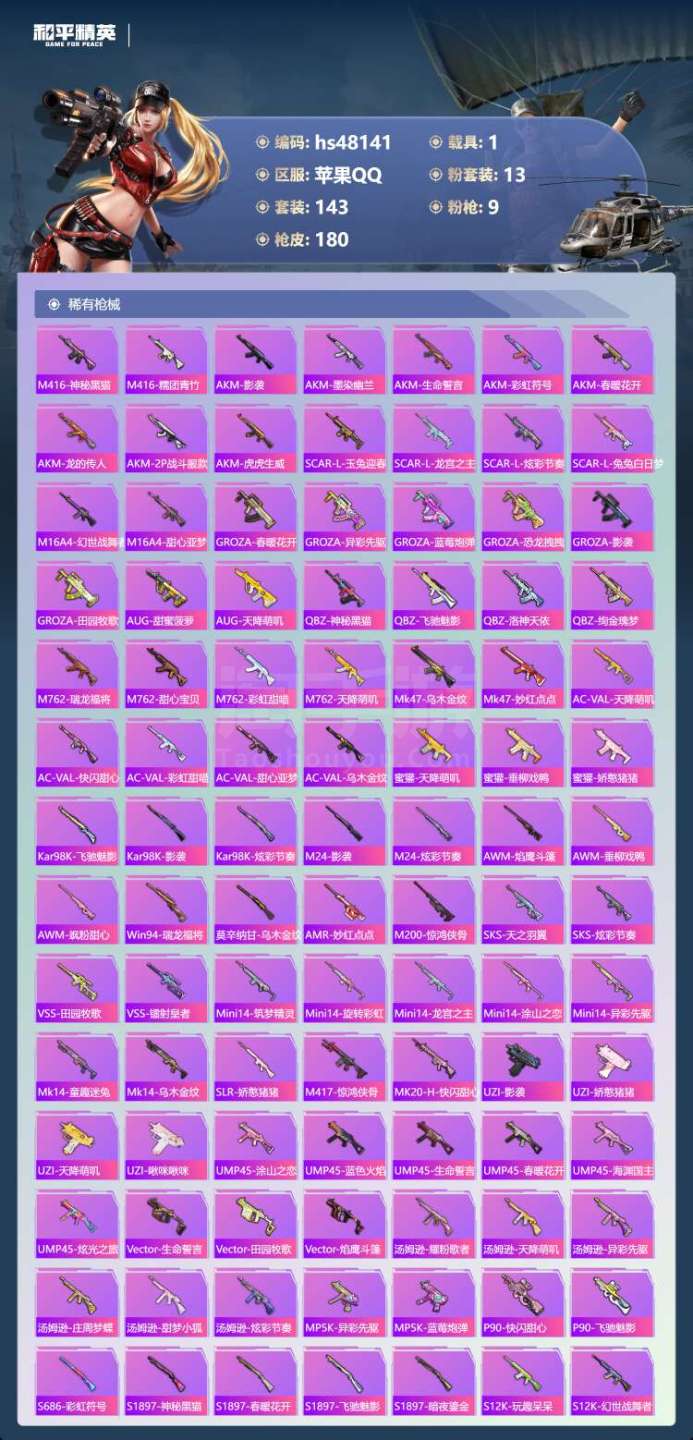 苹果手Q-19王牌印记-有战神框-13粉装-9特效枪-1载具-65155热力值-143套装-180枪