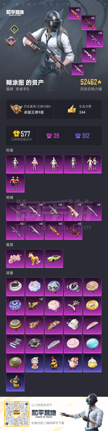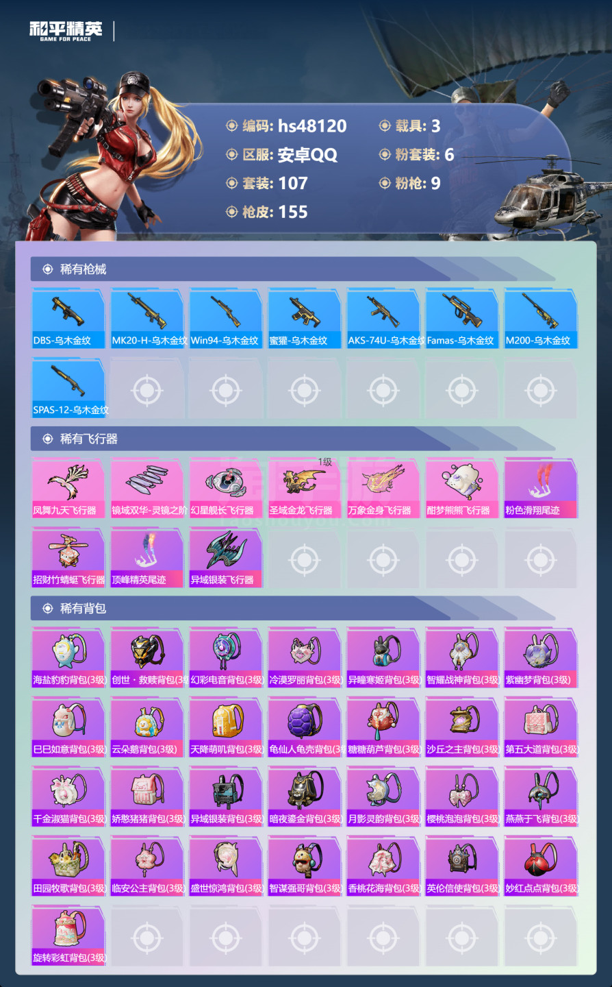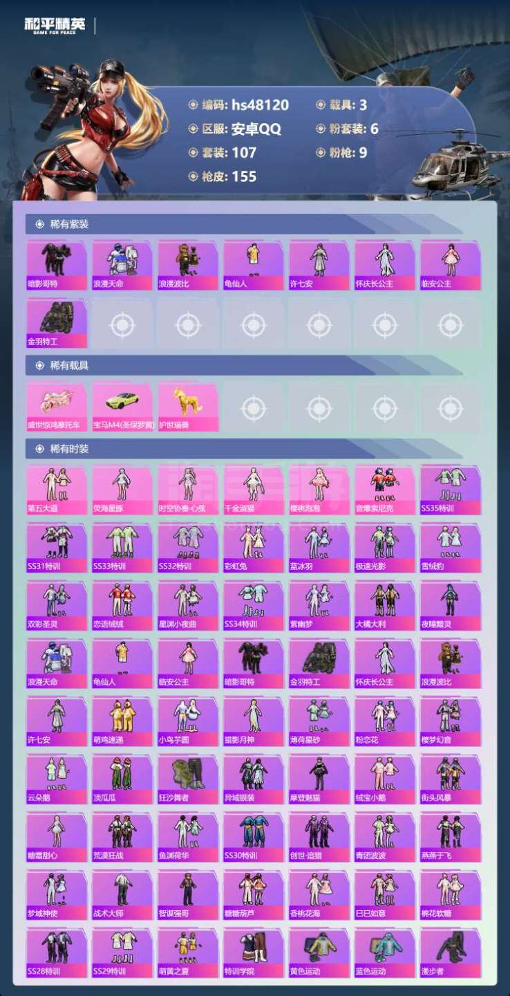 hs48120 安卓手Q-6王牌印记-6粉装-9特效枪-3载具-52472热力值-107套装-155