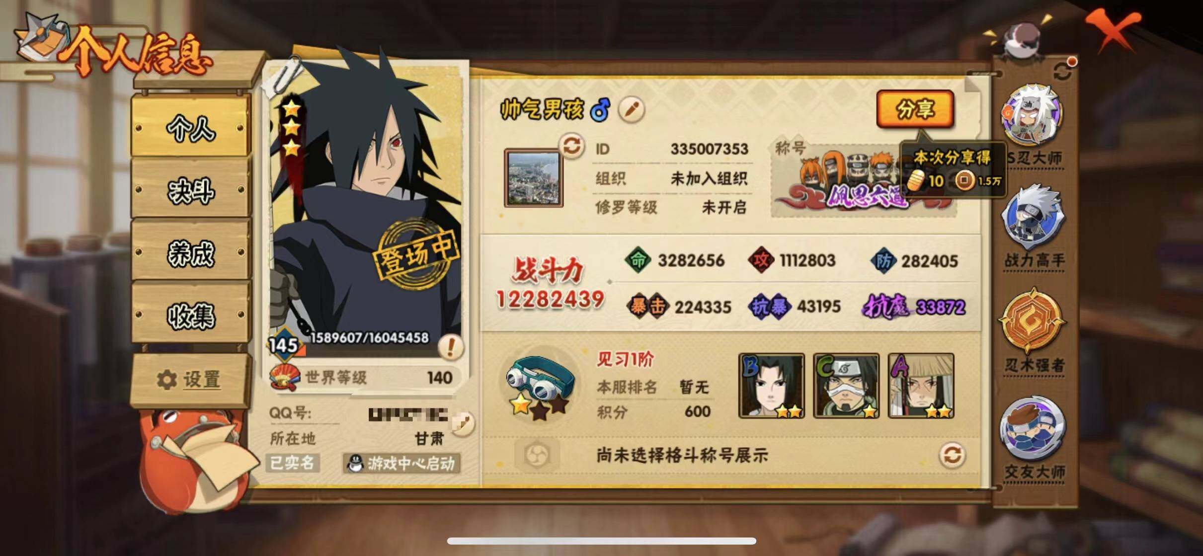 火影忍者【苹果QQ】V9/1228万战力/总忍者185/23S/31A/须佐止水/创立柱间/创立斑