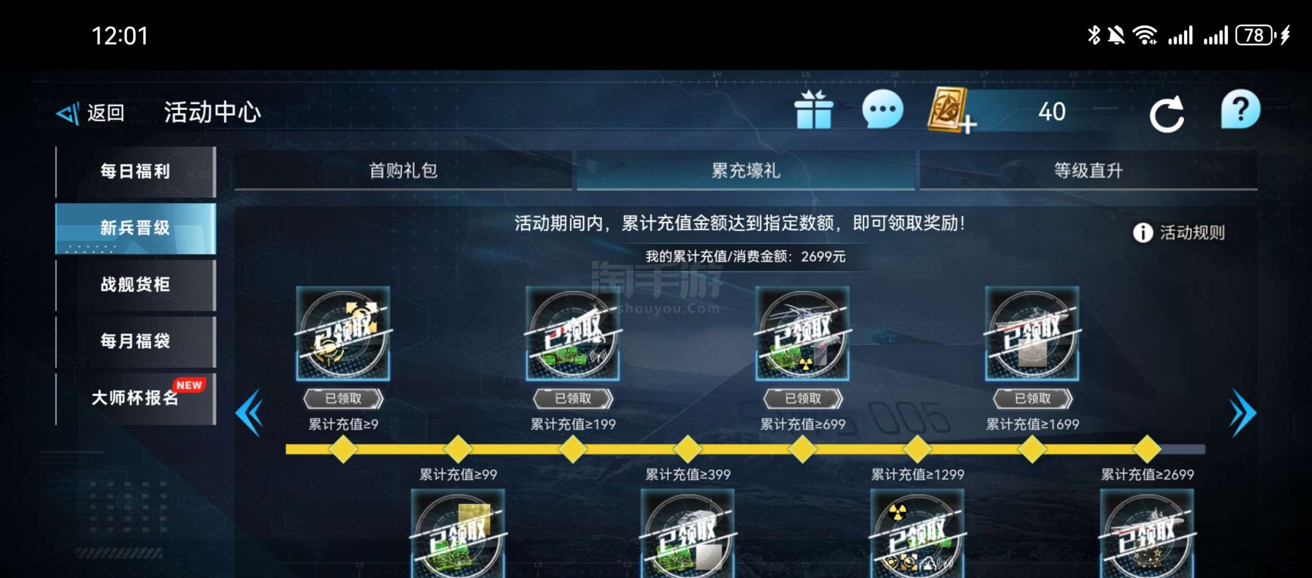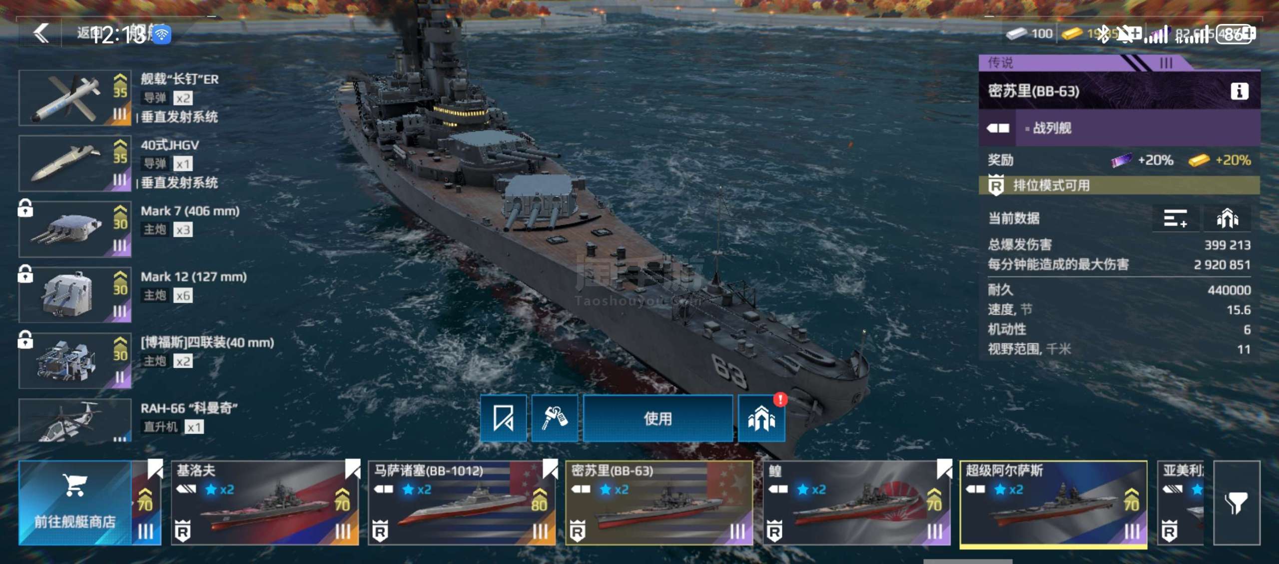 满配阿尔塞斯、麒麟舰、055A、达州、4000、三弗齐、承影、大和、密苏里、暴风雨,氪金2700。