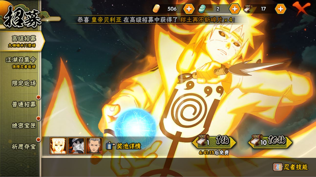 【S忍者】宇智波斑「秽土转生·解」,宇智波佐助「永恒万花筒」,神秘面具男「红夜之刃」,千手柱间「秽土转生」,自来也「舞之豪杰」,自来也「传说中的三忍」,宇智波鼬「秽土转生」,宇智波斑「白面具」,宇智波鼬「须佐能乎」,佩恩「天道」,波风水门,大蛇丸,纲手,