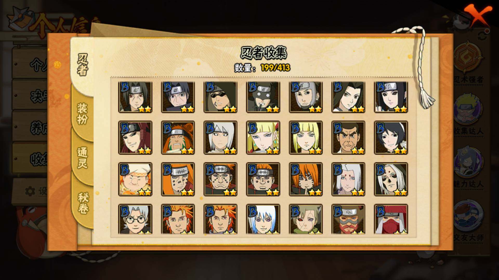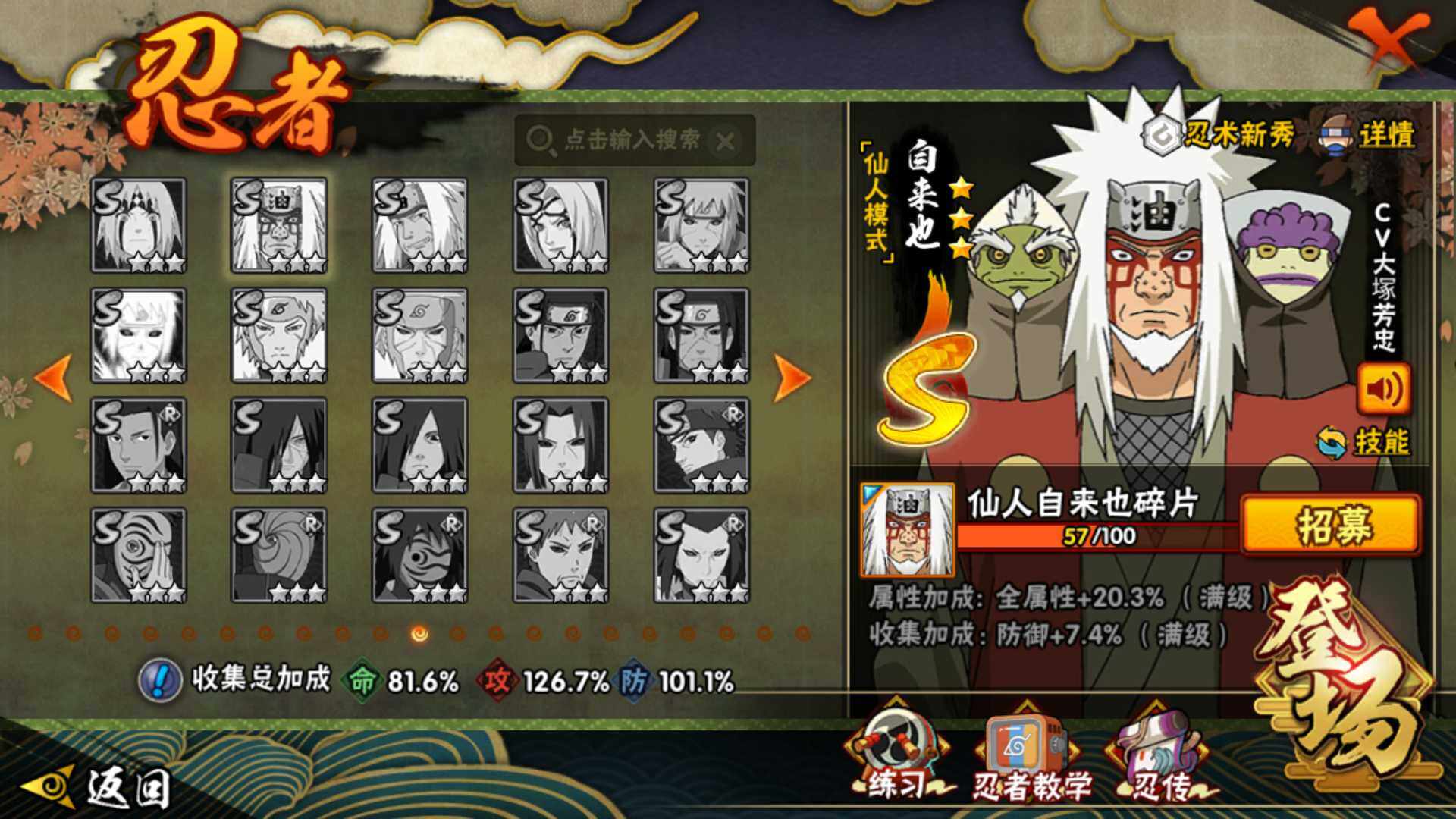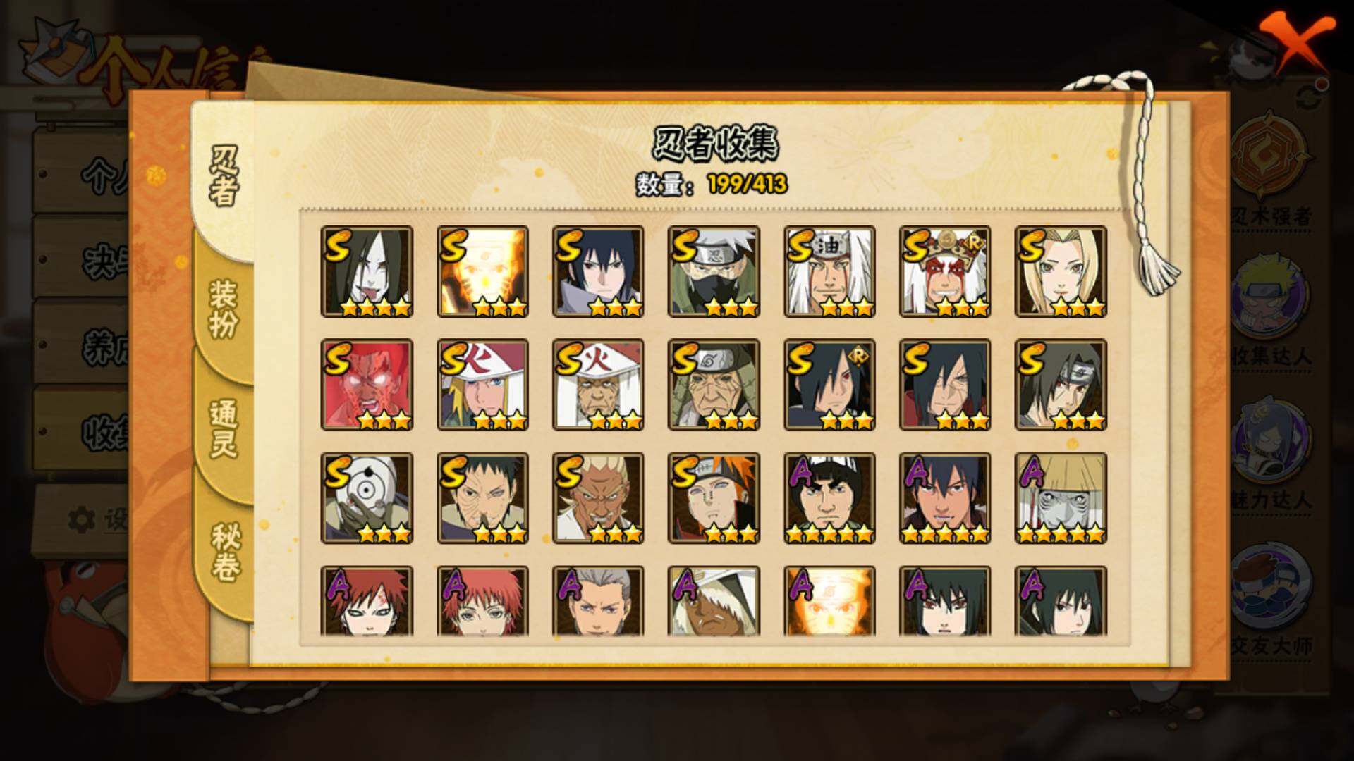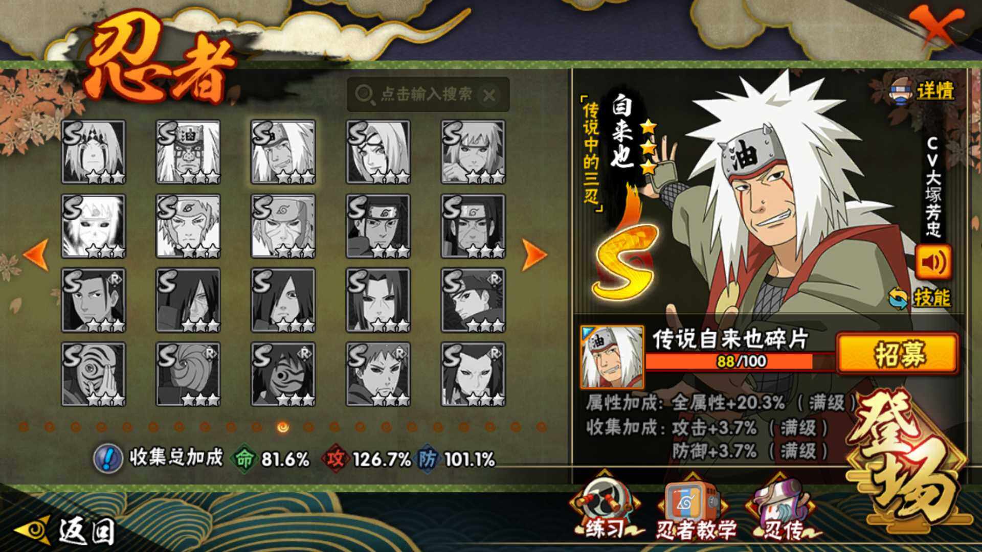 【S级忍者】:猿飞日斩「秽土转生」(3星),宇智波斑「秽土转生·解」(3星),宇智波带土「忍界大战」(3星),艾「忍界大战」(3星),宇智波鼬「须佐能乎」(3星),旗木卡卡西「须佐能乎」(3星),宇智波斑「木叶创立」(3星),自来也(3星),自来也「舞之豪