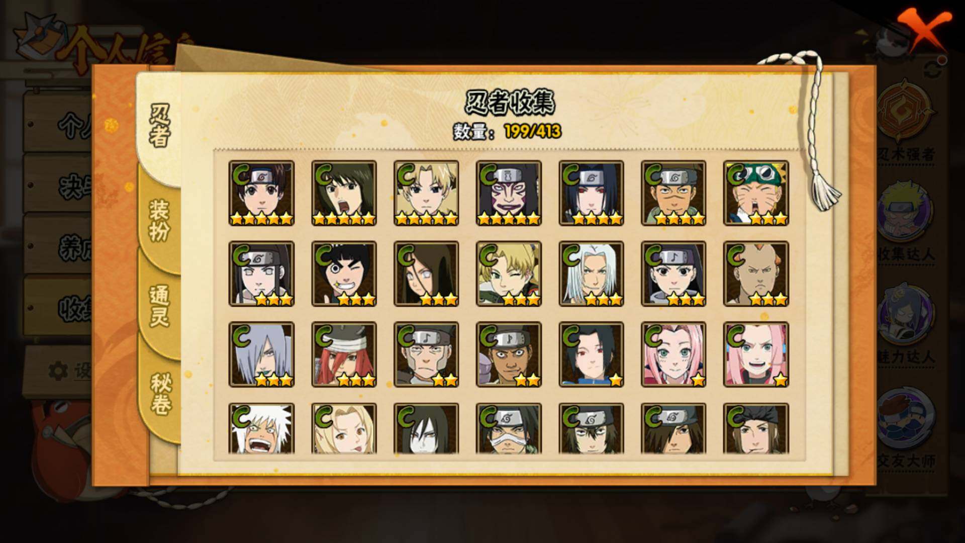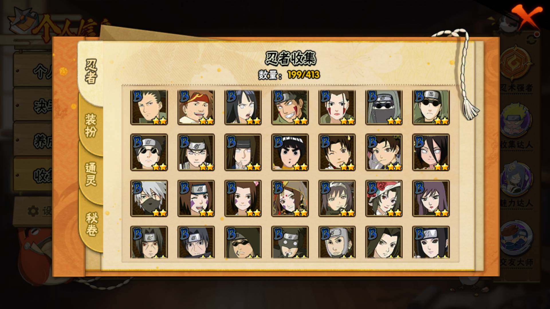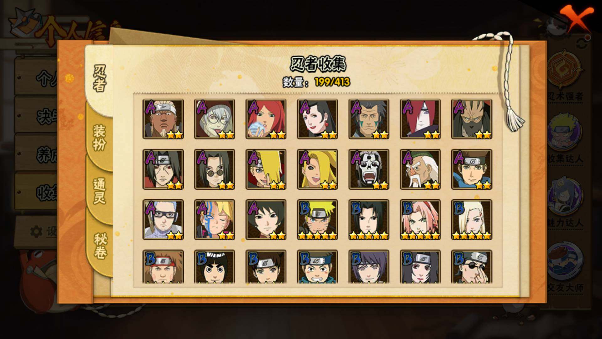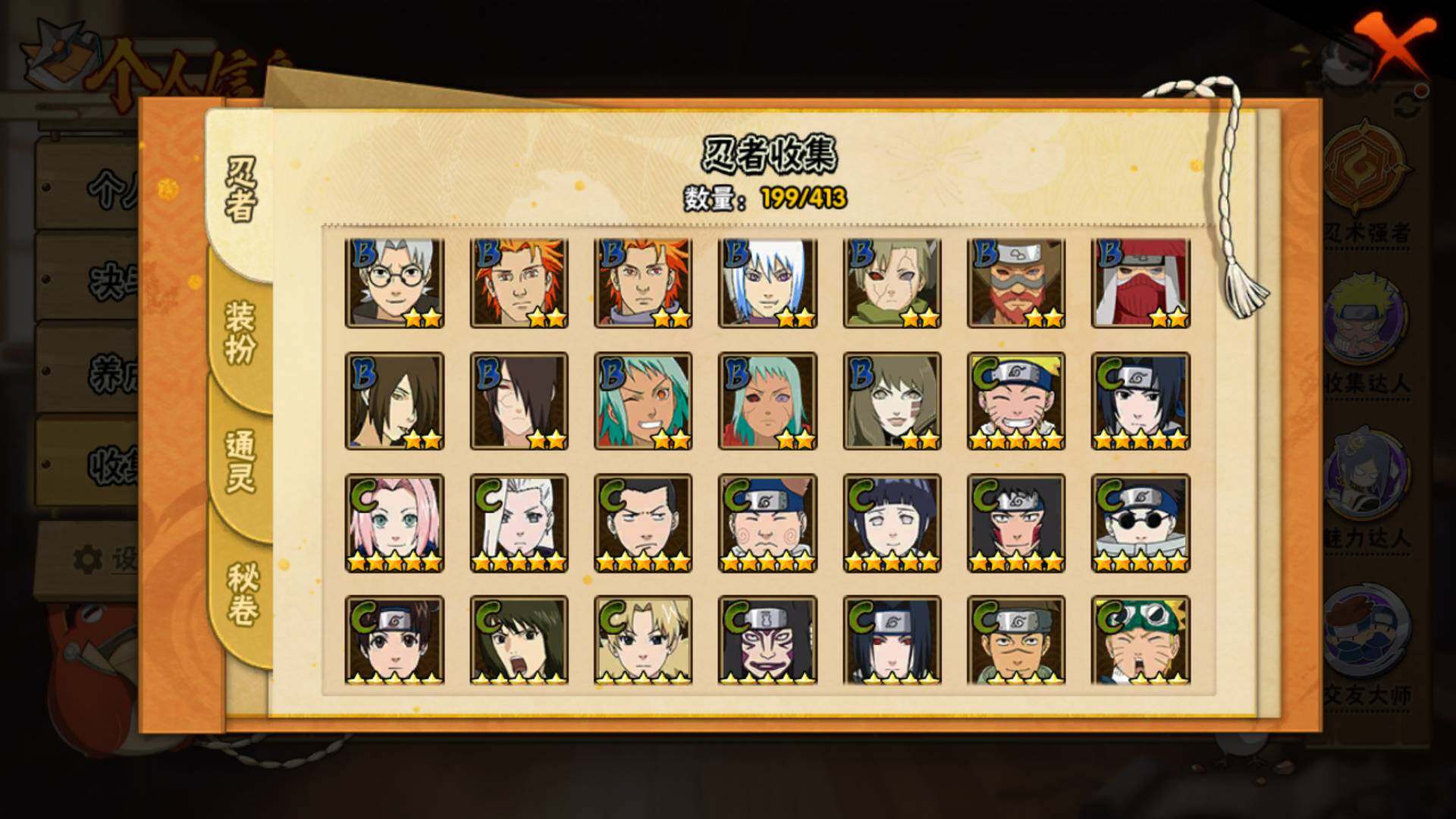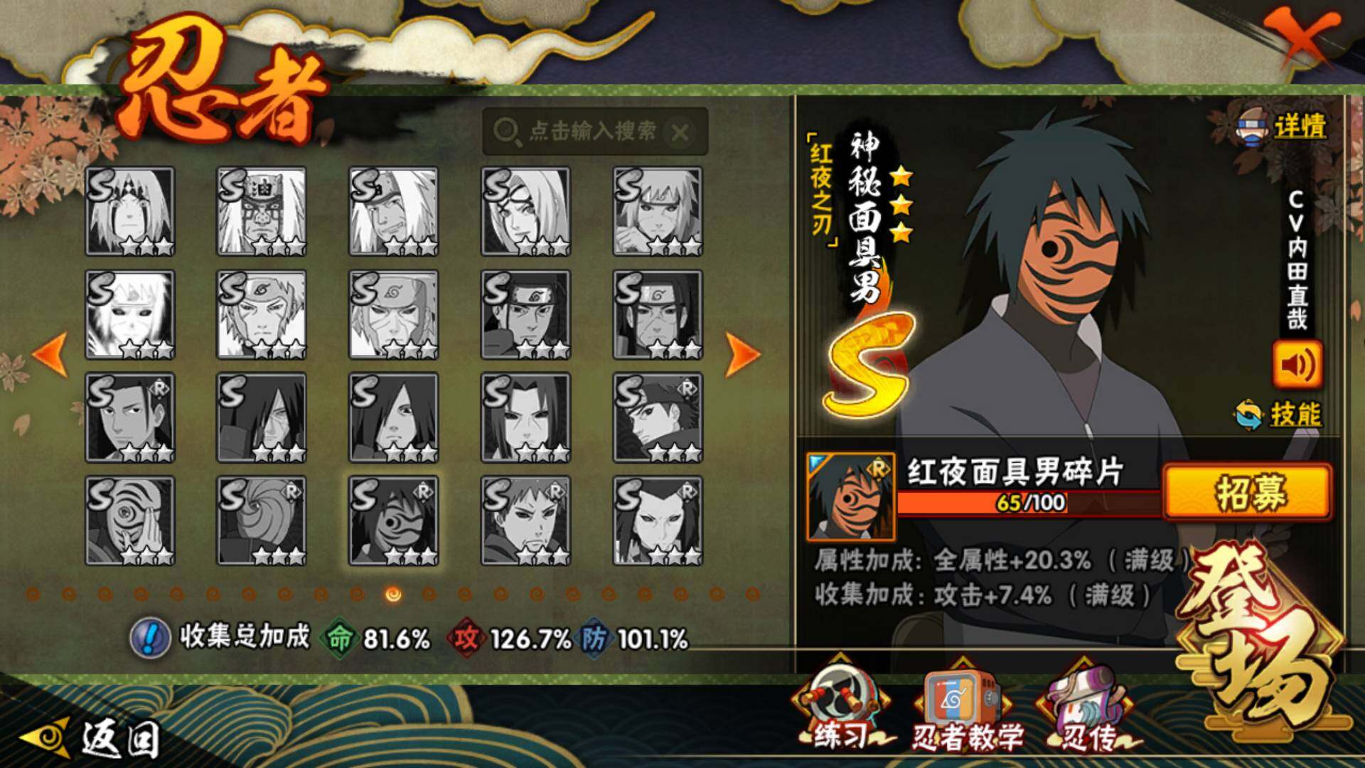 【S级忍者】:猿飞日斩「秽土转生」(3星),宇智波斑「秽土转生·解」(3星),宇智波带土「忍界大战」(3星),艾「忍界大战」(3星),宇智波鼬「须佐能乎」(3星),旗木卡卡西「须佐能乎」(3星),宇智波斑「木叶创立」(3星),自来也(3星),自来也「舞之豪