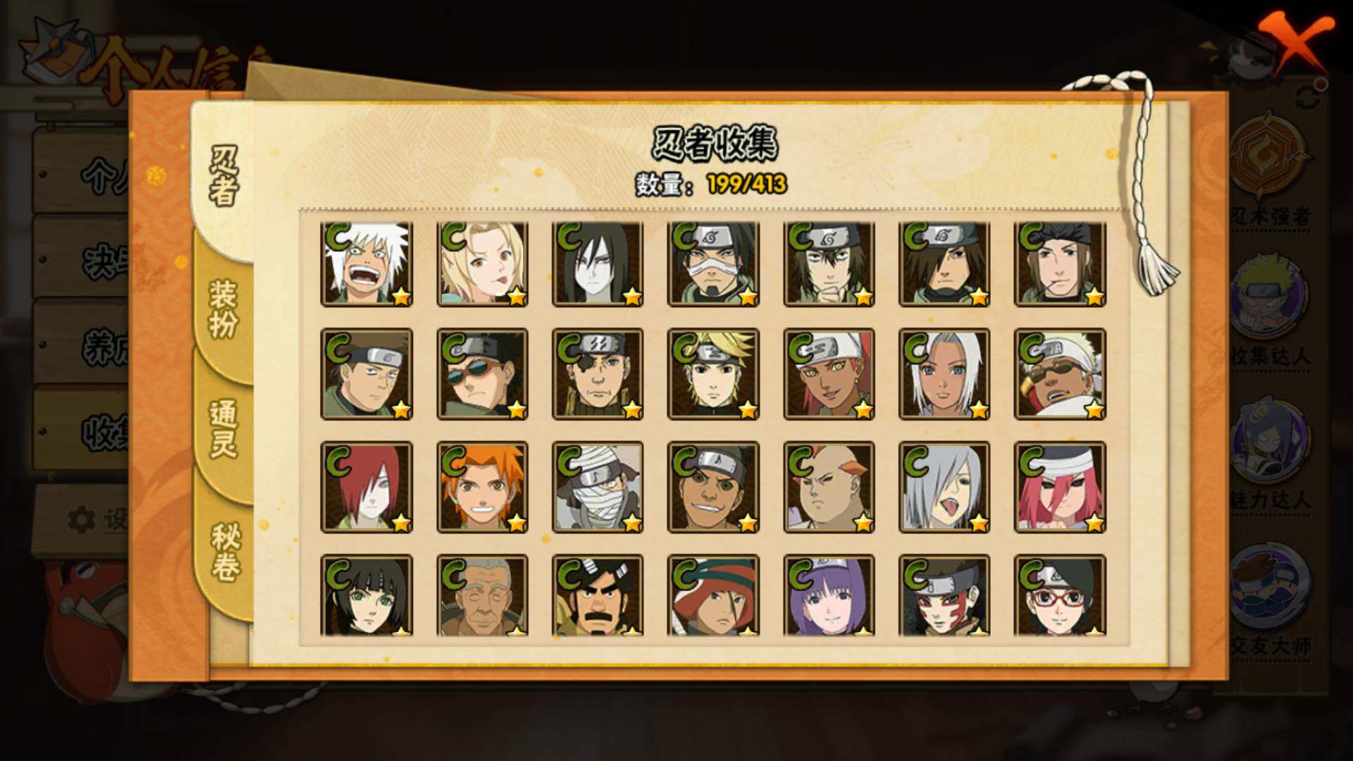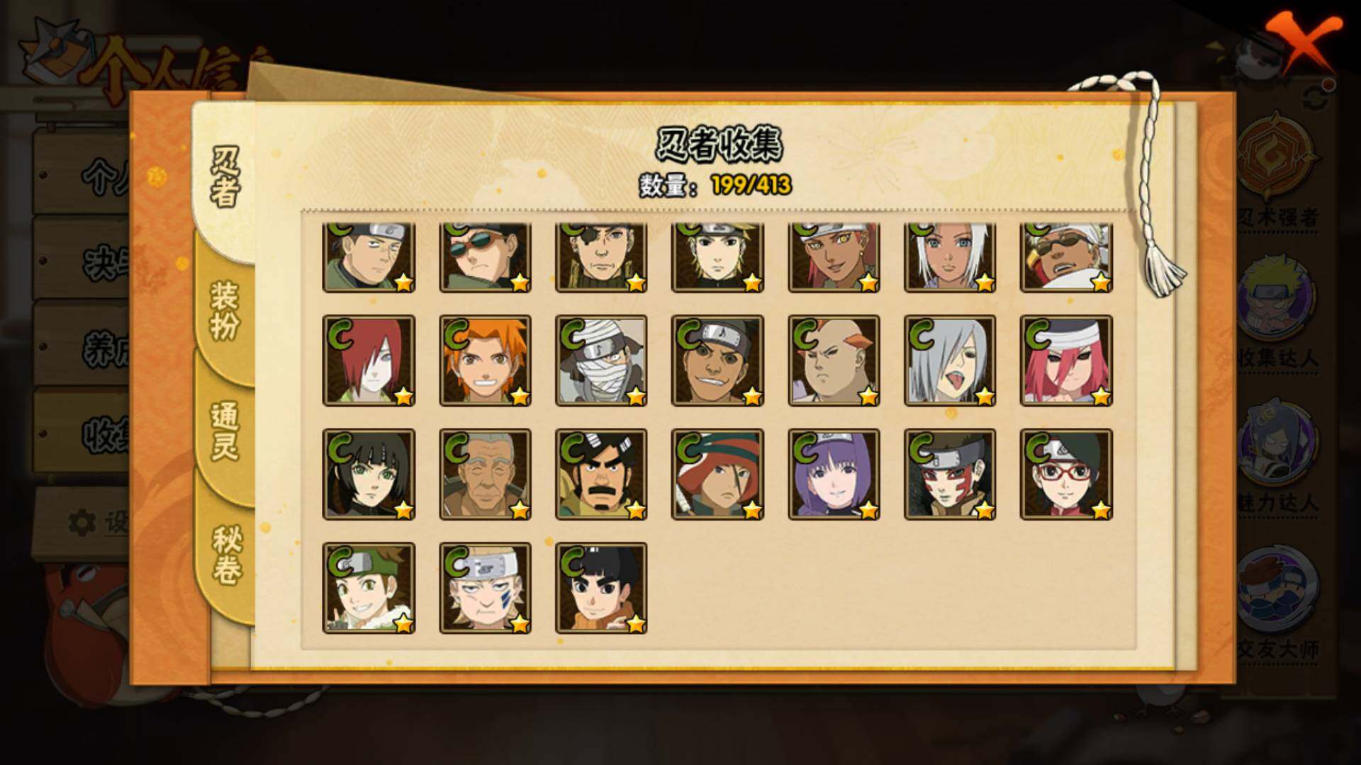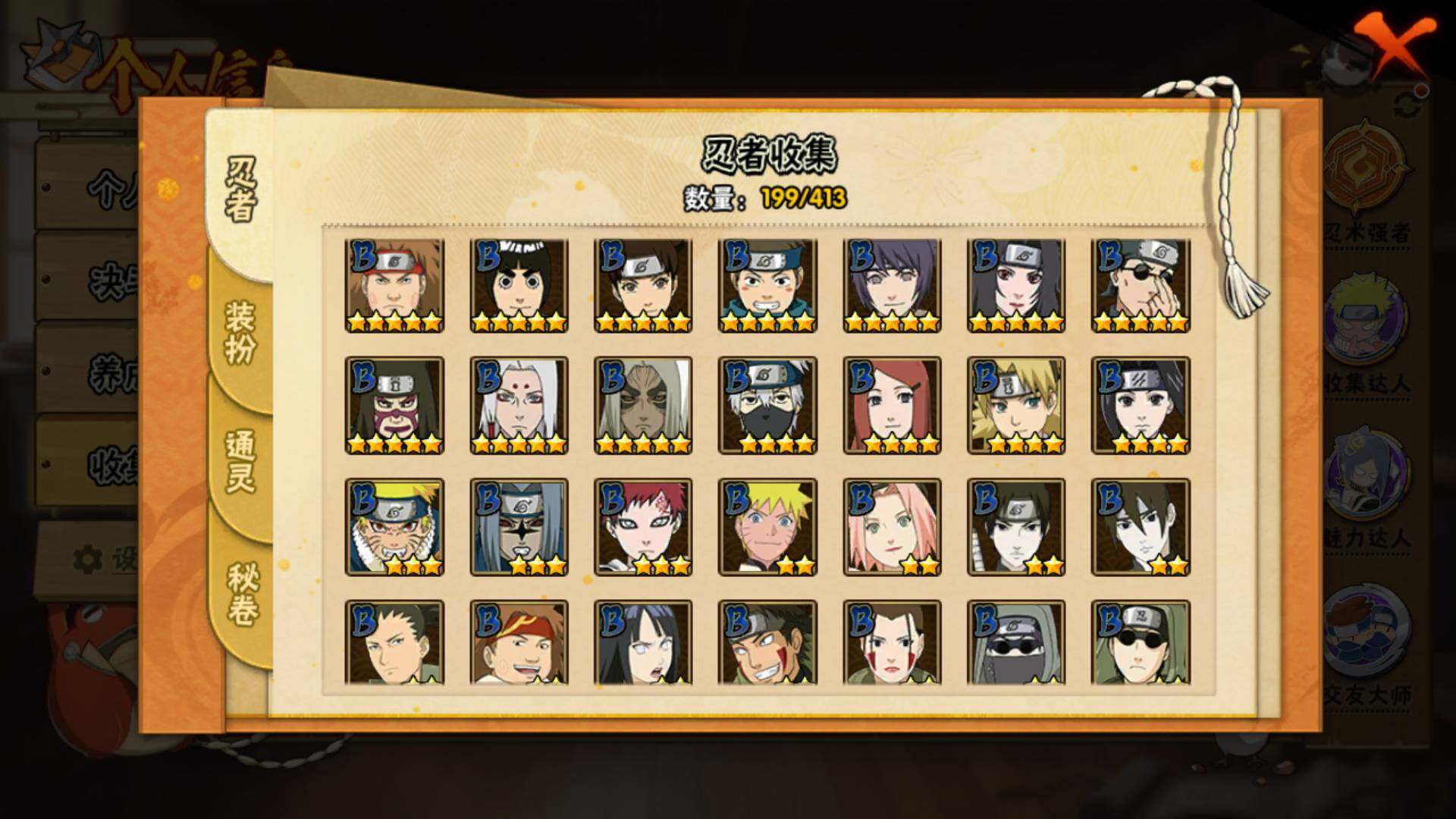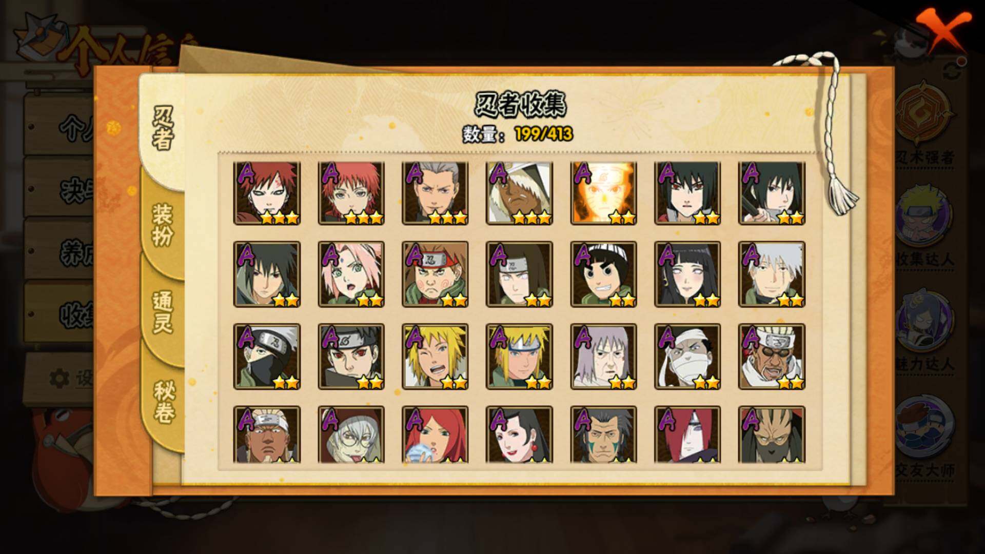 【S级忍者】:猿飞日斩「秽土转生」(3星),宇智波斑「秽土转生·解」(3星),宇智波带土「忍界大战」(3星),艾「忍界大战」(3星),宇智波鼬「须佐能乎」(3星),旗木卡卡西「须佐能乎」(3星),宇智波斑「木叶创立」(3星),自来也(3星),自来也「舞之豪