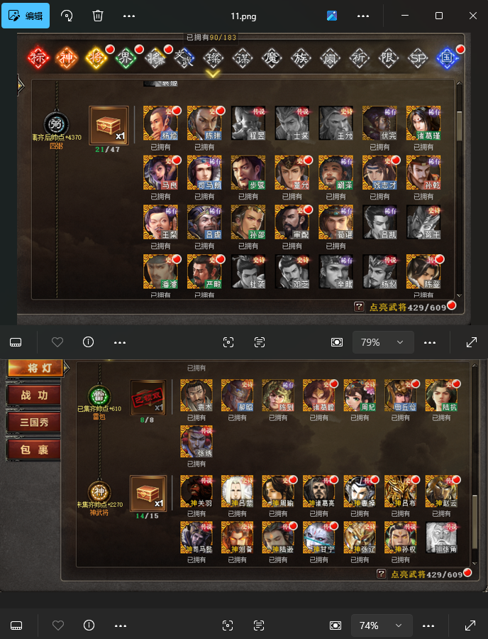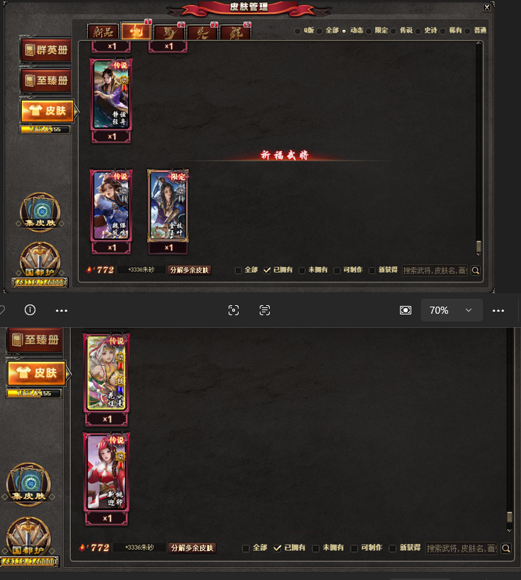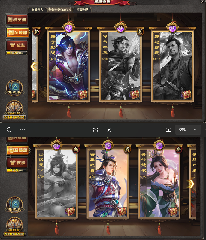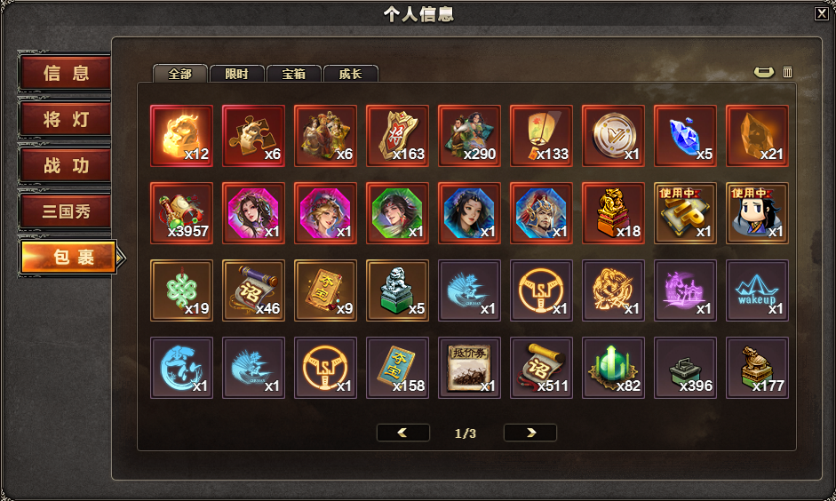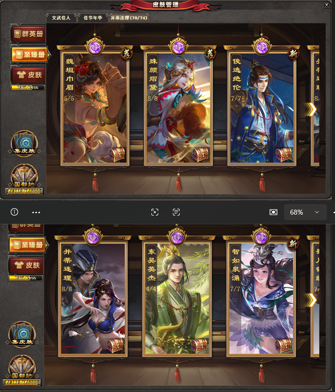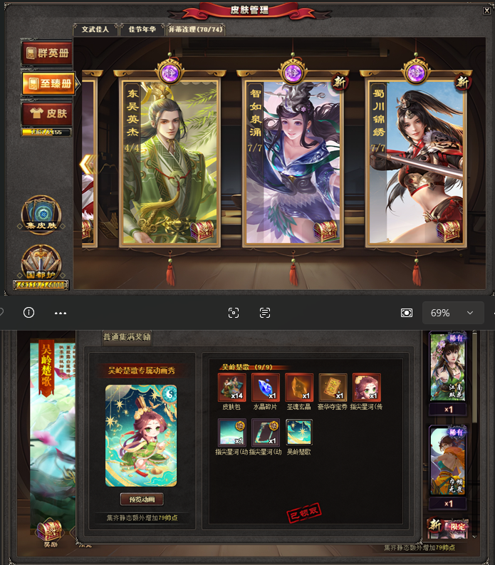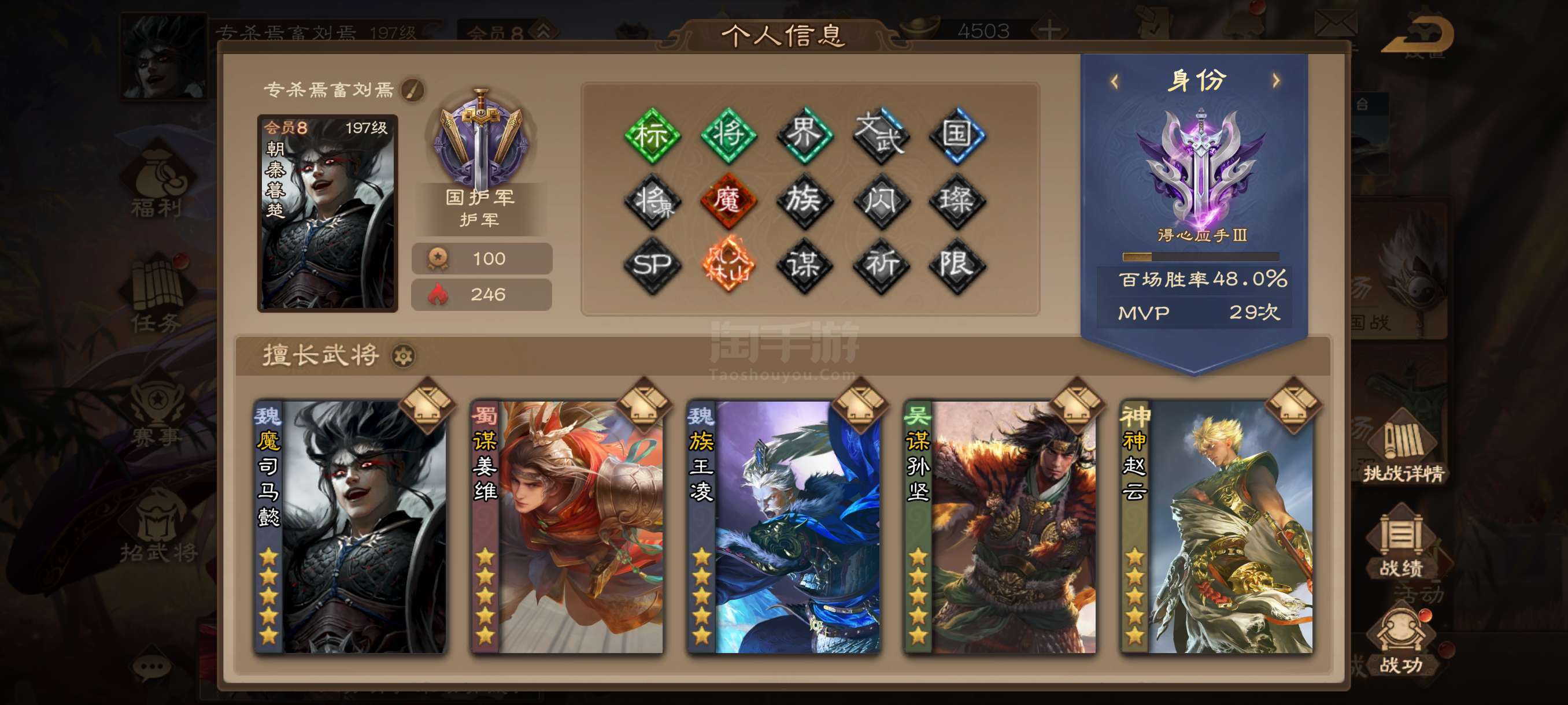 没时间玩也没氪了   近3年没有啥充值记录   都是老武将  出了 曹婴潘叔 王蓉  卢氏  清河公主  藤兰芳  杜夫人  陈登  神孙权  陈琳 杨婉  黄祖  丁原  司马微等  6000元宝  250多限定传说皮肤  150动态皮肤 三国秀传说册10多个  12个传说玉玺  130多个灯  不玩了