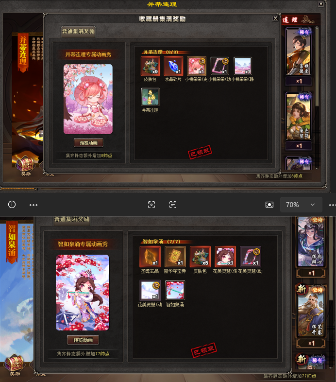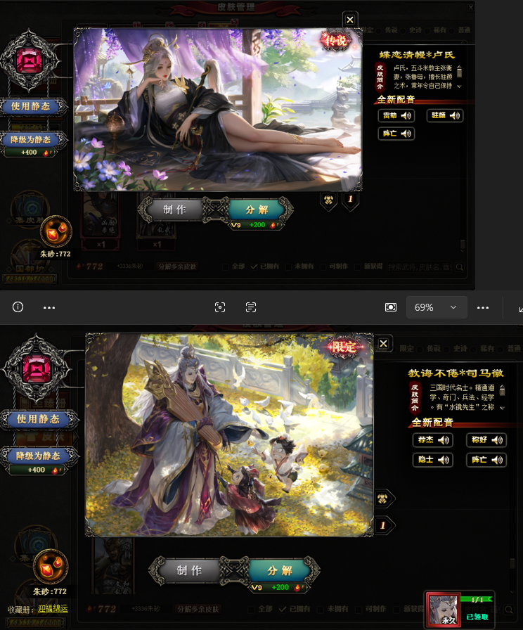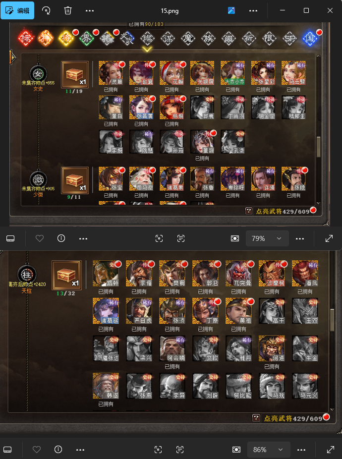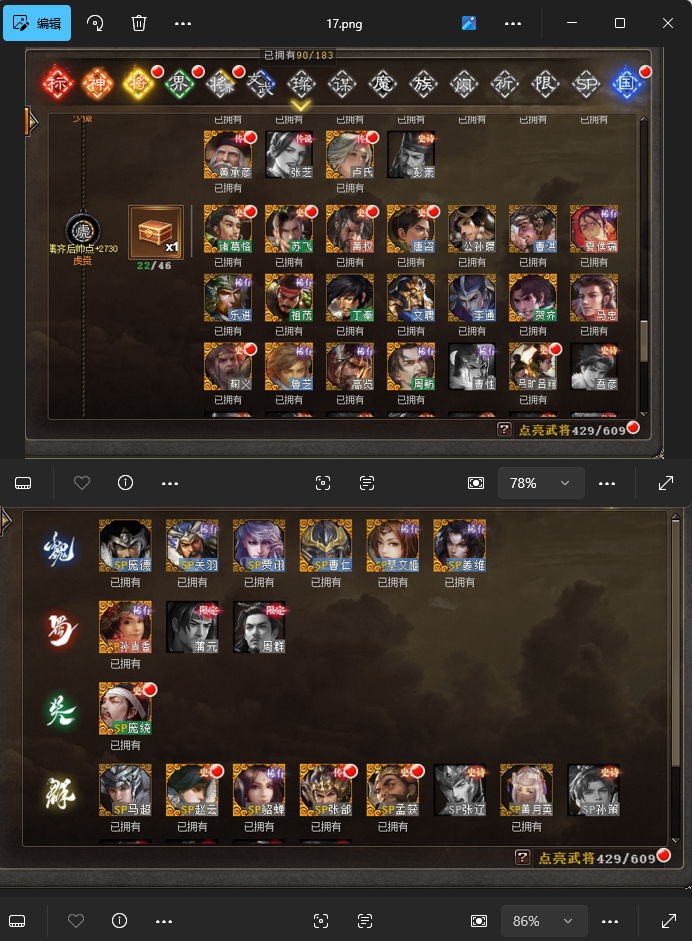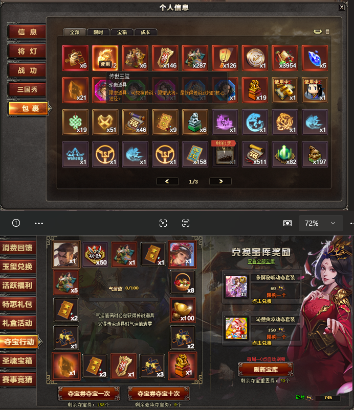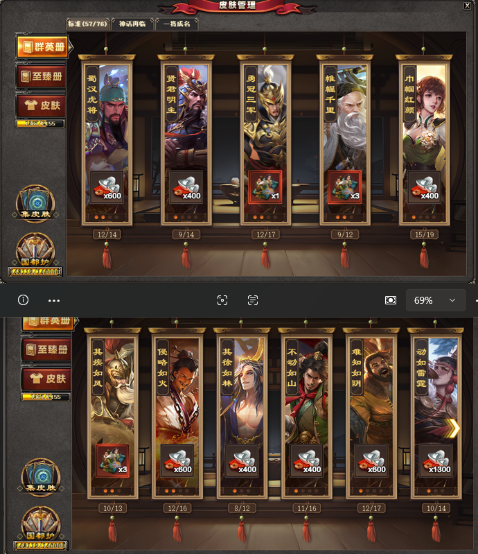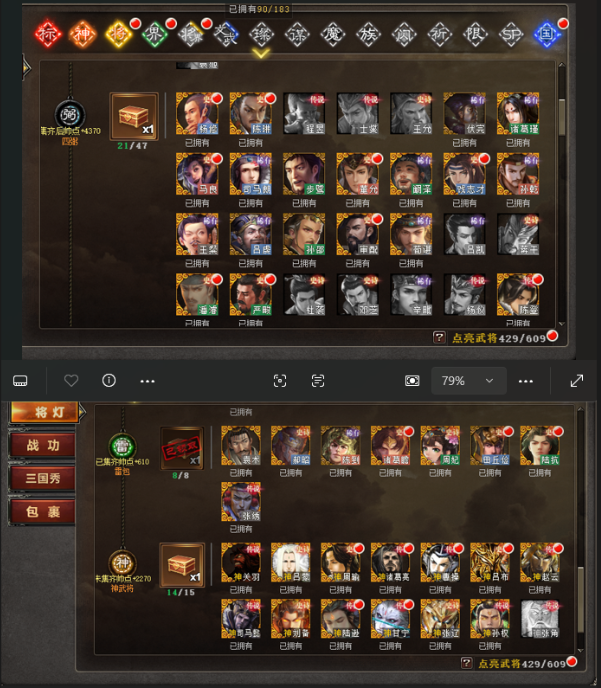 没时间玩也没氪了   近3年没有啥充值记录   都是老武将  出了 曹婴潘叔 王蓉  卢氏  清河公主  藤兰芳  杜夫人  陈登  神孙权  陈琳 杨婉  黄祖  丁原  司马微等  6000元宝  250多限定传说皮肤  150动态皮肤 三国秀传说册10多个  12个传说玉玺  130多个灯  不玩了