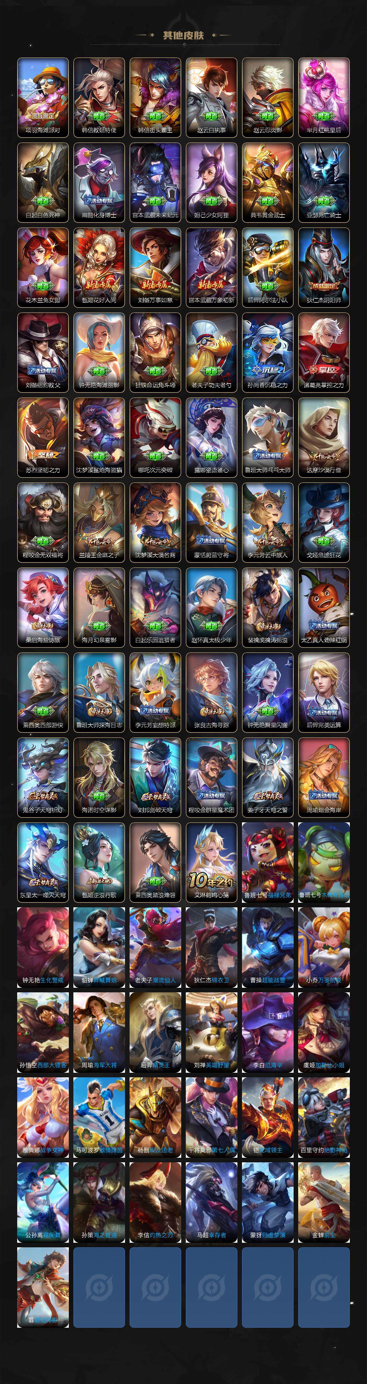 【限定皮肤】:姜子牙天穹之誓,李白谪仙醉月,狄仁杰阴阳师,赵云皇家上将,赵云龙胆,元歌无心,狄仁杰魔术师,达摩沙