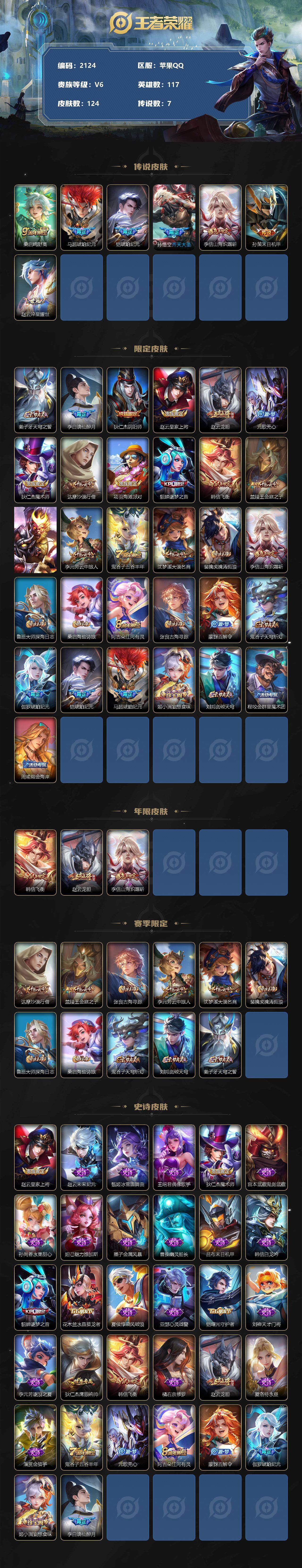 营地账号:1722362757/1528686 王者荣耀账号 苹果Q-V6-至尊星耀I段位-117英雄-124皮肤-0典藏-0珍品无双-0无双-0珍品传说-7传说-32史诗