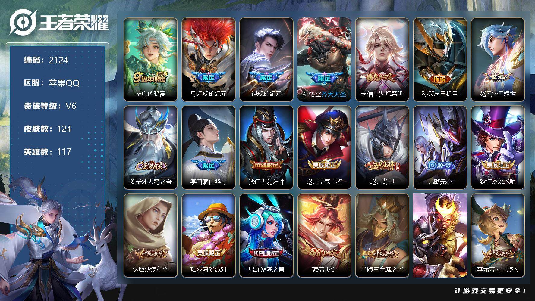 王者荣耀【苹果QQ】1528686 王者荣耀账号 苹果Q-V6-至尊星耀I段位-117英雄-124