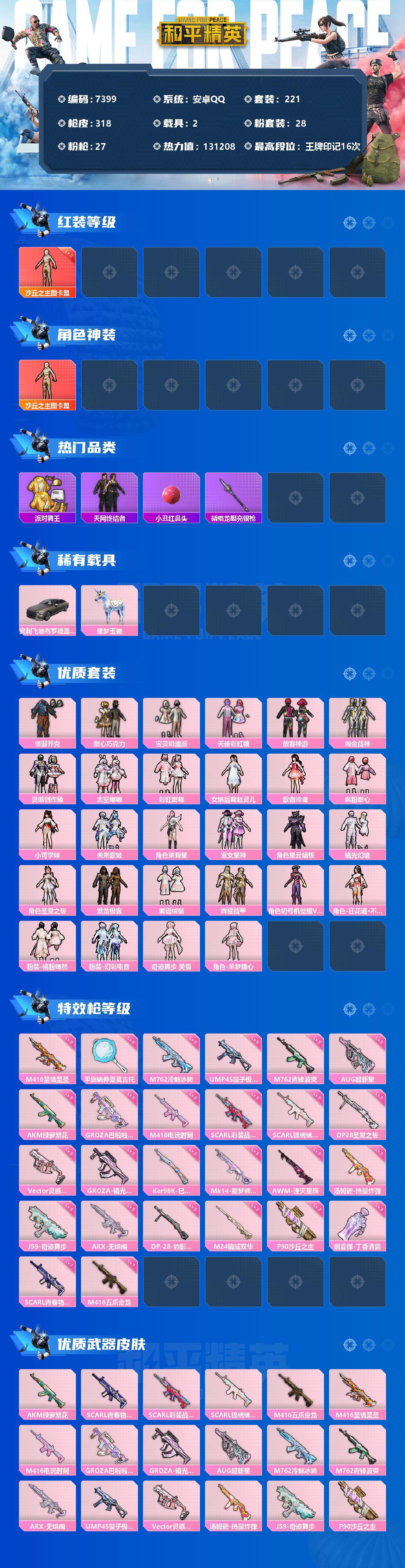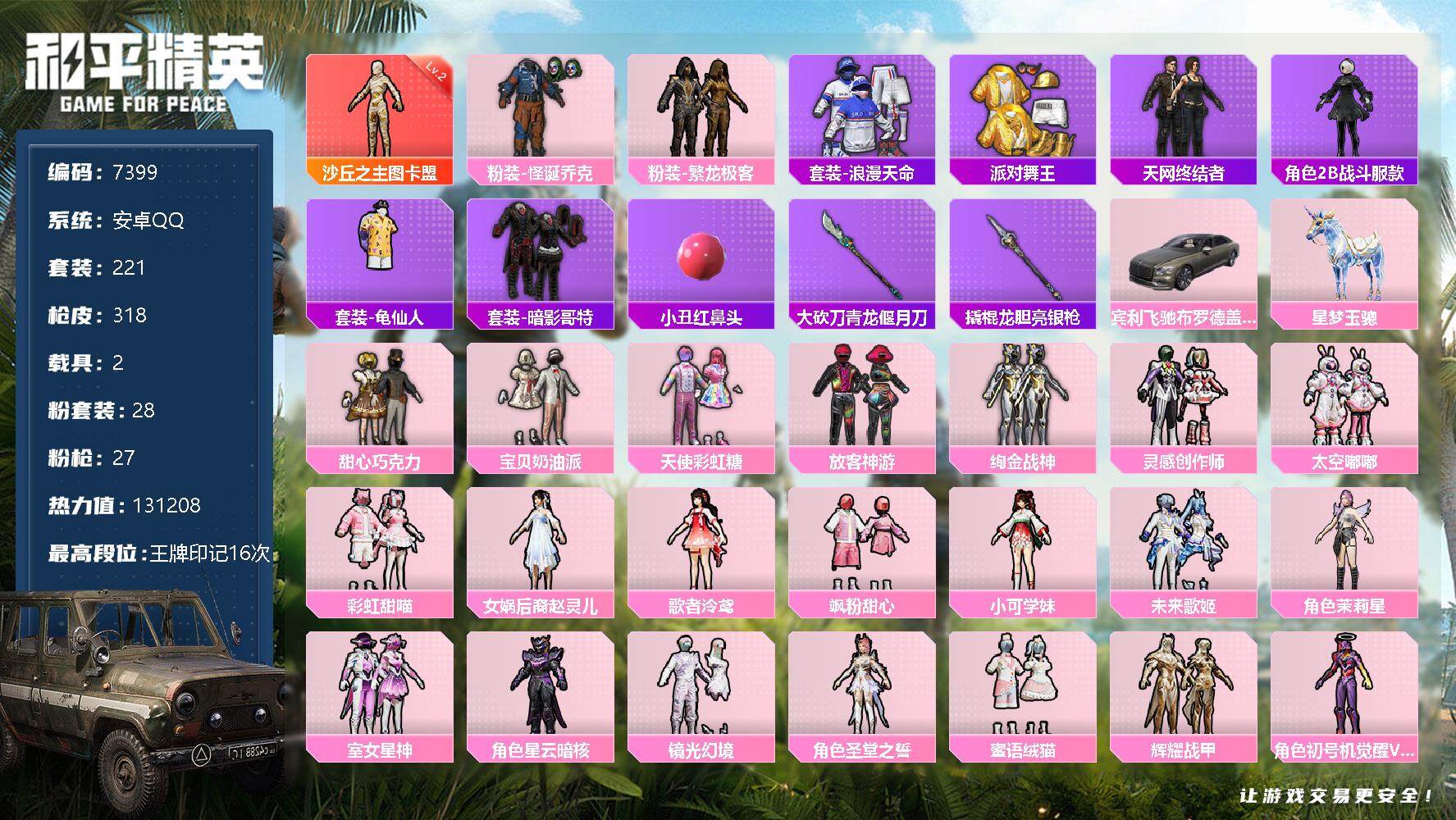和平精英【安卓QQ】【7399】28粉装-27特效枪-2载具-131178热力值-16印记-221
