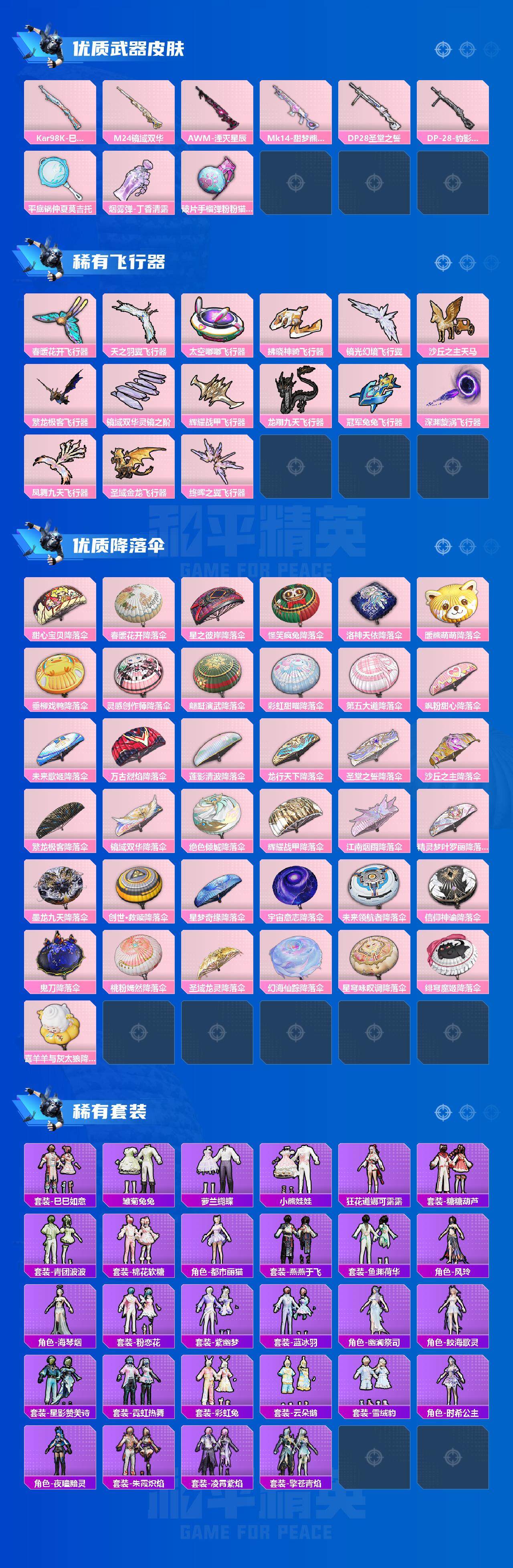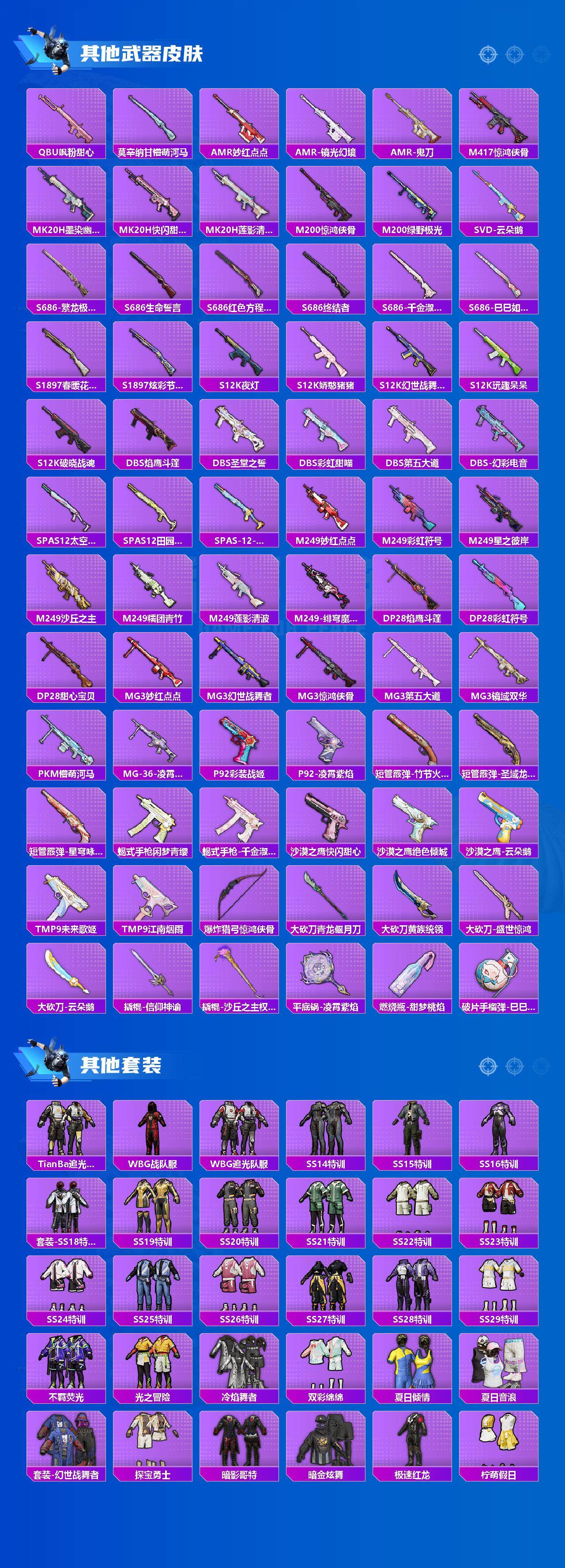 【7399】28粉装-27特效枪-2载具-131178热力值-16印记-221套装-318枪皮【红色神装等级】:二级沙丘之主-图卡盟【红色角色神装】:沙丘之主-图卡盟【热门品类】:派对舞王,天网终结者【粉色套装】:怪诞乔克,甜心巧克力,女娲后裔-赵灵儿,初号机 觉醒Ver.【粉色枪皮等级】:九级M416-至情至圣