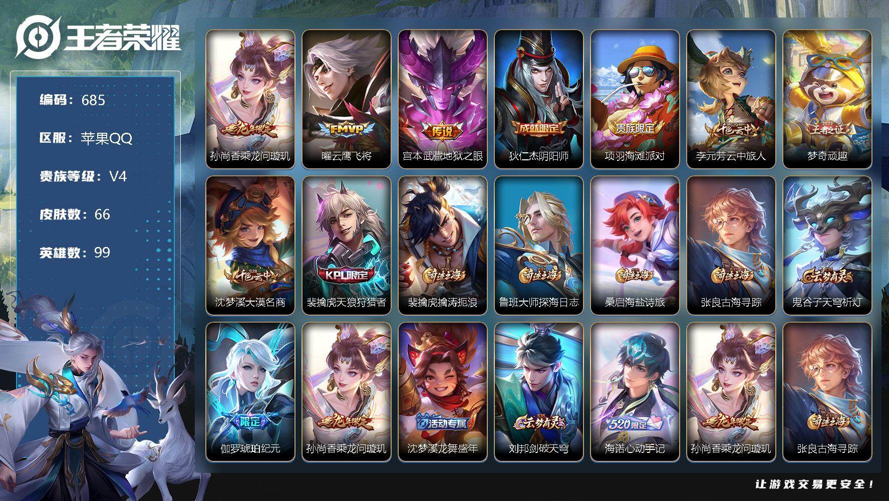 王者荣耀【苹果QQ】51段发育路4金标 苹果Q-V4-99英雄-66皮肤-3传说-18史诗
