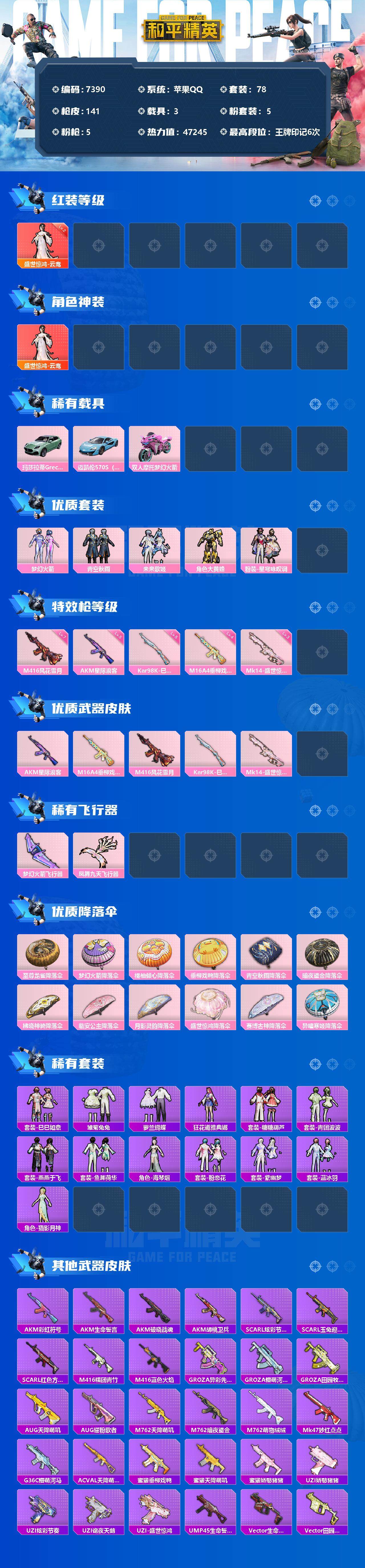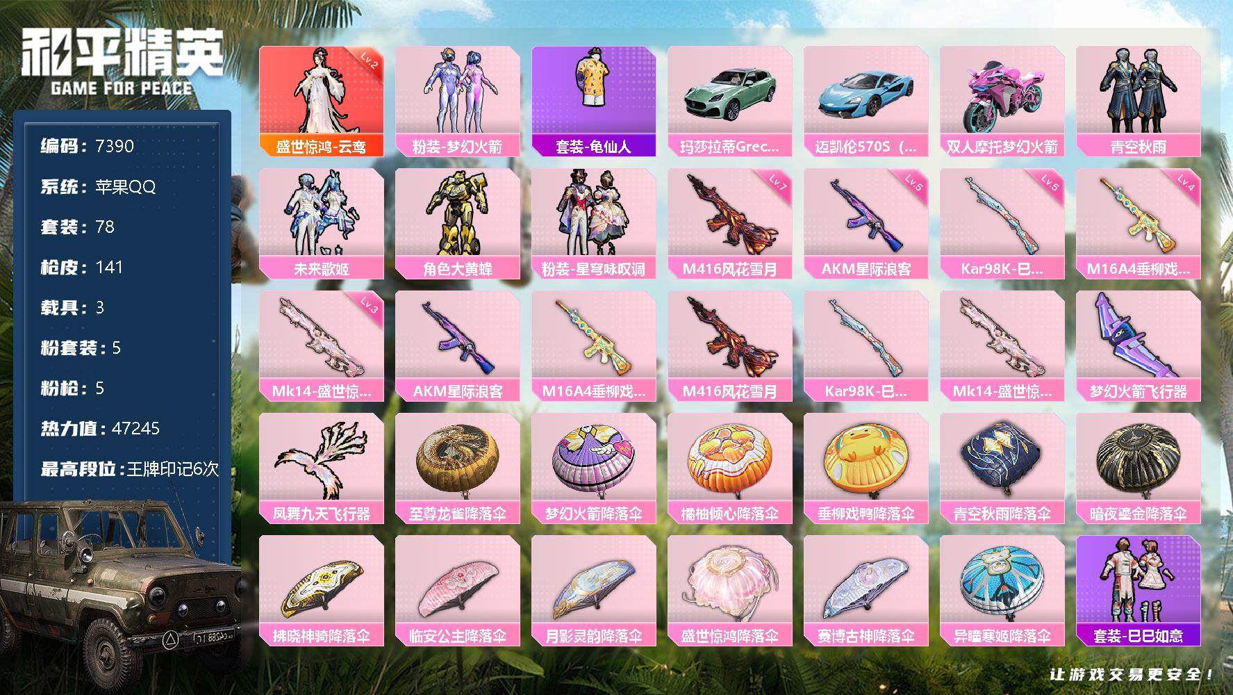 和平精英【苹果QQ】【7390】5粉装-5特效枪-3载具-47245热力值-6印记-78套装-14