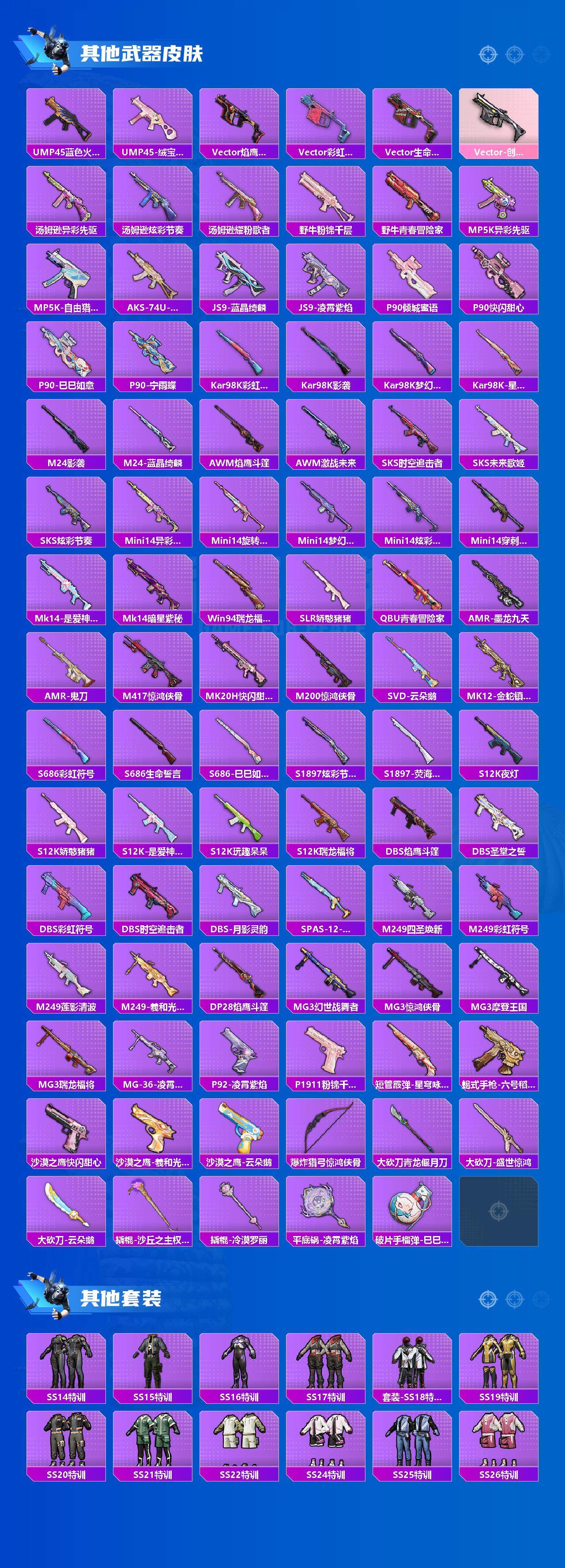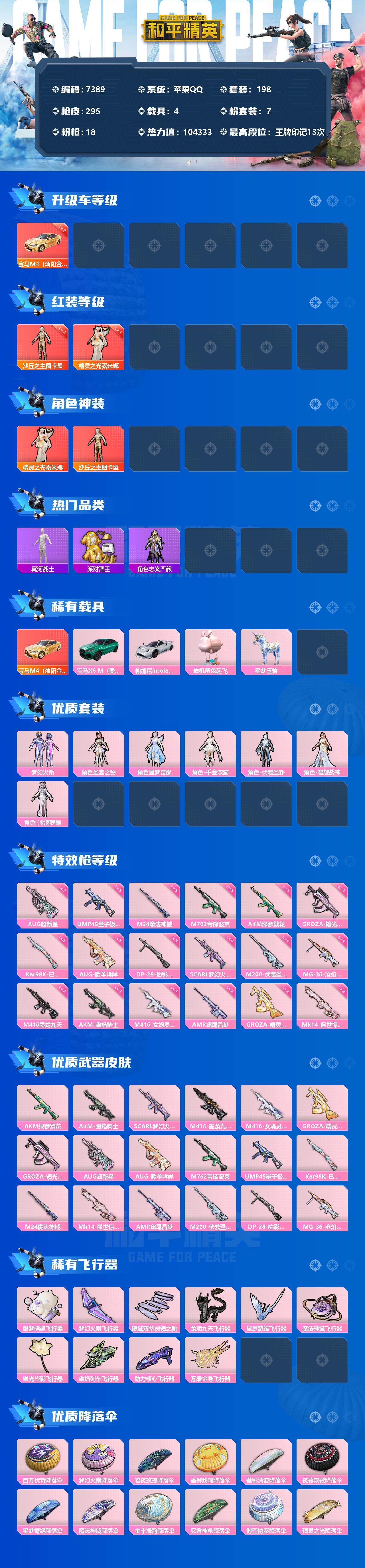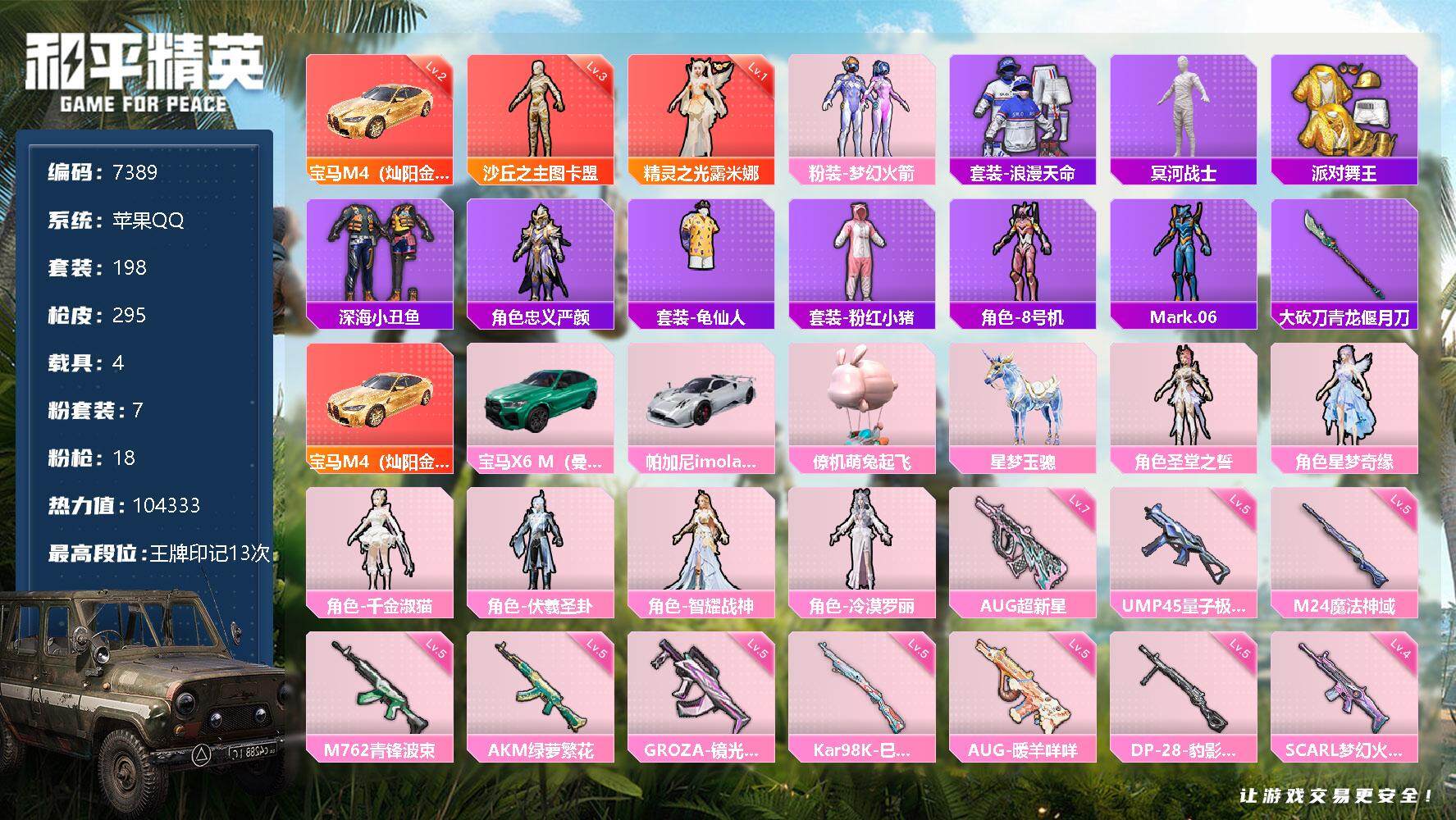 和平精英【苹果QQ】【7389】7粉装-18特效枪-4载具-104333热力值-13印记-198套