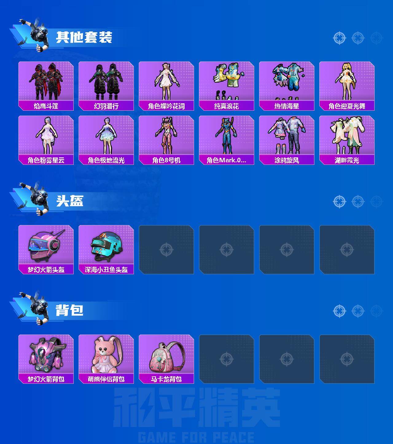 【7389】7粉装-18特效枪-4载具-104333热力值-13印记-198套装-295枪皮【红色载具】:二级宝马M4(灿阳金)【红色神装等级】:一级精灵之光-露米娜,三级沙丘之主-图卡盟【红色角色神装】:沙丘之主-图卡盟,精灵之光-露米娜【热门品类】:冥河战士,派对舞王【粉色套装】:梦幻火箭【稀有背包】:萌熊伴侣背包