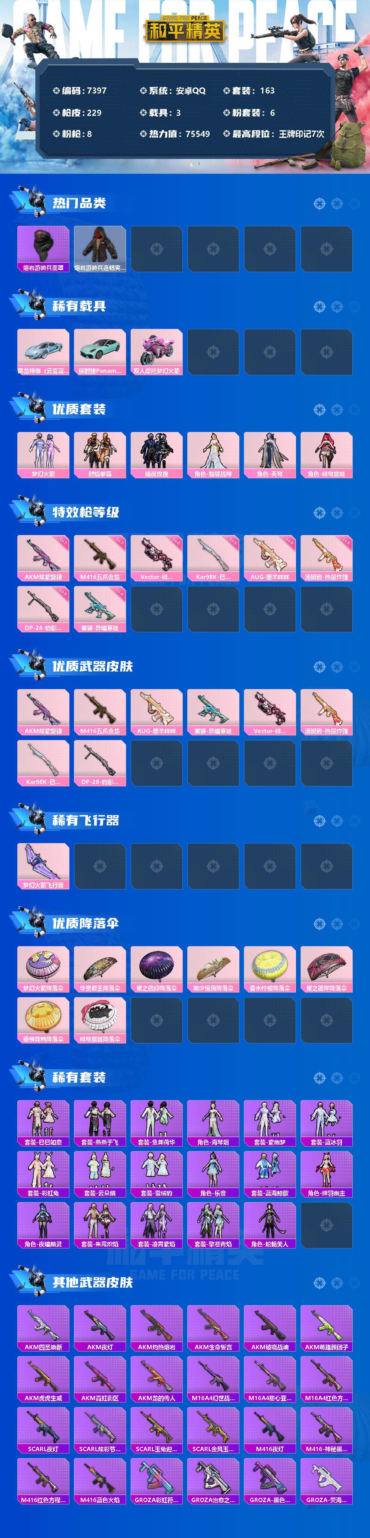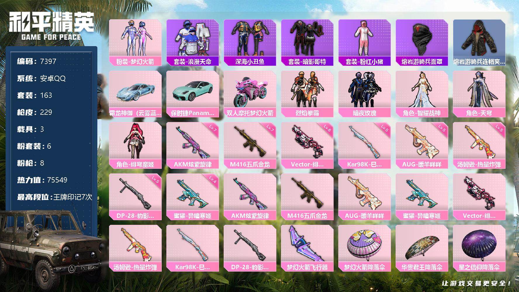 和平精英【安卓QQ】【7397】6粉装-8特效枪-3载具-75549热力值-7印记-163套装-2