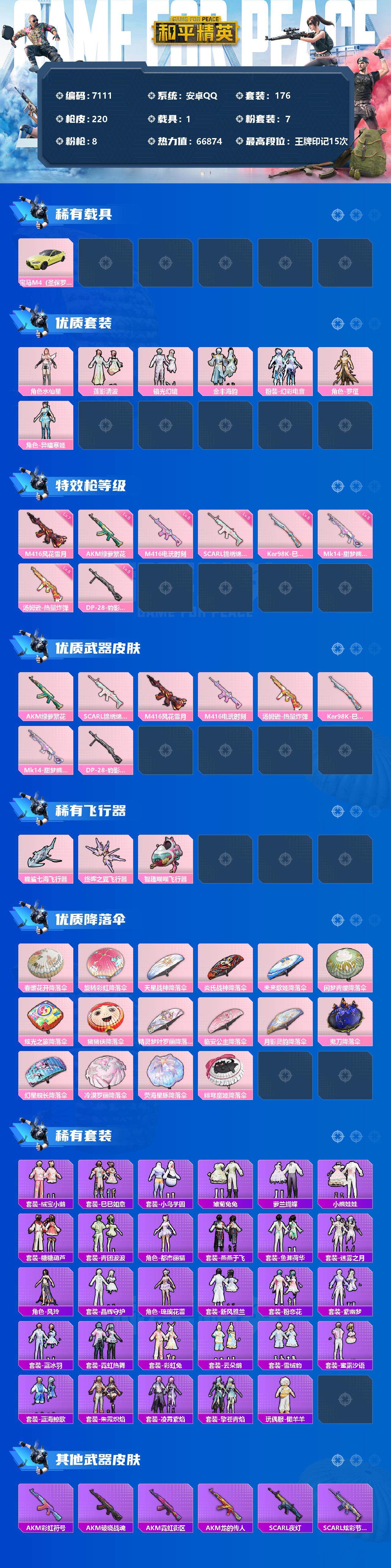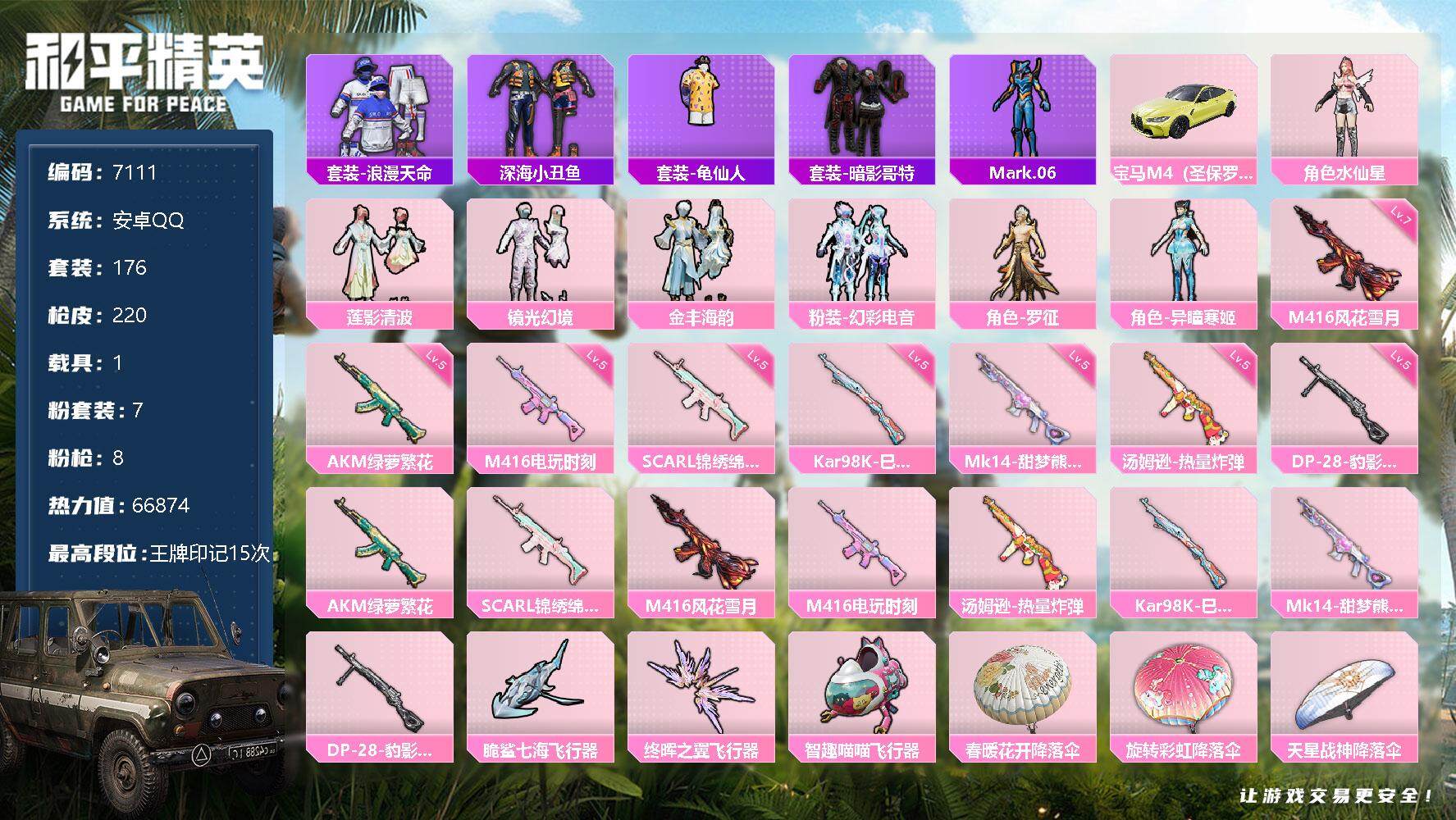 和平精英【安卓QQ】【7111】7粉装-8特效枪-1载具-66540热力值-15印记-176套装-