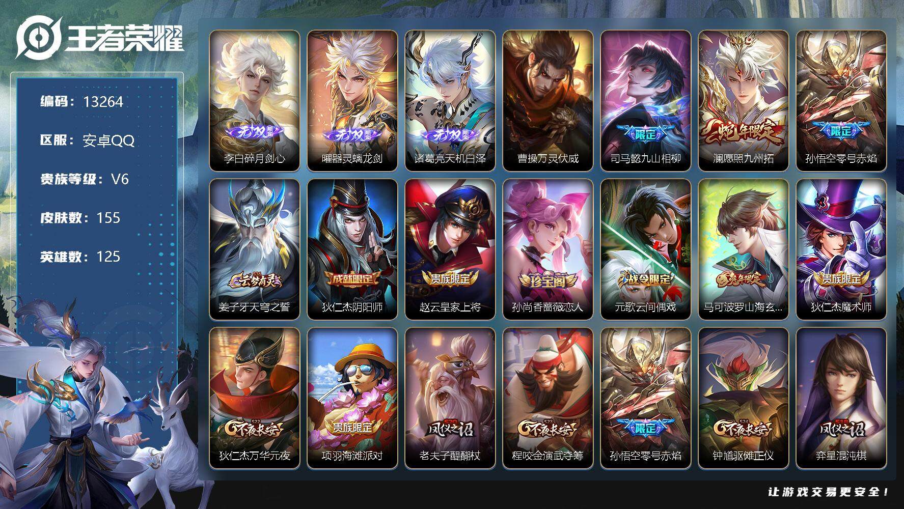 营地账号:1718376458/可换绑【诸葛亮曜李白三无双 曹操新传说 蛇年限定】 5495星币 8按键 5王者印记 五级铭文150 kk3771 可二次 安卓Q-V6-155皮肤-3无双-4传说-35史诗【无双皮肤】:李白碎月剑心,曜器灵螭龙剑,诸葛亮天机白泽【传说皮肤】:曹操万灵伏威,司马懿九山相柳,澜愿照九州拓,孙悟空零号赤焰【限定皮肤】:姜子牙天穹之誓,狄仁杰阴阳师,赵云皇家上将,孙尚香