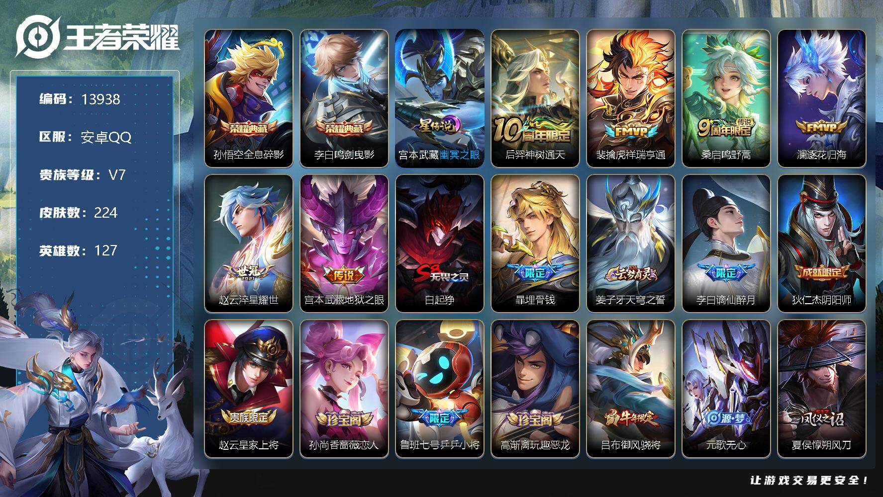 营地账号:1726895190/可换绑【性价比优质号 双典藏】13按键 1星传说,4王者印记,五级铭文230,可二次kk4072,安卓Q-V7-224皮肤-2典藏-6传说-63史诗【英雄全皮】:空空儿全皮【荣耀典藏】:孙悟空全息碎影,李白鸣剑曳影【星元皮肤】:宫本武藏幽冥之眼【传说皮肤】:后羿神树通天,裴擒虎祥瑞亨通,桑启鸣野蒿,澜逐花归海,赵云淬星耀世,宫本武藏地狱之眼【限定皮肤】:白起狰,暃