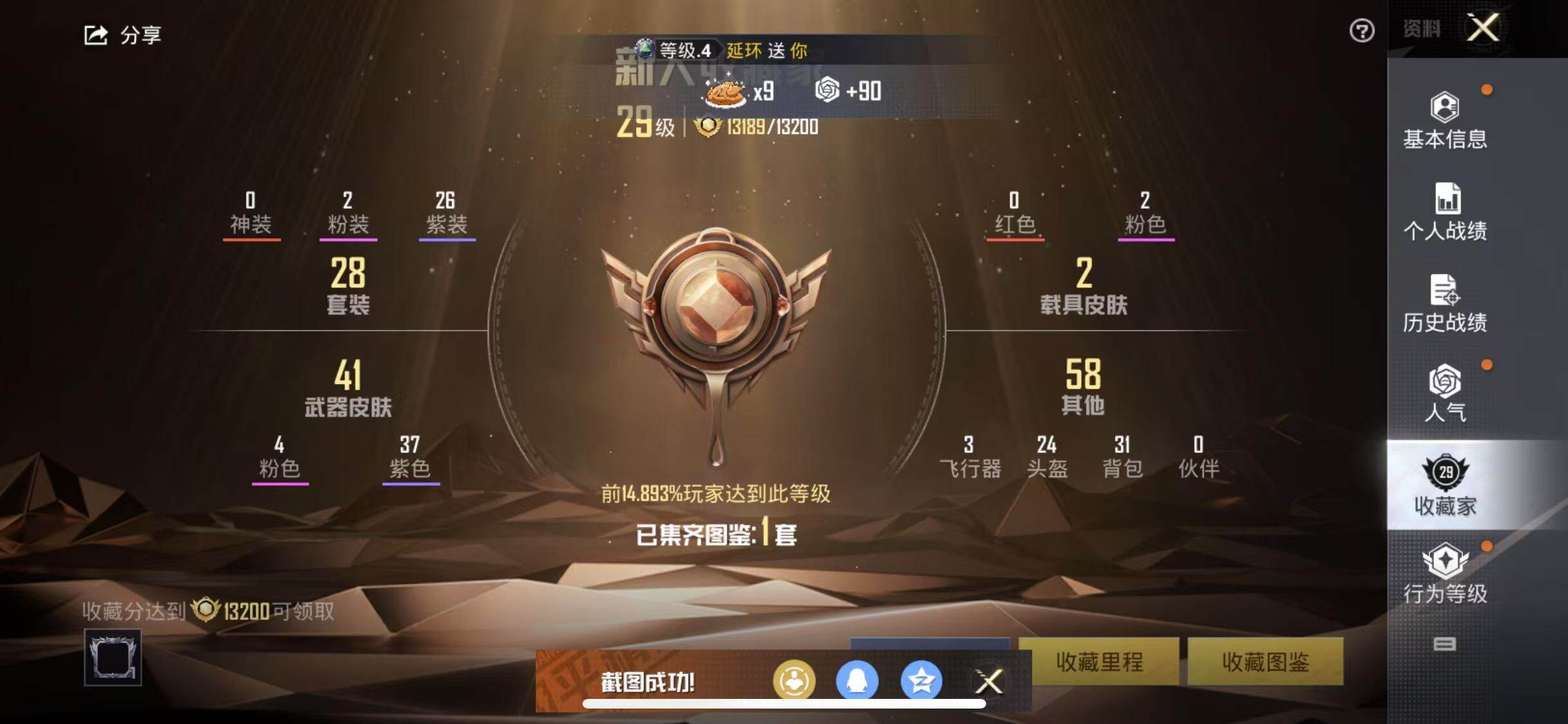 苹果 手Q-2粉装-4特效枪-2载具-1粉色飞行器-16199热力值-3王牌印记-28套装-49枪皮