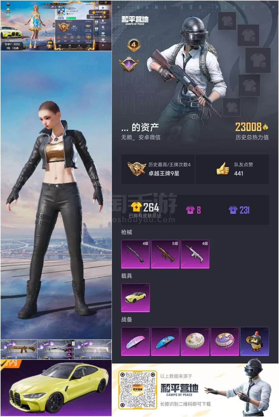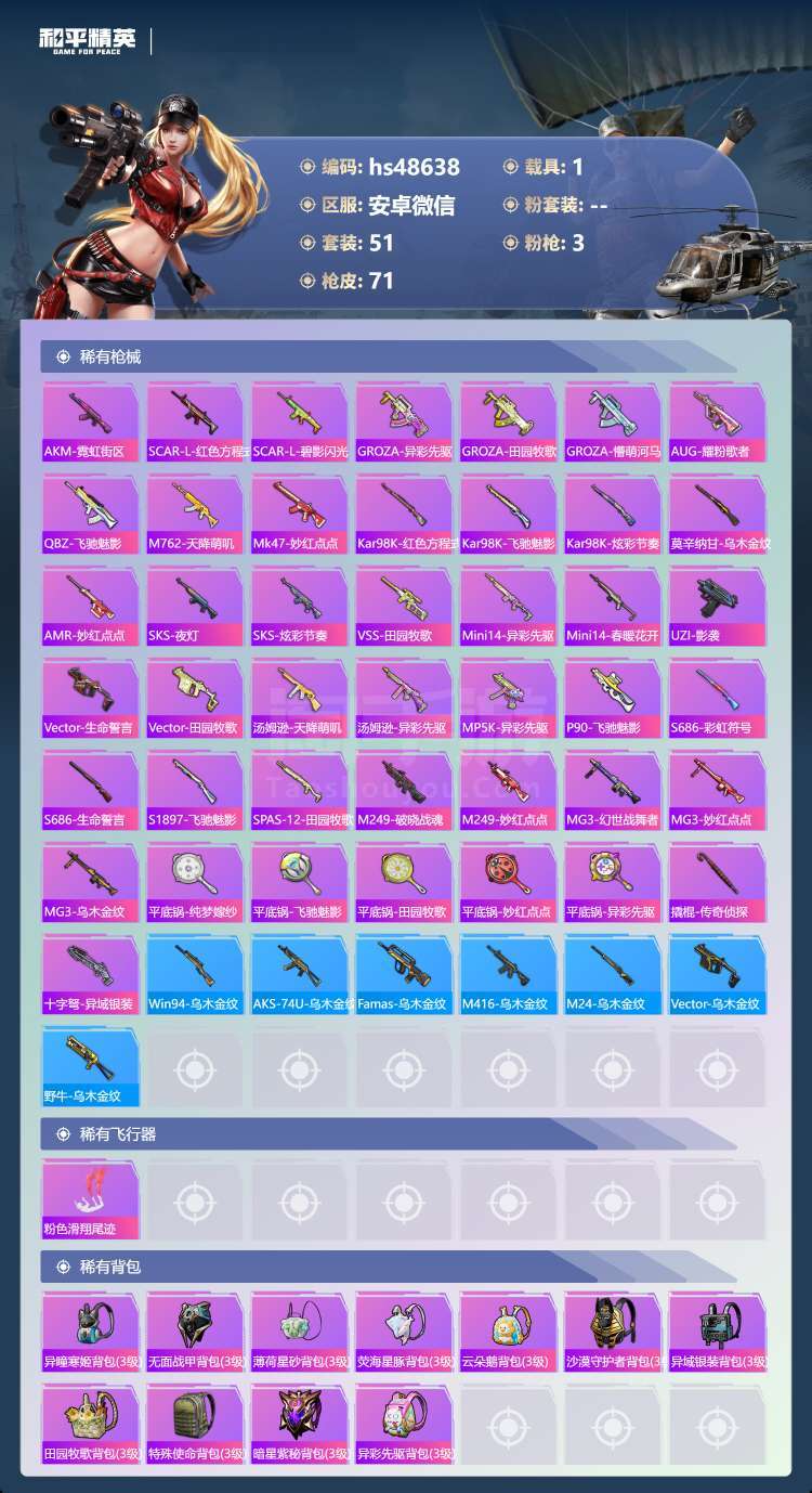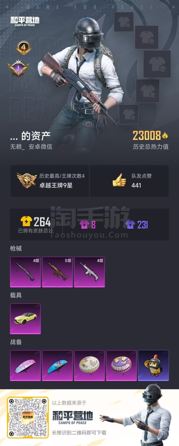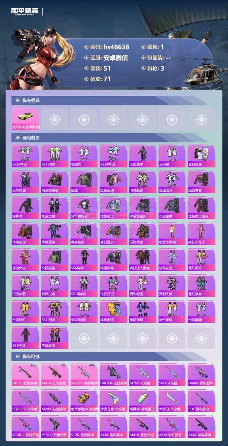 和平精英【安卓微信】hs48638 安卓v-4王牌印记-3特效枪-1载具-23128热力值-51套装-71枪皮-1卓越