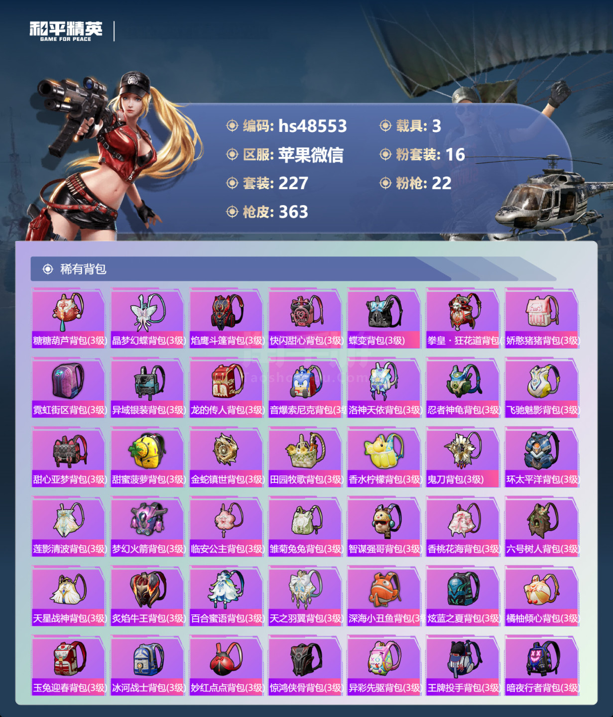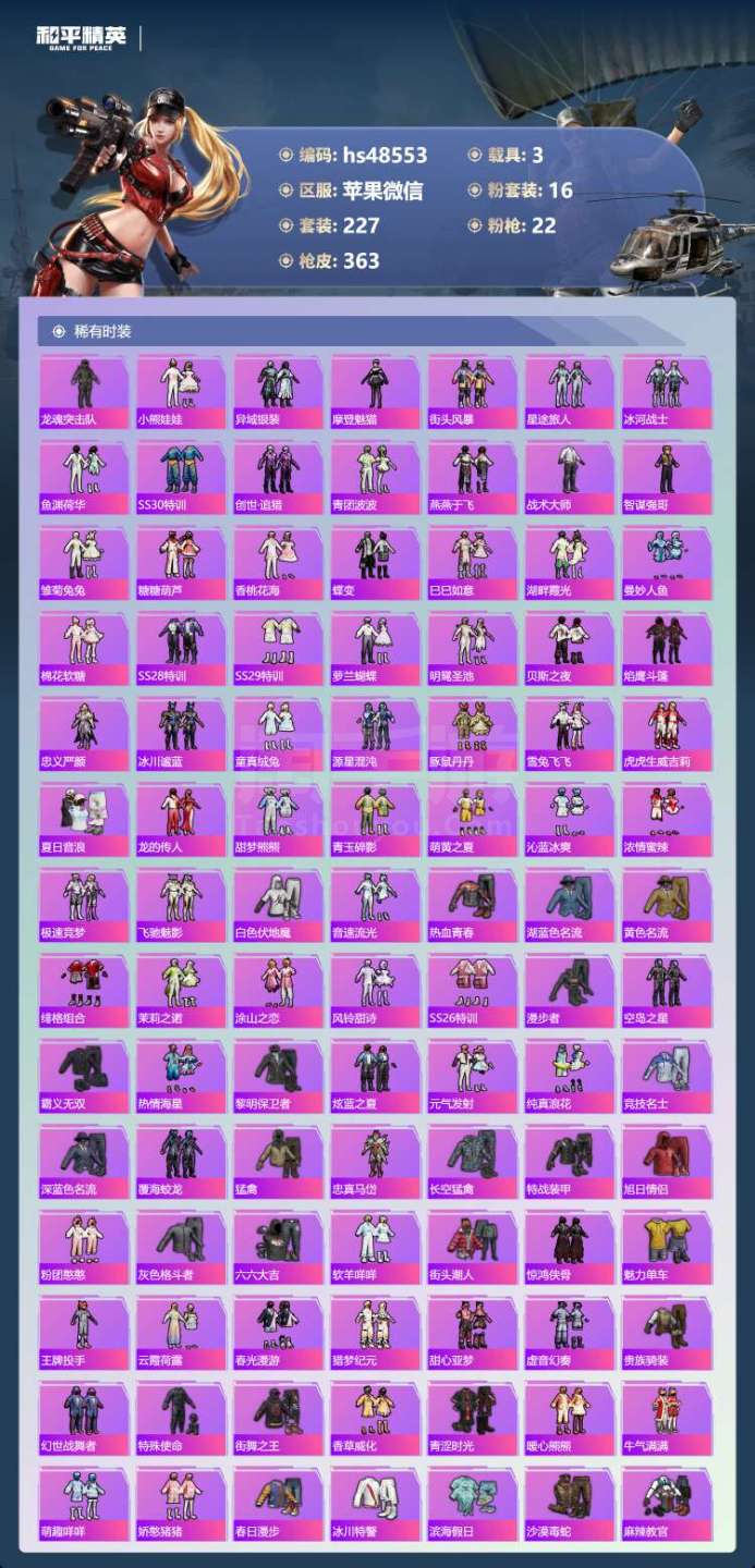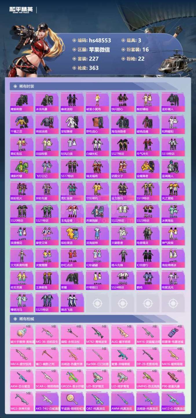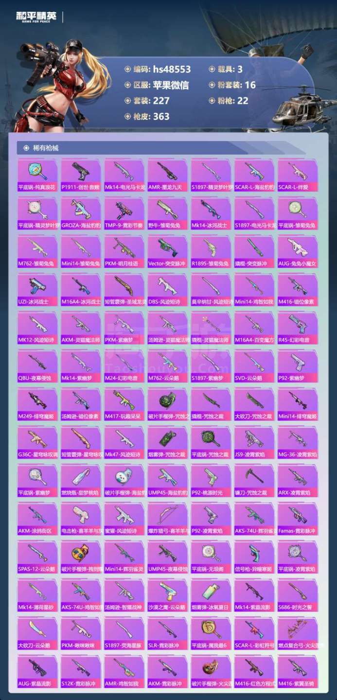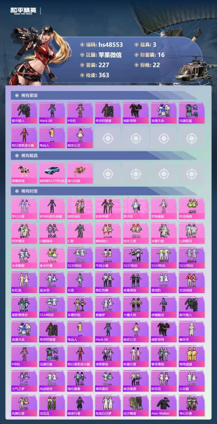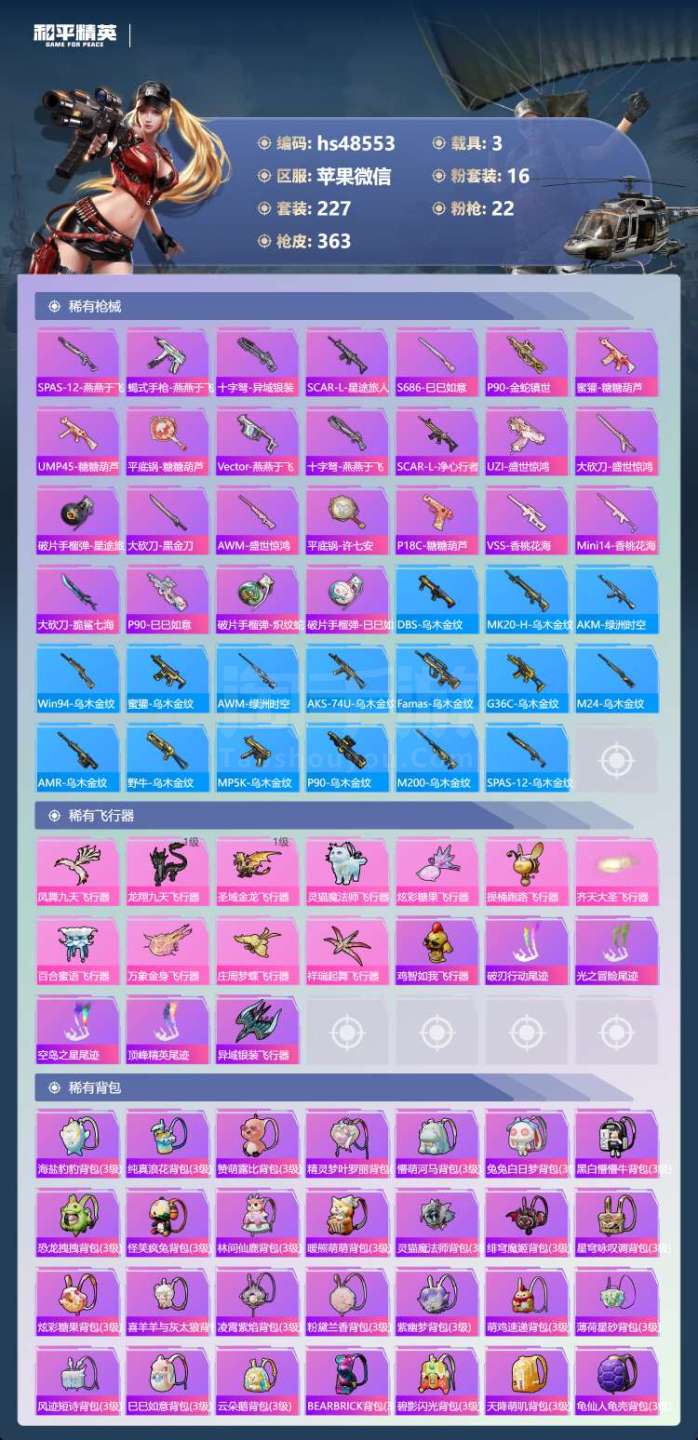 hs48553 苹果微-19王牌印记-16粉装-22特效枪-3载具-130158热力值-227套装