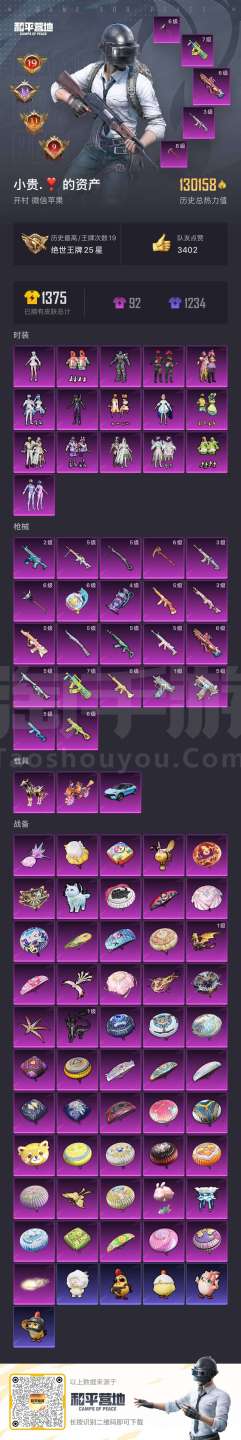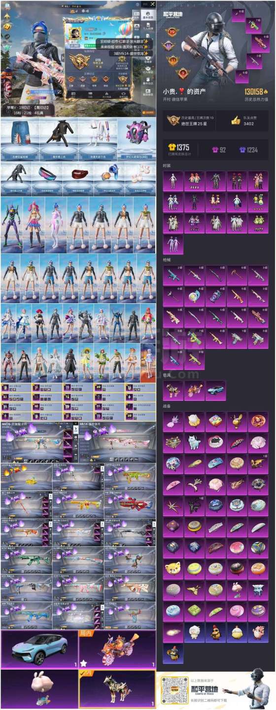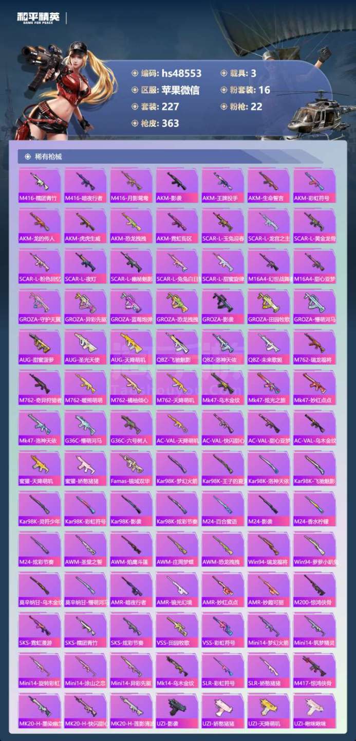 和平精英【苹果微信】hs48553 苹果v-19王牌印记-16粉装-22特效枪-3载具-130158热力值-227套装