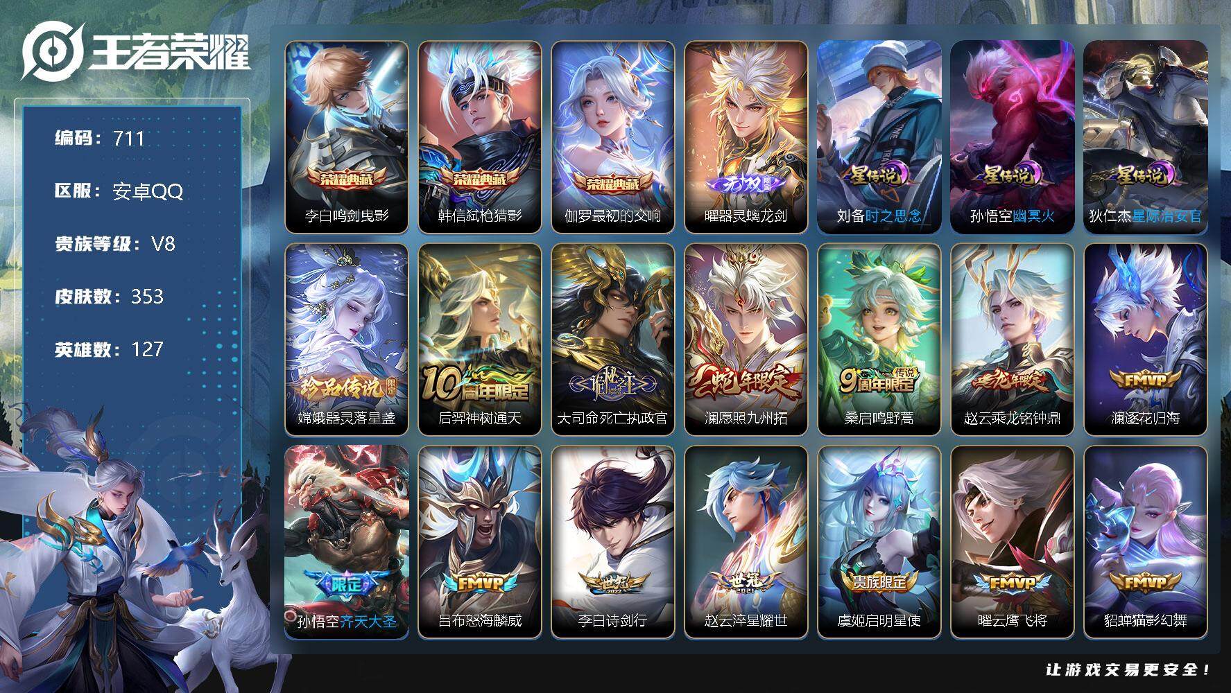 王者荣耀【安卓QQ】打野25段 6按键 安卓Q-V8-127英雄-353皮肤-3典藏-1无双-1珍