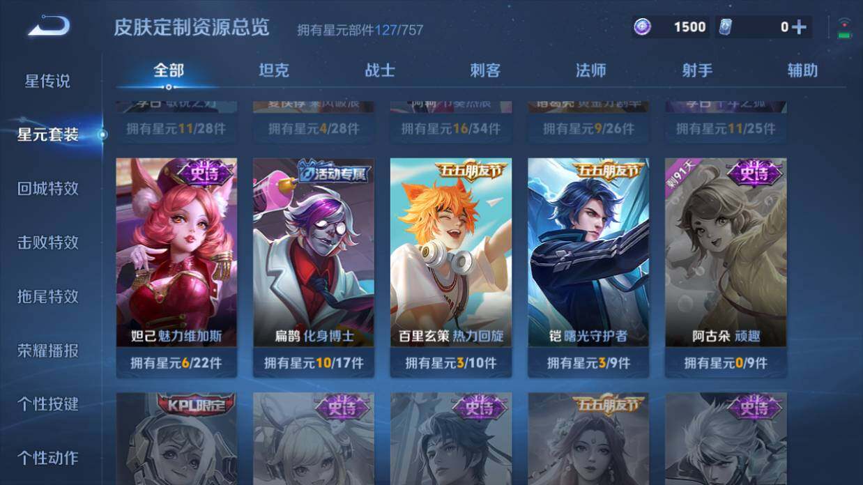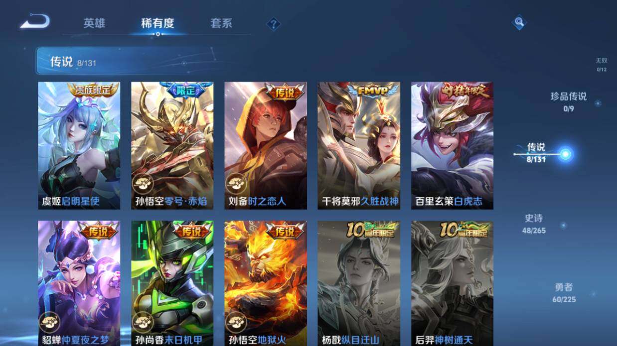 【传说皮肤】:虞姬启明星使,孙悟空零号赤焰,刘备时之恋人,干将莫邪久胜战神,百里玄策白虎志,貂蝉仲夏夜之梦,孙尚香末日机甲,孙悟空地狱火