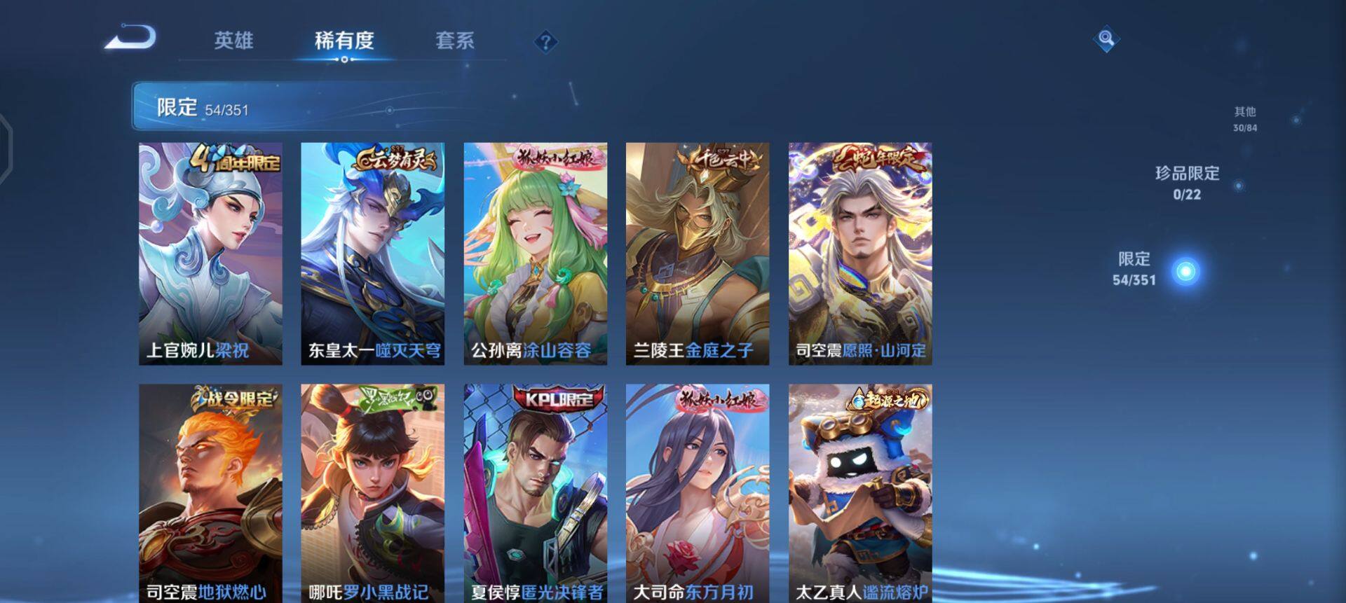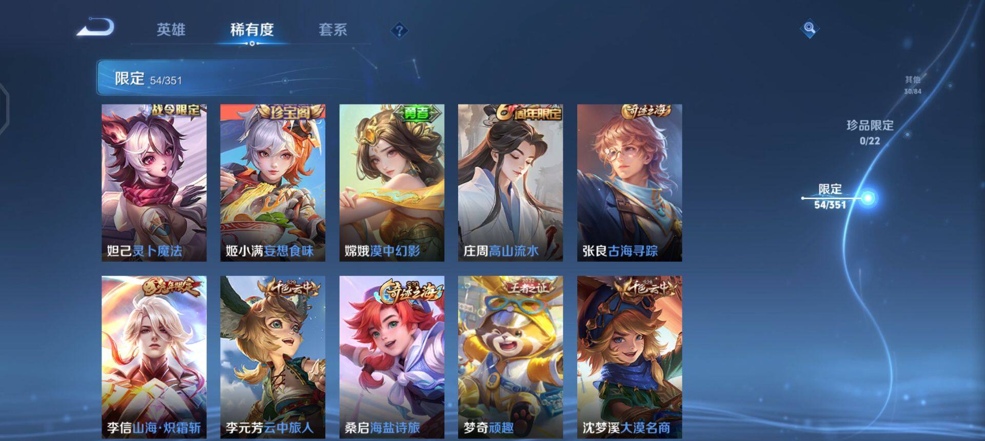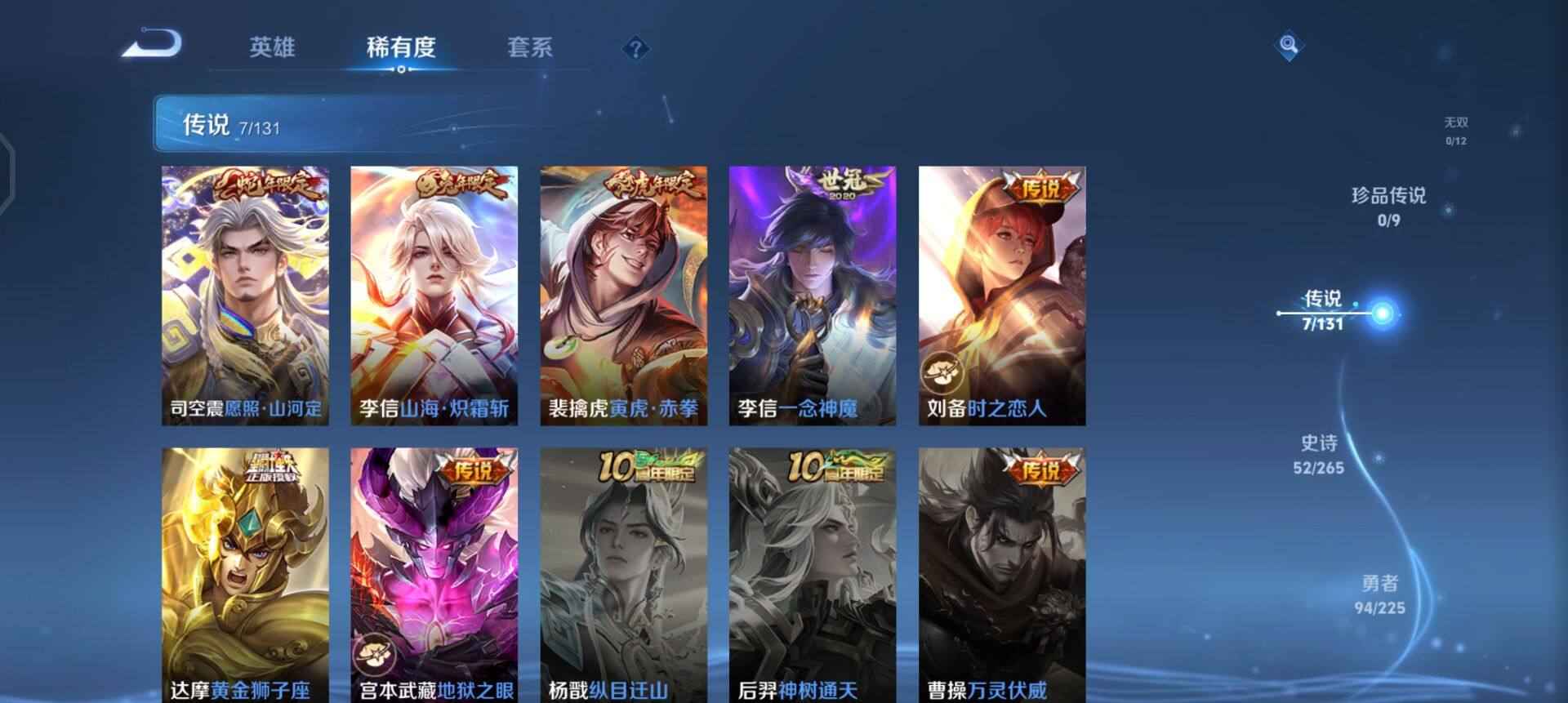 【传说皮肤】:司空震愿照山河定,李信山海炽霜斩,裴擒虎寅虎赤拳,李信一念神魔,刘备时之恋