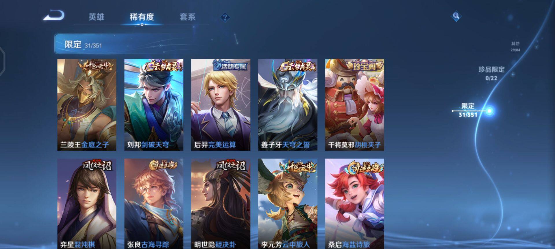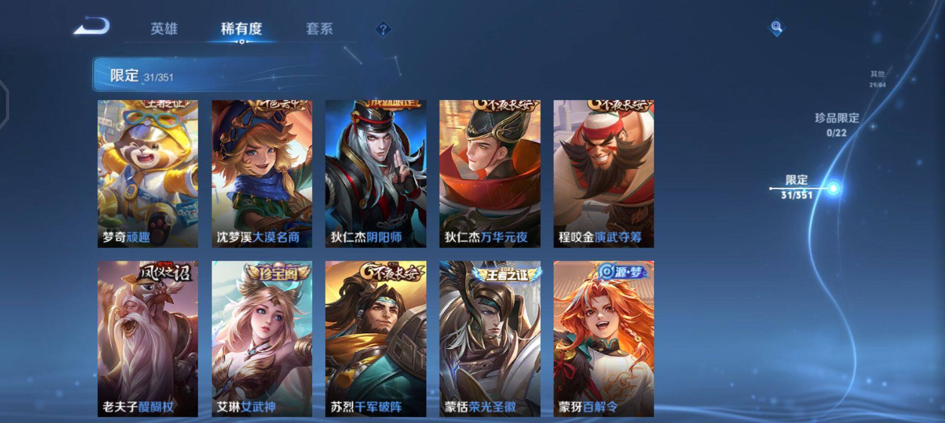 【限定皮肤】:姜子牙天穹之誓,狄仁杰阴阳师,狄仁杰万华元夜,达摩沙漠行僧,老夫子醍醐杖,程咬金演武夺筹,兰陵王金庭之子,李元芳云中旅人,钟馗驱傩正仪,干将莫邪胡桃