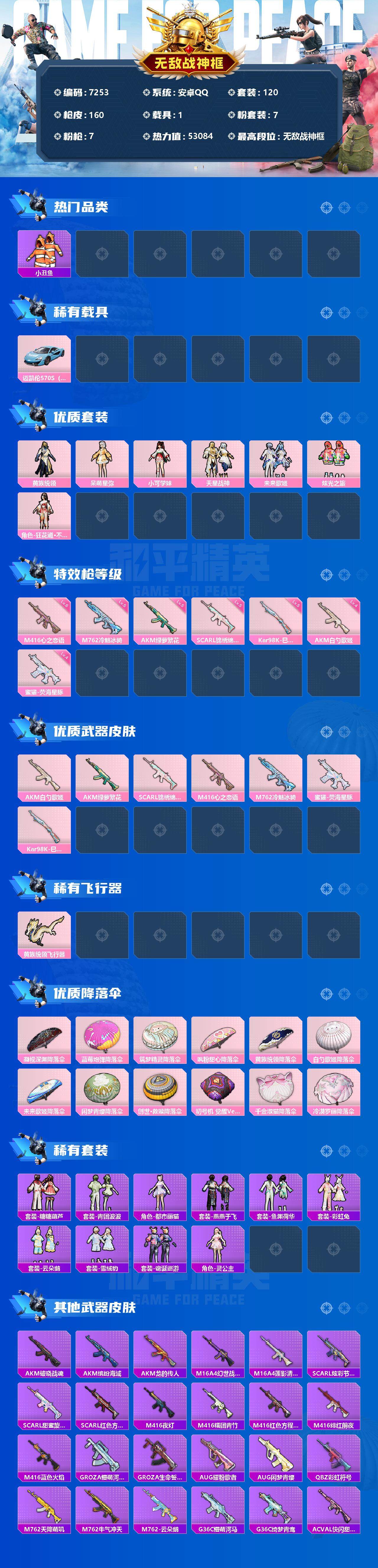 【7253】安卓 手Q-无敌战神框-7粉装-7特效枪-1载具-1粉色飞行器-53084热力值-8王牌印记-120套装-160枪皮