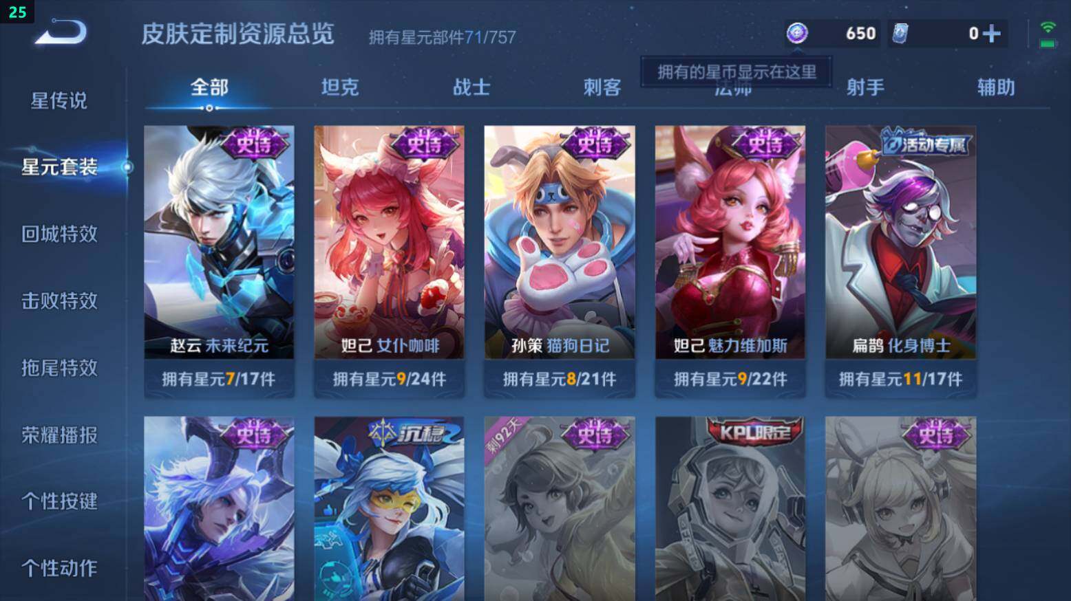 【限定】:狄仁杰阴阳师,赵云皇家上将,鲁班七号乒乒小将,高渐离玩趣恶龙,狄仁杰万华元夜,达摩沙漠行僧,项羽海滩派对,程咬金演武夺筹,兰陵王金庭之子,亚瑟潮玩骑士王,李元芳云中旅人,钟馗驱傩正仪,苏烈千军破阵,沈梦溪大漠名商,裴擒虎李小龙,裴擒虎擒涛扼浪,上官婉儿梁祝,鲁班大师探海日