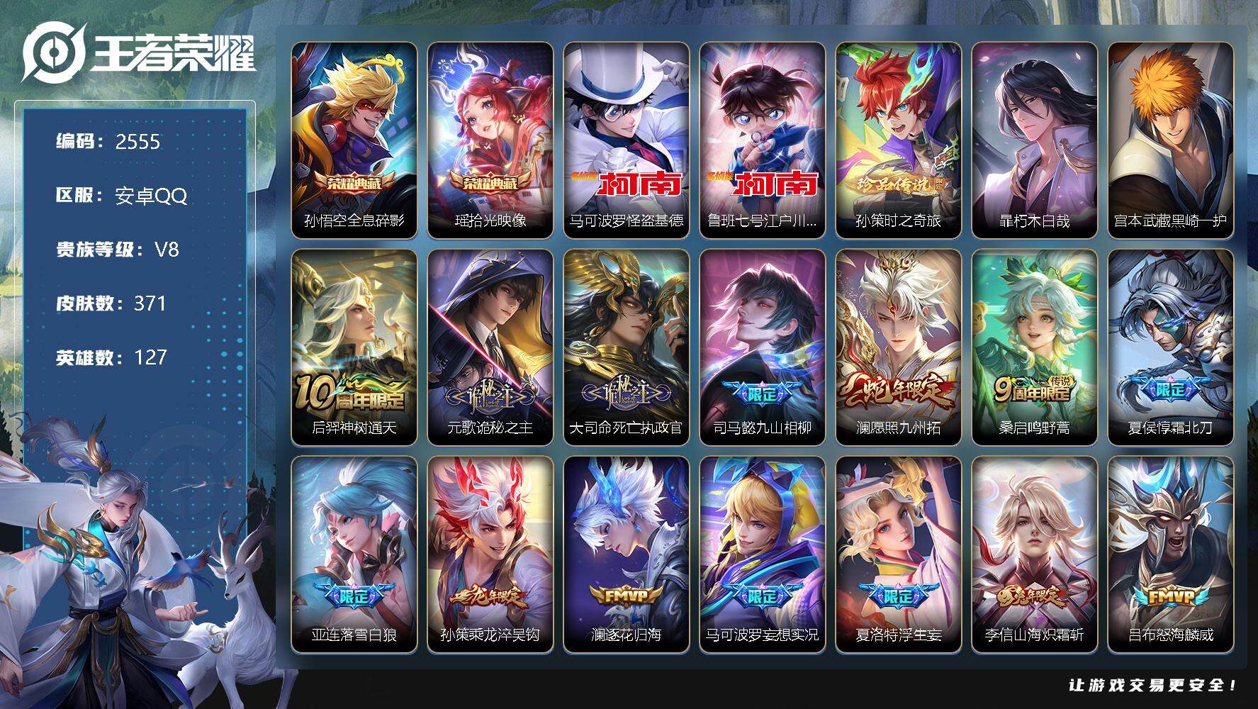 营地账号:227695463/365皮2典藏5珍传24传说全息碎影拾光映像时之奇旅黑崎一护朽木白哉怪盗基德江户川柯南,安卓Q-V8-最强王者段位-127英雄-371皮肤-2典藏-0珍品无双-0无双-5珍品传说-25传说-98史诗