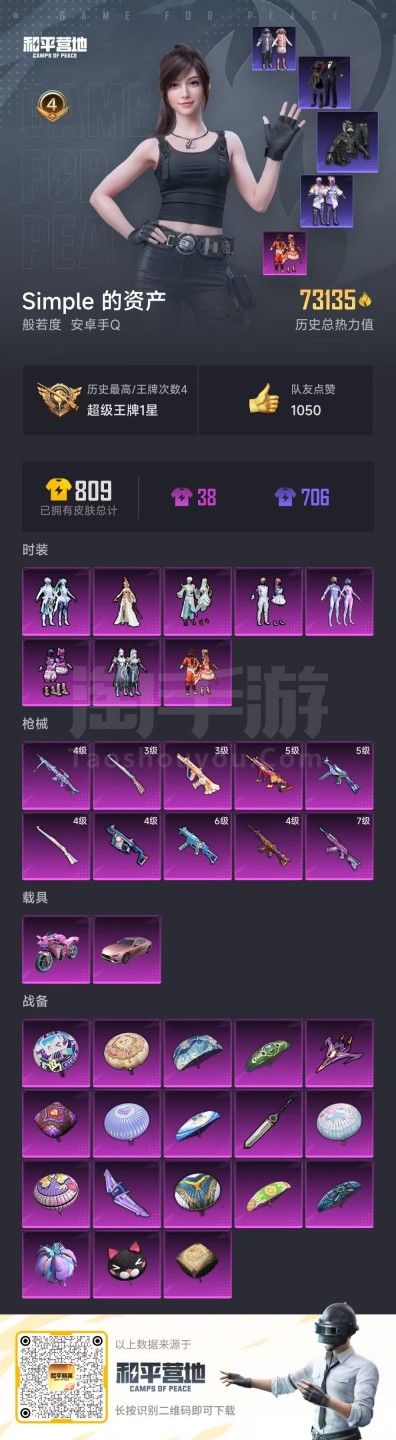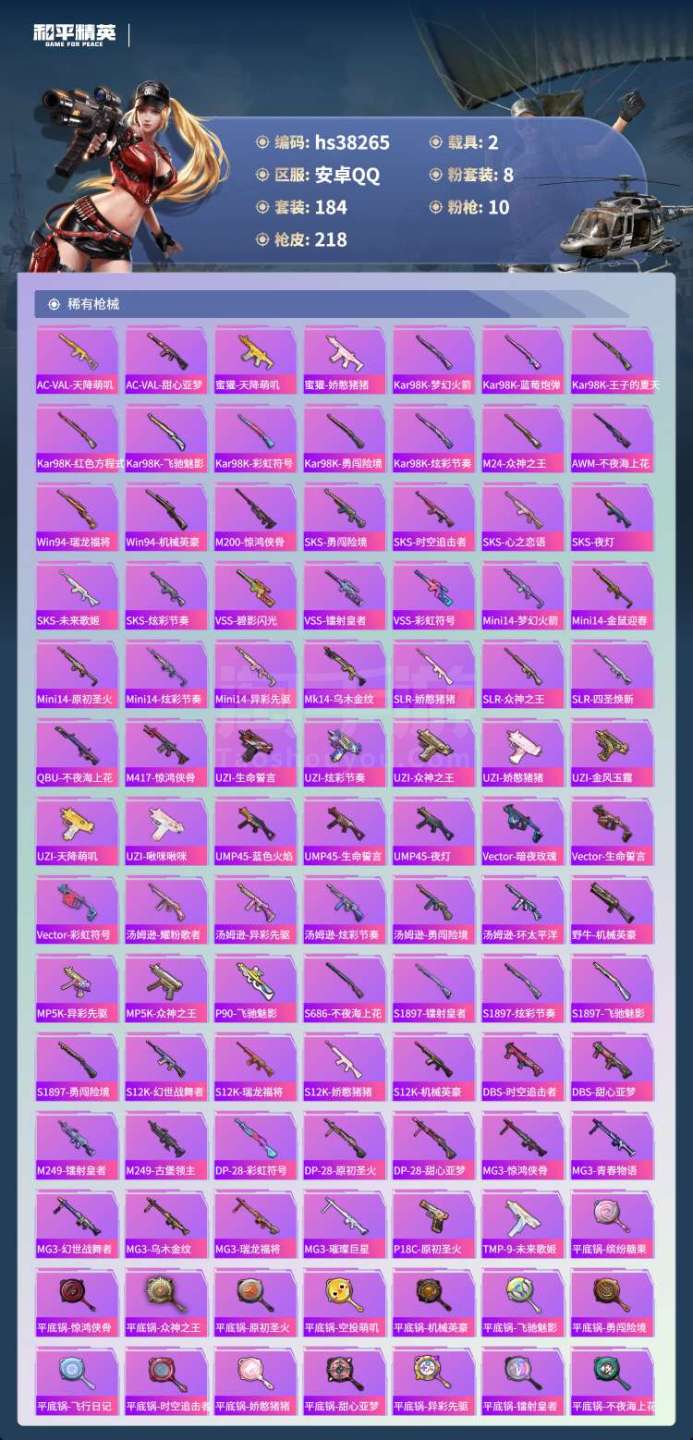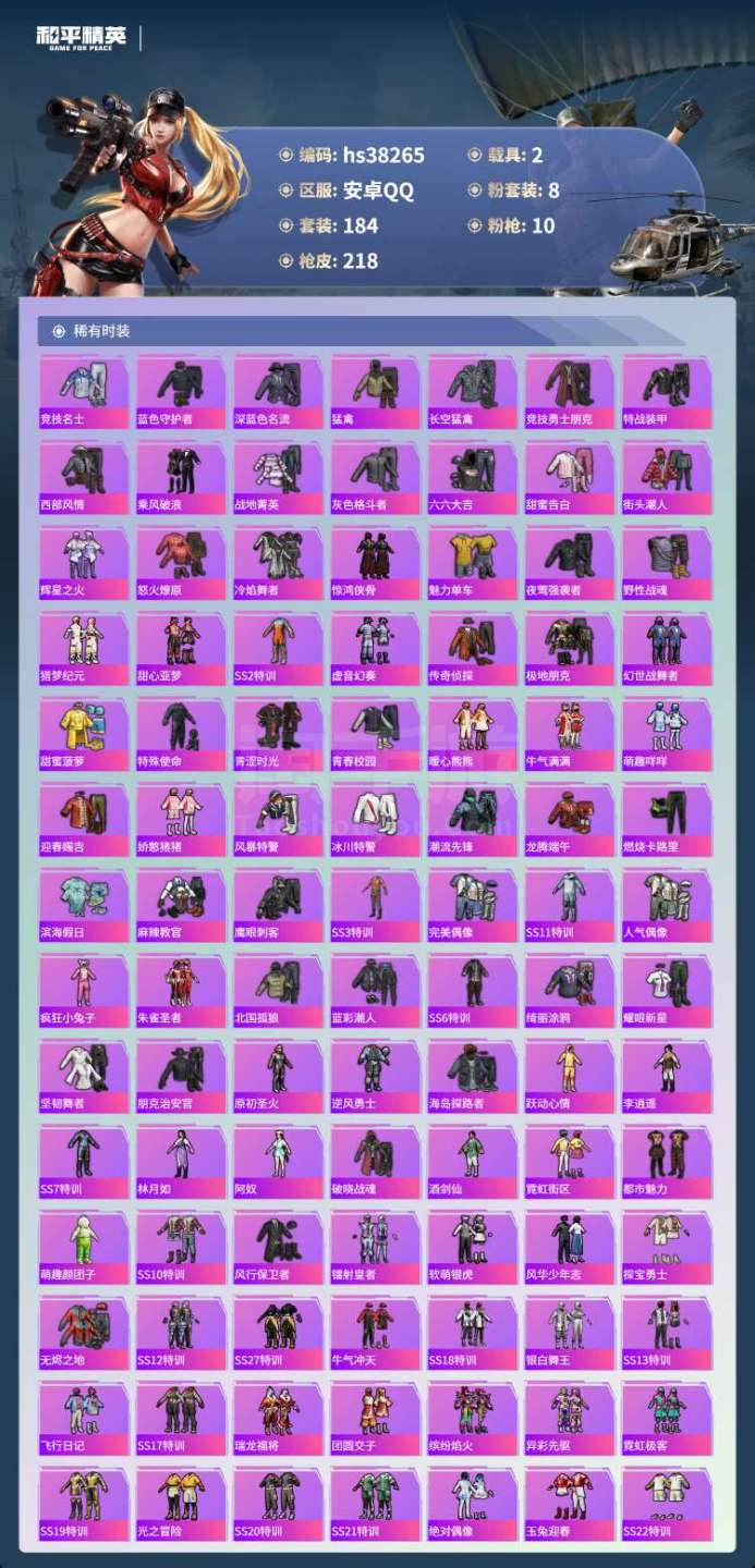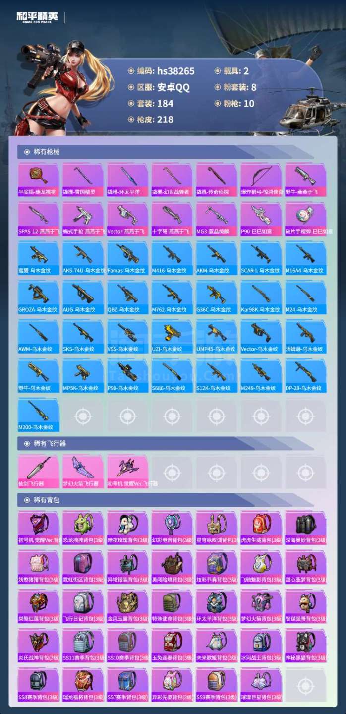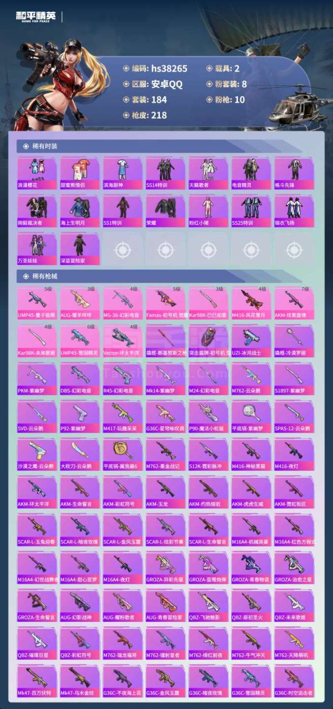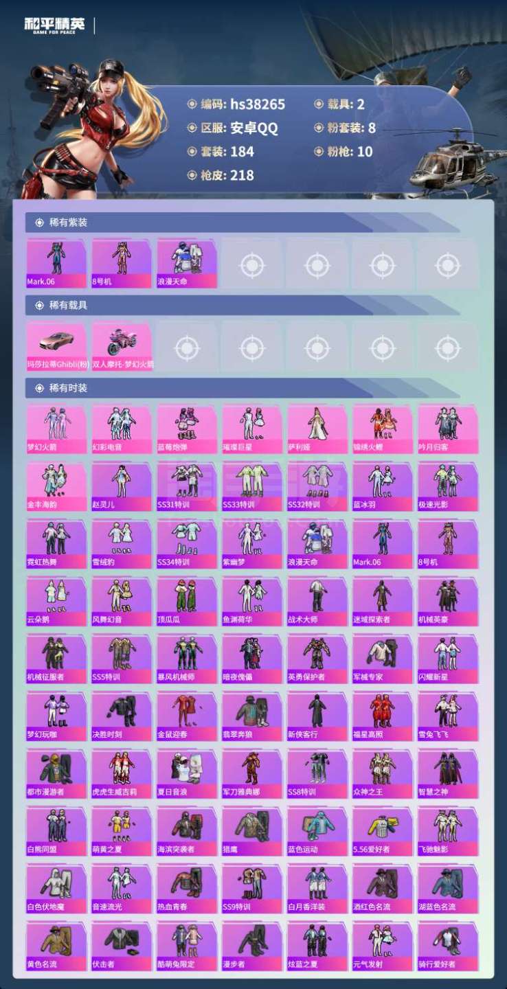 hs38265 安卓手Q-4王牌印记-8粉装-10特效枪-2载具-73803热力值-184套装-21