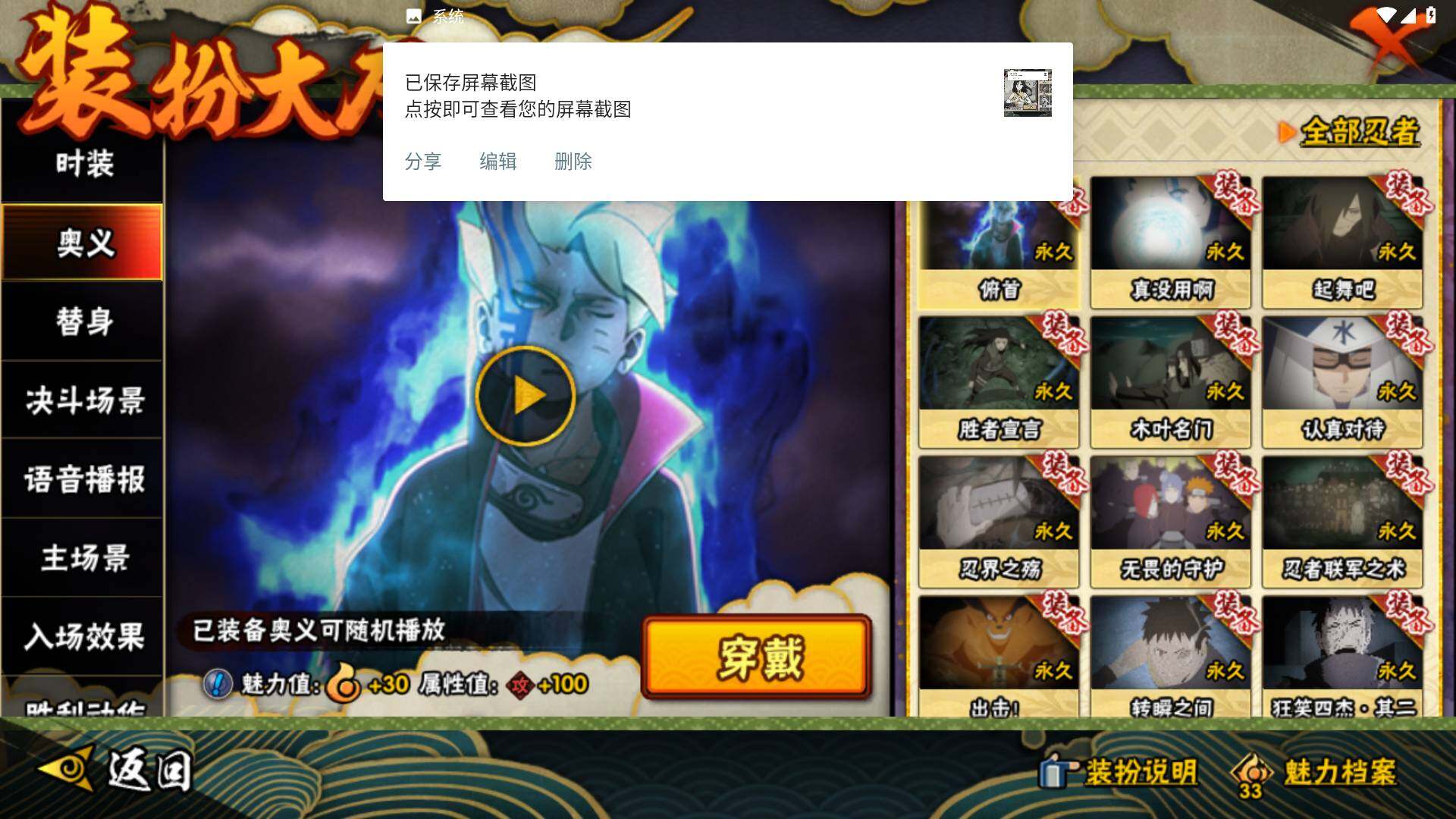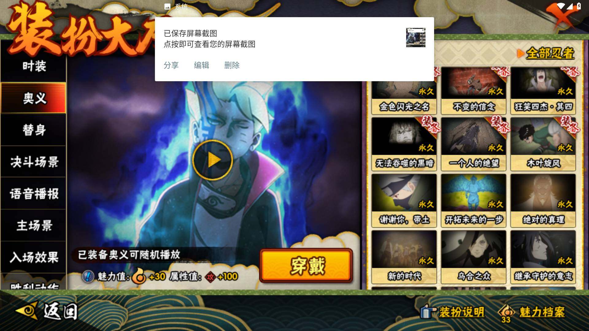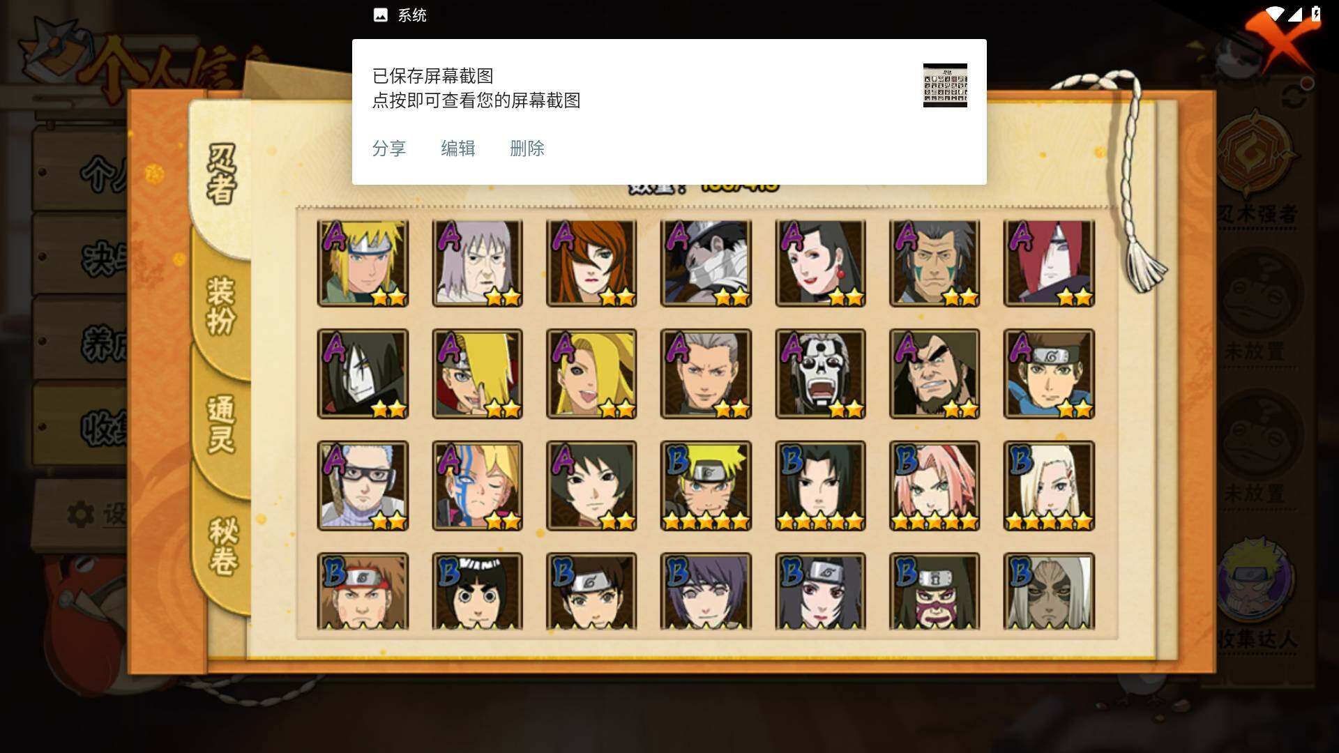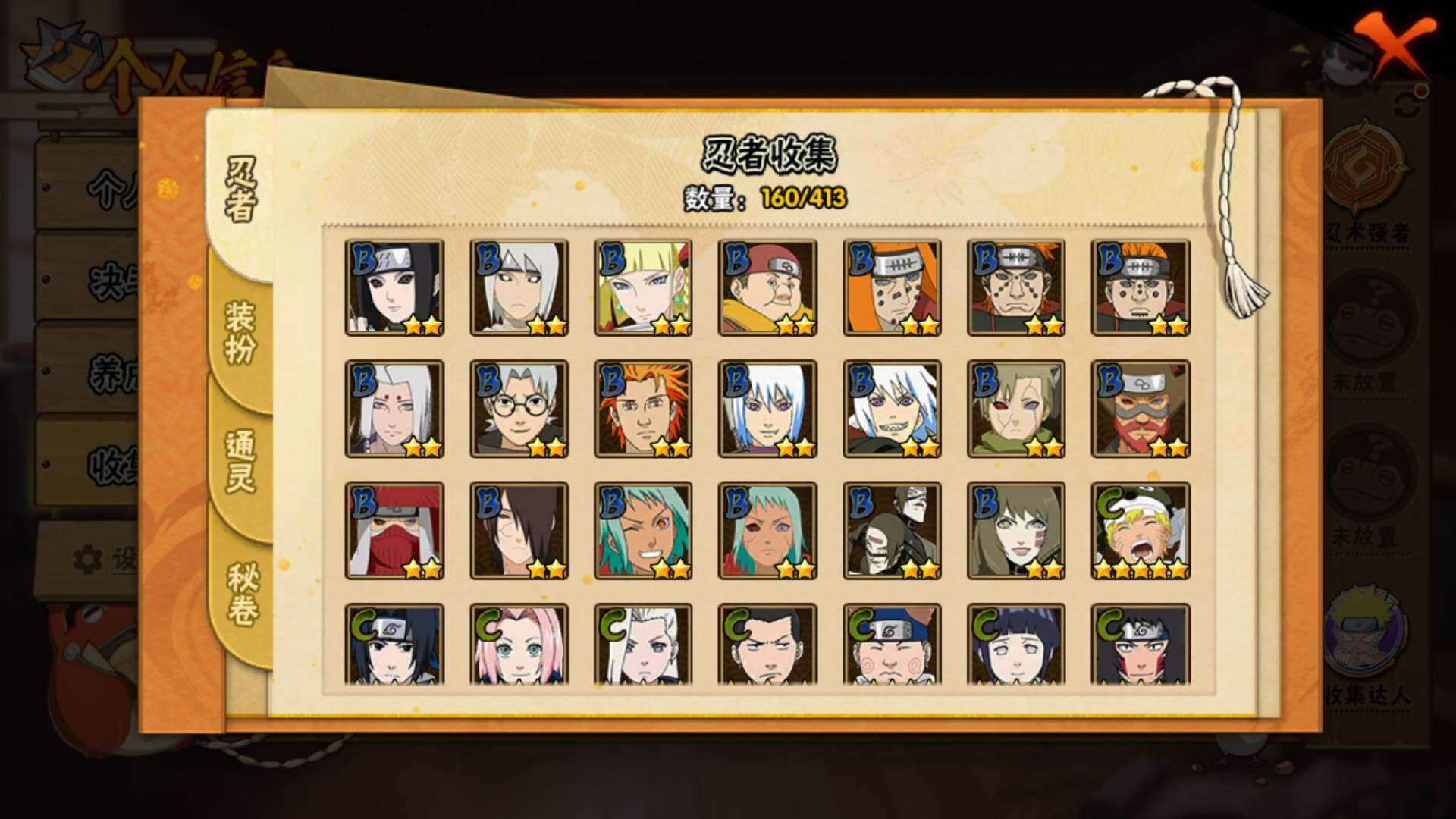 【S级忍者】:宇智波鼬「秽土转生」(3星),宇智波斑「秽土转生」(3星),宇智波斑「秽土转生·解」(3星),宇智波带土「忍界大战」(3星),宇智波鼬「须佐能乎」(3星),自来也「舞之豪杰」(3星),大蛇丸(3星),波风水门(3星),漩涡鸣人「九喇嘛连结」(3星),迈特凯「死门」(3星),佩恩「天道」(3星),宇智波斑