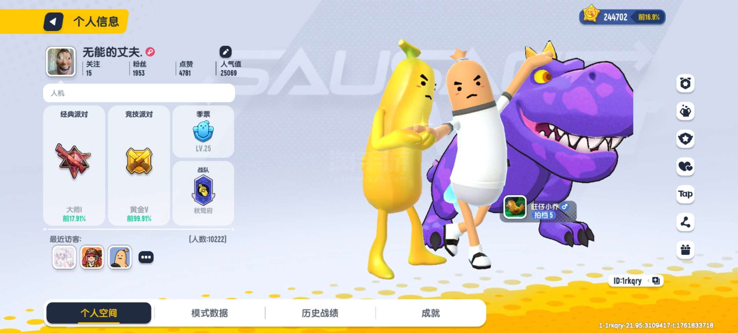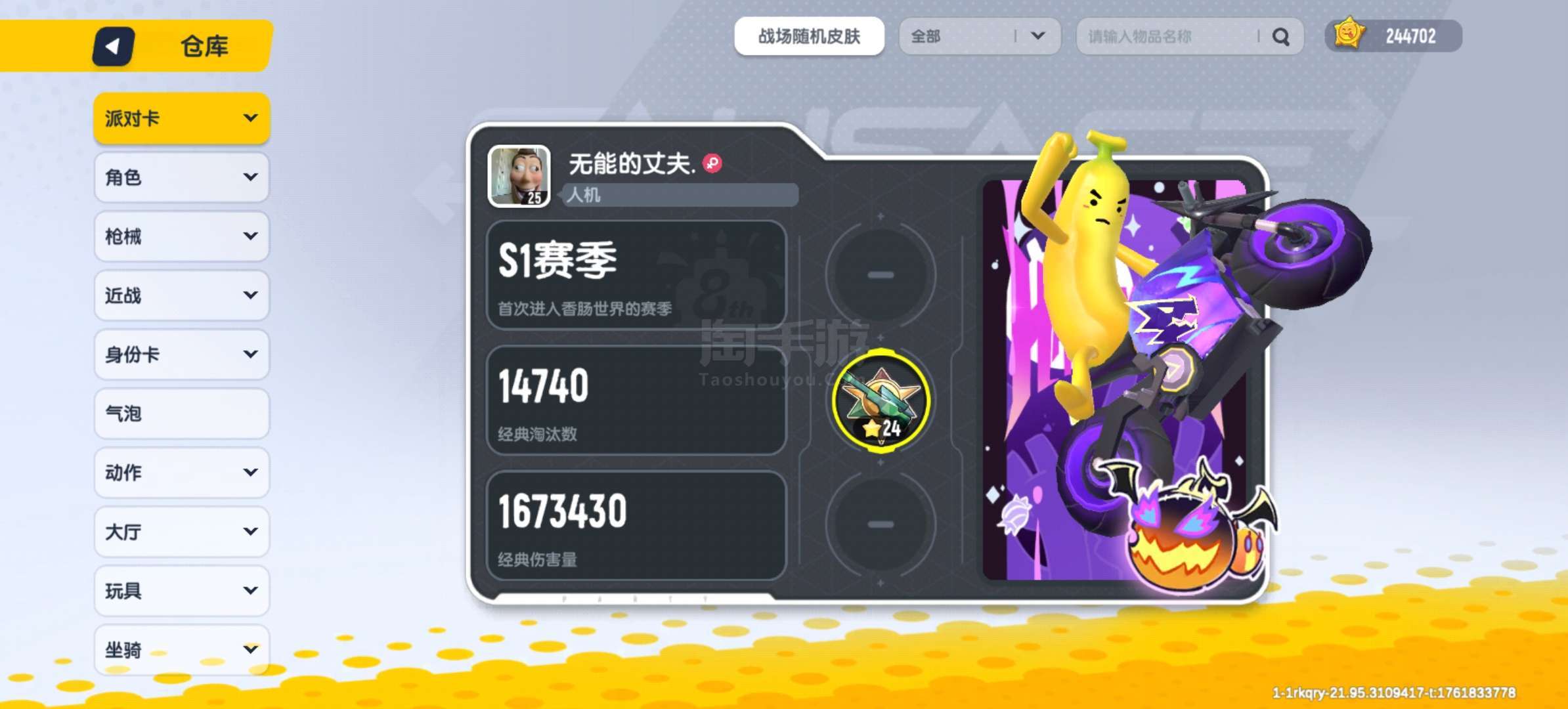 香肠派对s1老玩家,最高段位传说1896名(24颗星),一百六十万的伤害量