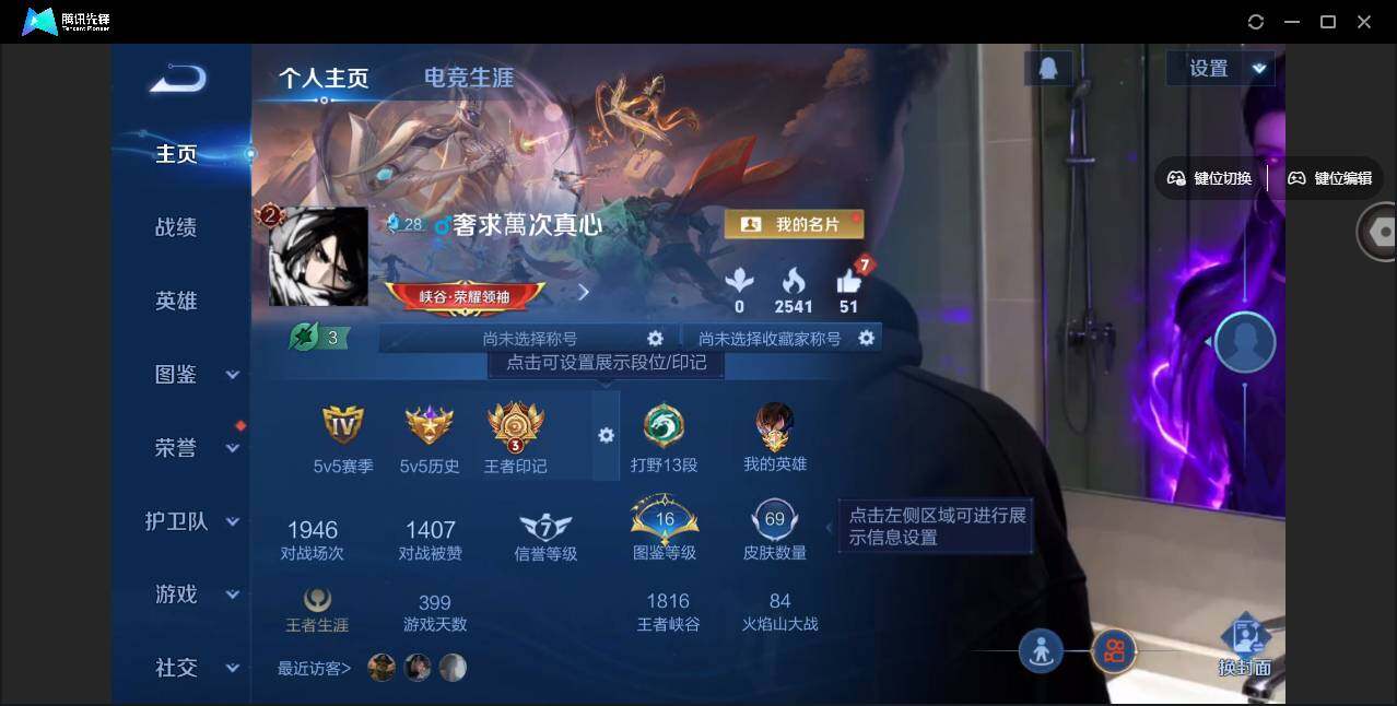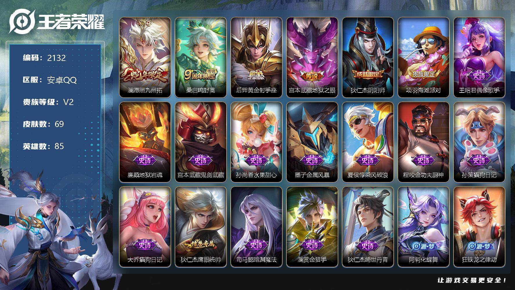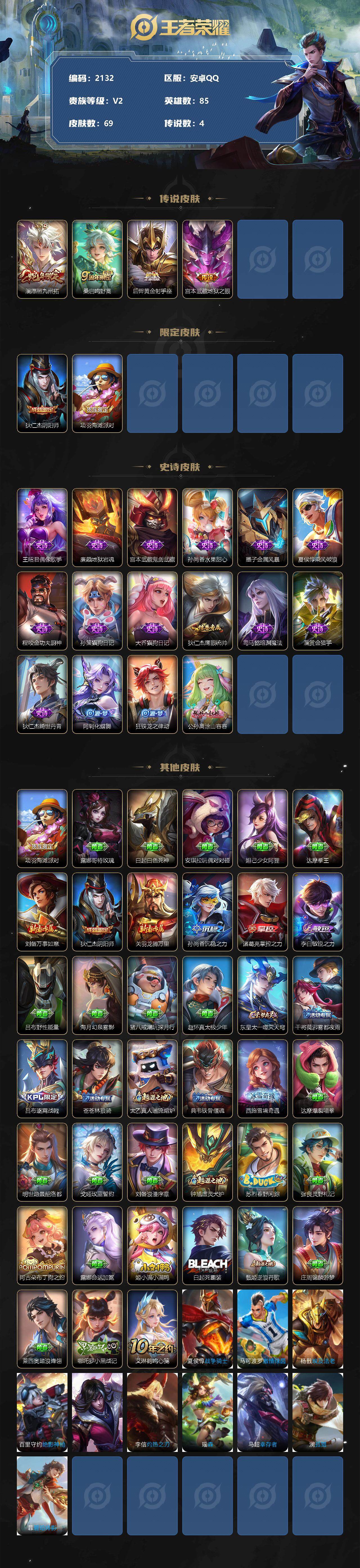 营地账号:1606604300/1536494王者荣耀账号安卓Q-V2-至尊星耀IV段位-85英雄-69皮肤-0典藏-0珍品无双-0无双-0珍品传说-4传说-16史诗