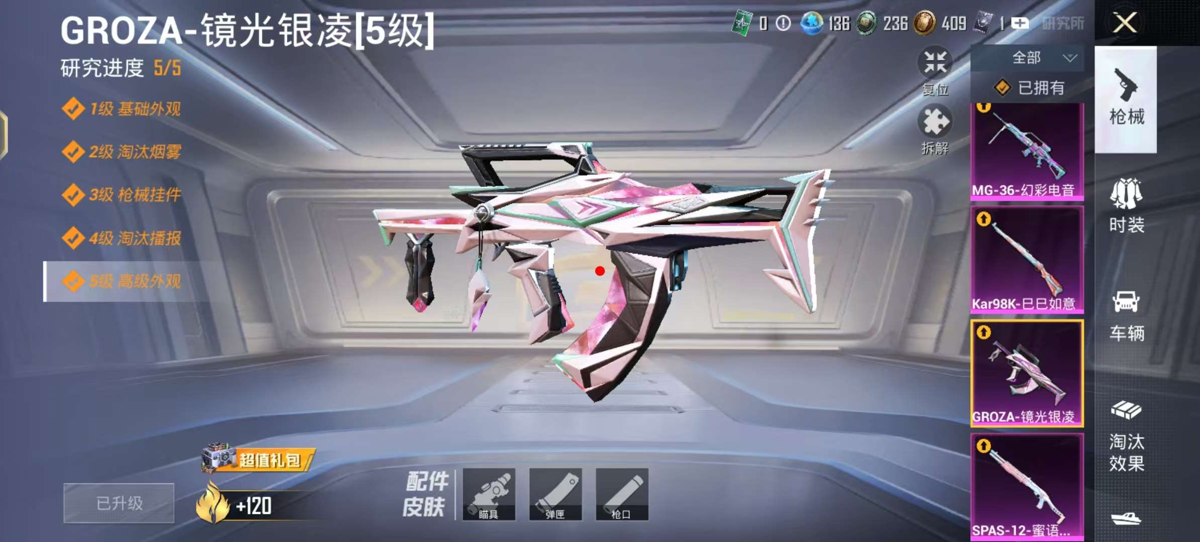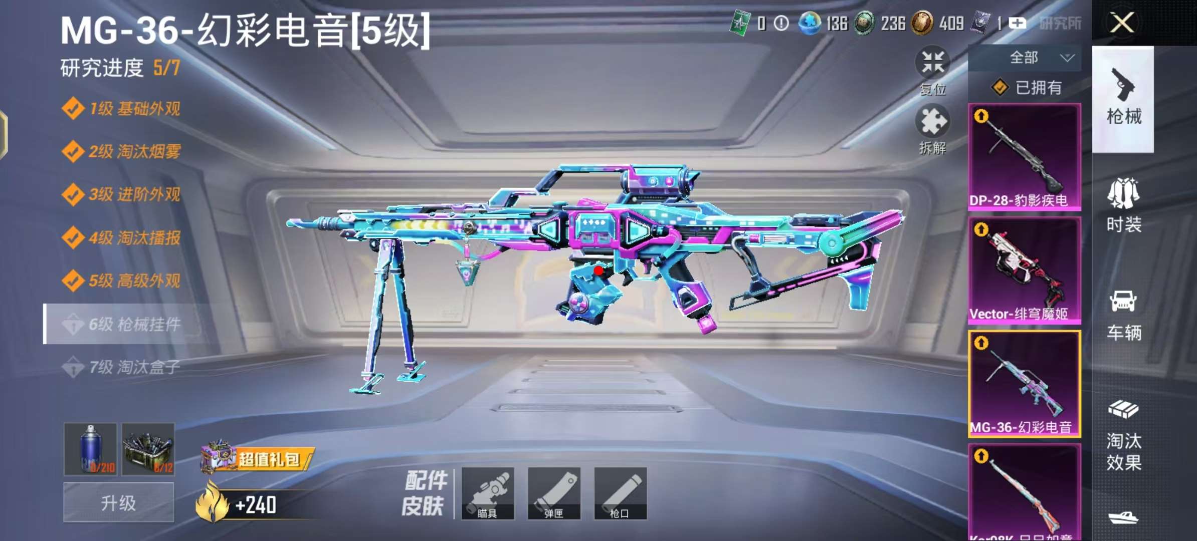 【6特效枪】Kar98K-巳巳如意(5级)SPAS-12-蜜语绒猫(4级)MG-36-幻彩电音(5级)Vector-绯穹魔姬(5级)DP-28-豹影疾电(5级)GROZA-镜光银凌(5级)营地ID:1009812609