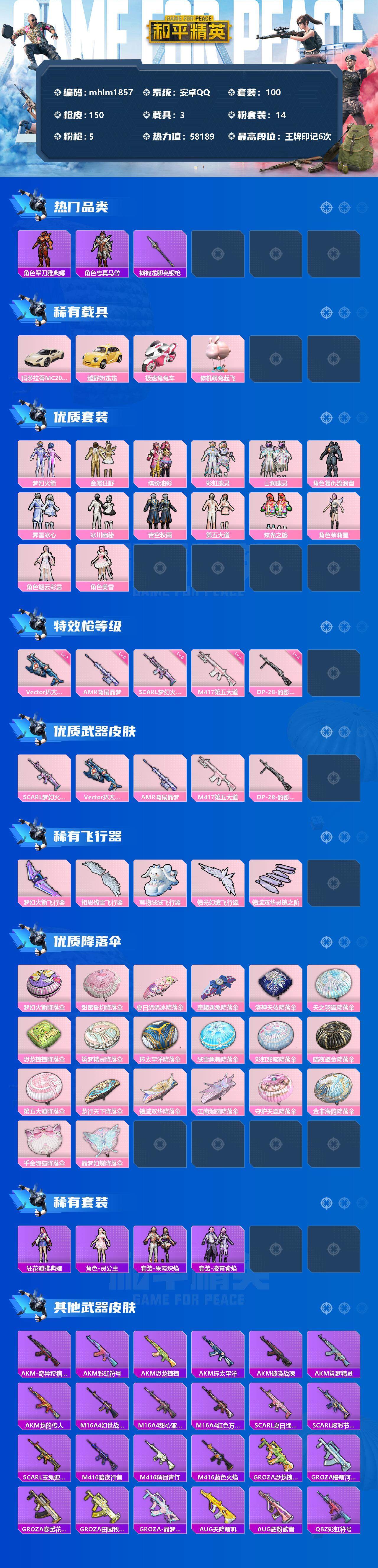 【mhlm1857】安卓 手Q-14粉装-5特效枪-3载具-5粉色飞行器-58189热力值-6王牌印记-100套装-150枪皮