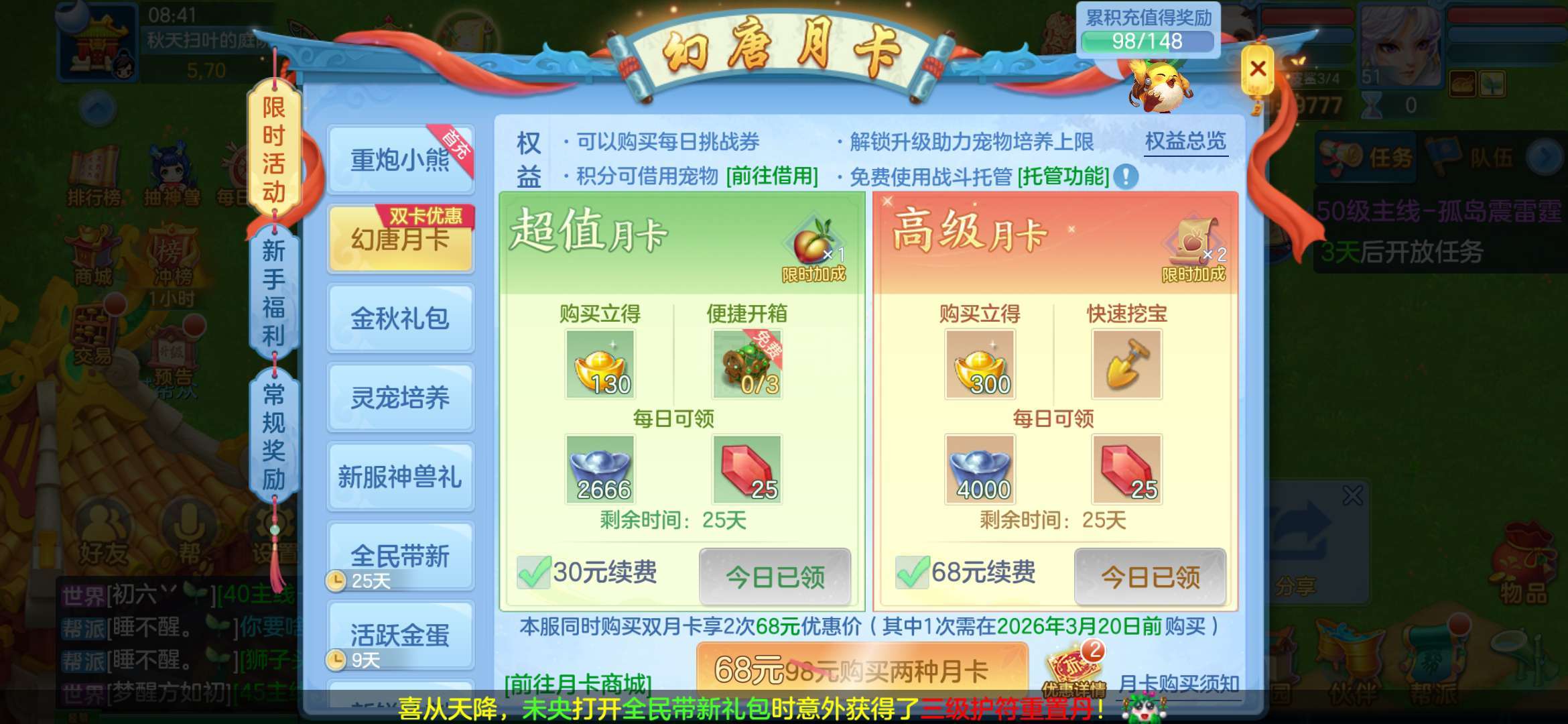 幻唐志:逍遥外传(神武4)【安卓官方】紫电青霜最新区月卡金蛋男魔王64万,600+还童丹,英豪令,隐身+连击,高级吸血+强力,宝图积分在,