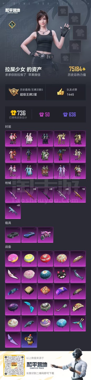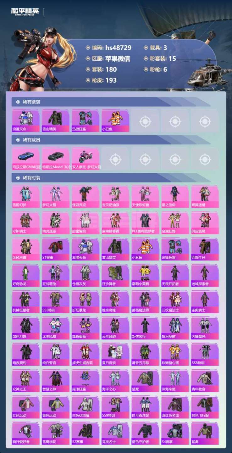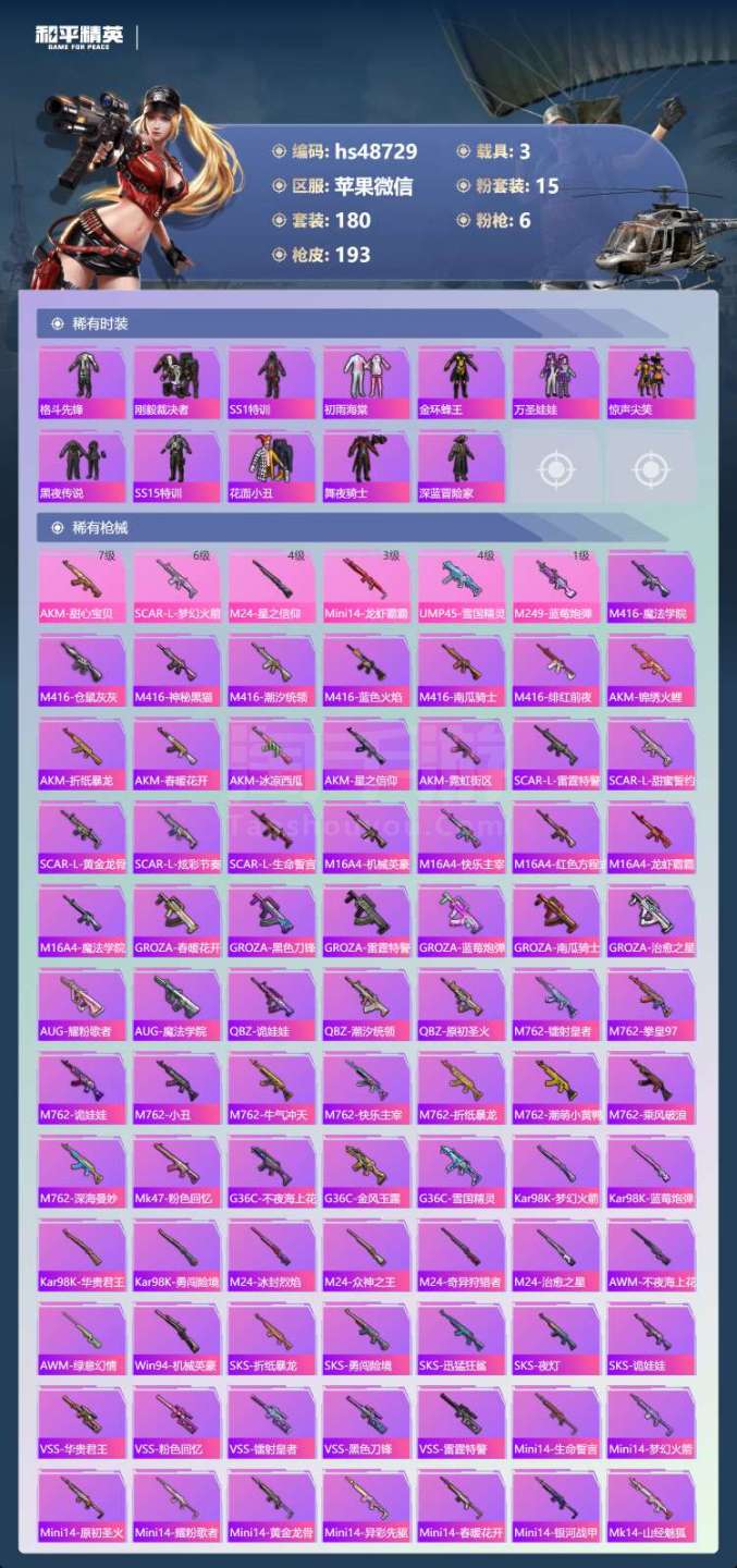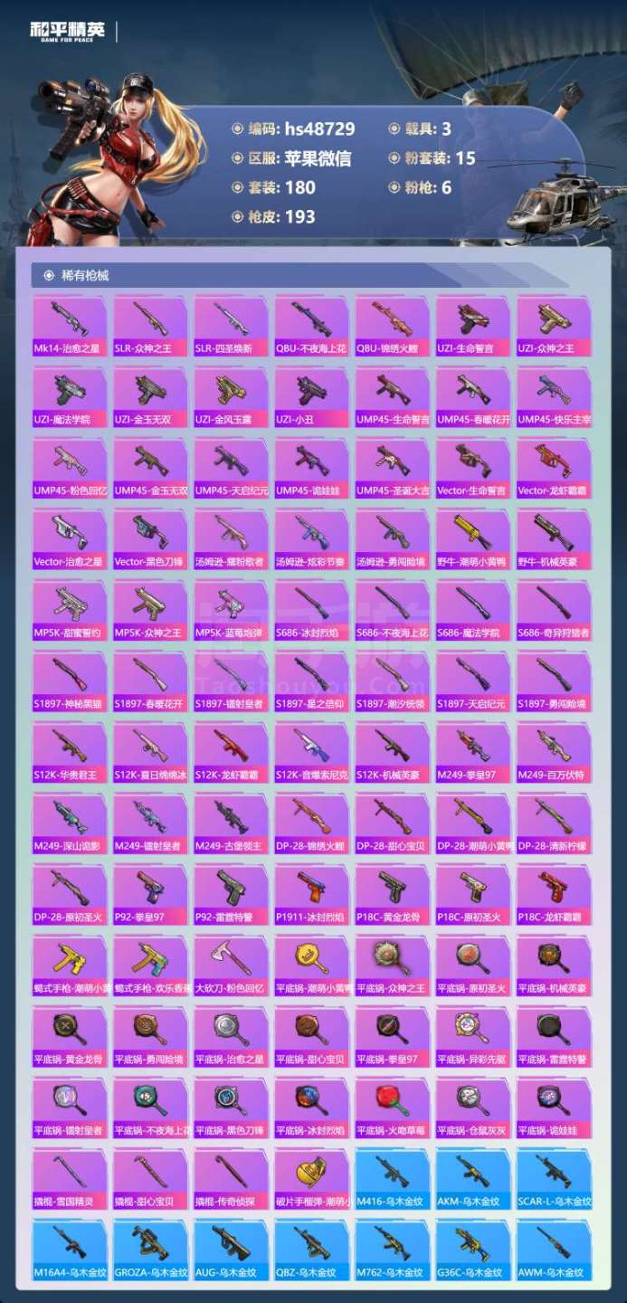 hs48729 苹果v-5王牌印记-15粉装-6特效枪-3载具-75184热力值-180套装-19