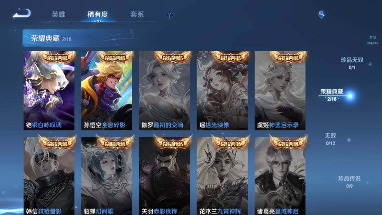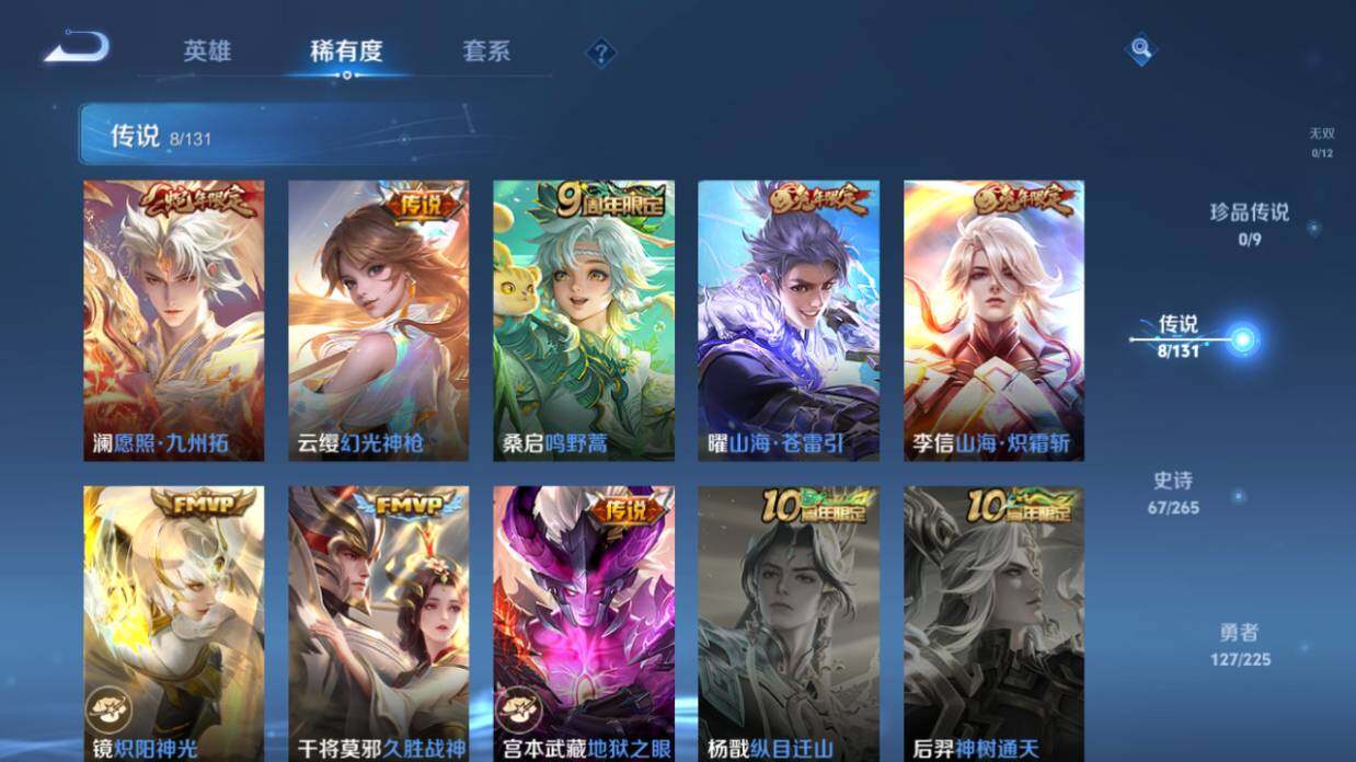 【传说皮肤】:澜愿照九州拓,云缨幻光神枪,桑启鸣野蒿,曜山海苍雷引,李信山海炽霜斩,镜炽阳神光,干将莫邪久胜战神,宫本武藏地狱之眼