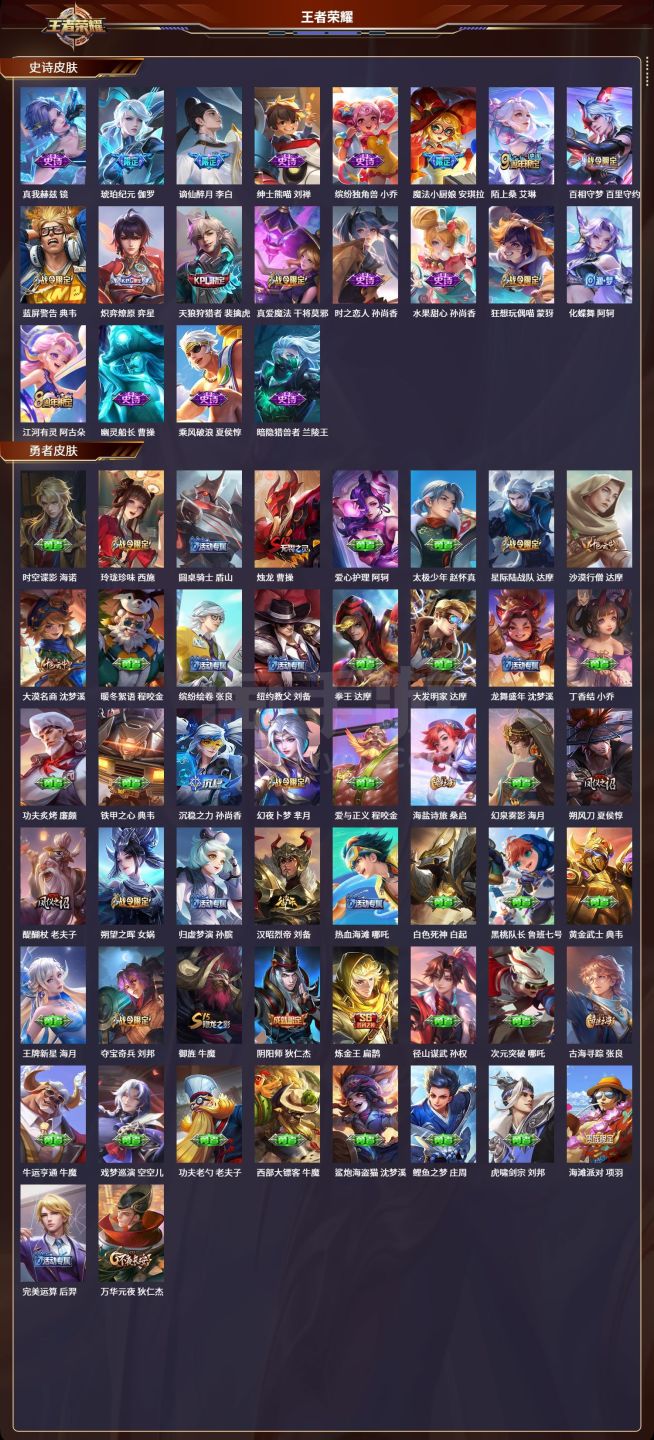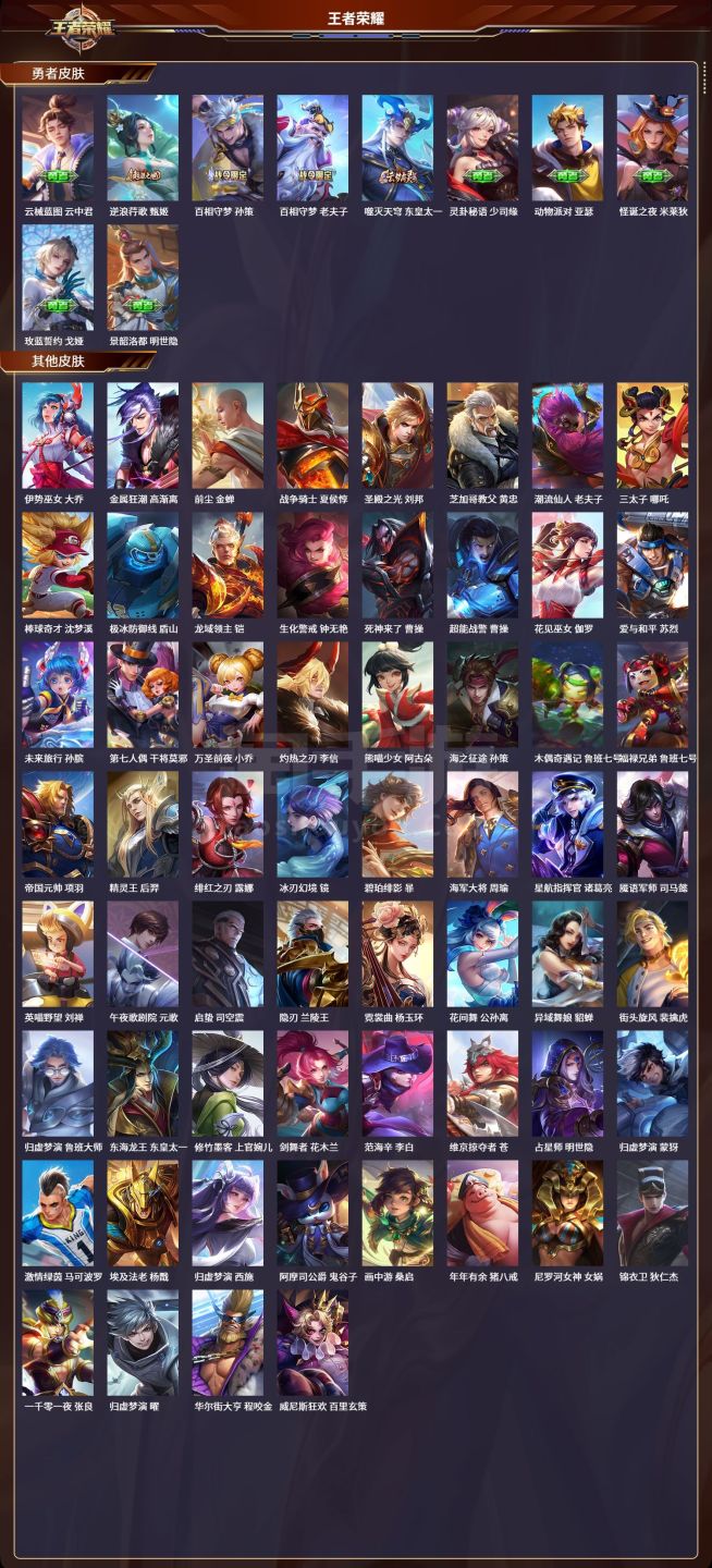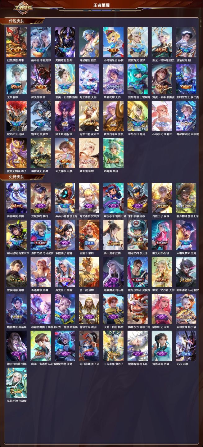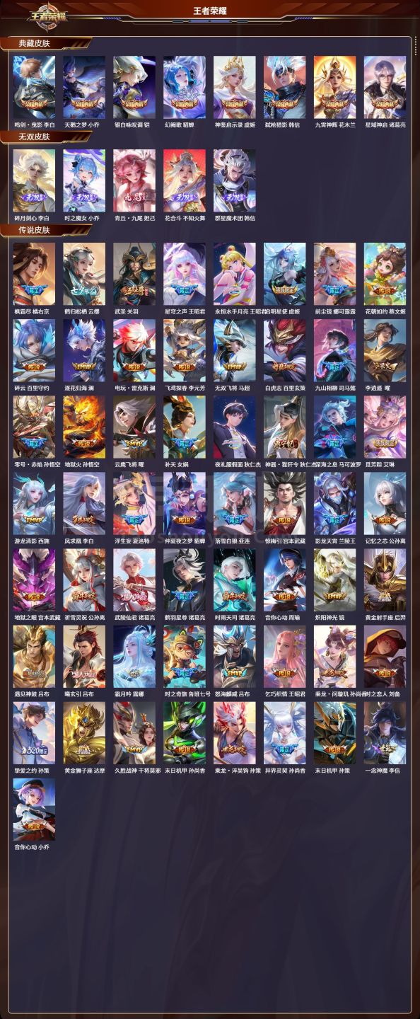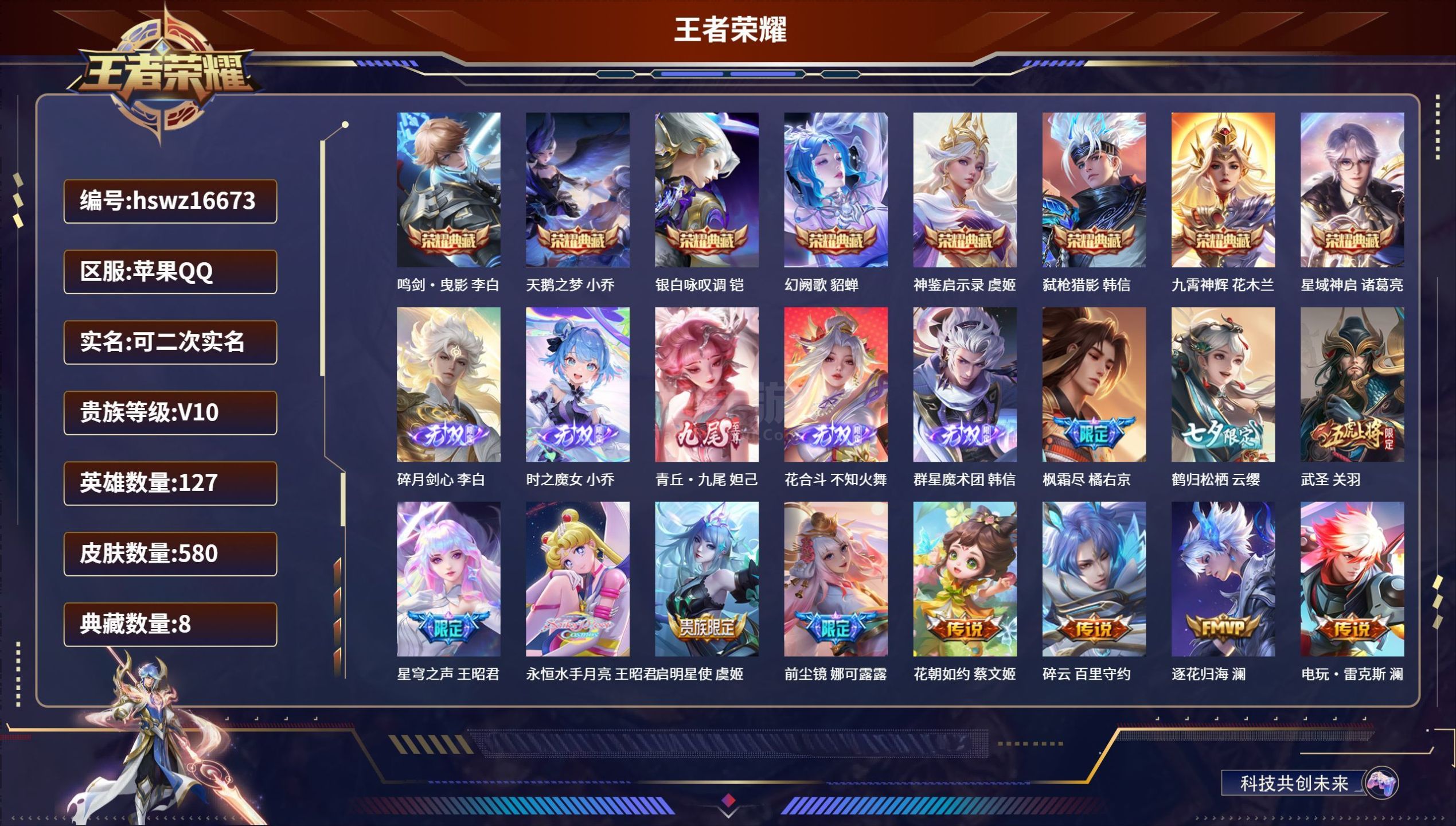 苹果QQ/非凡王者/580皮肤/127英雄/8典藏/0珍品无双/5无双/0珍品传说/86传说/201