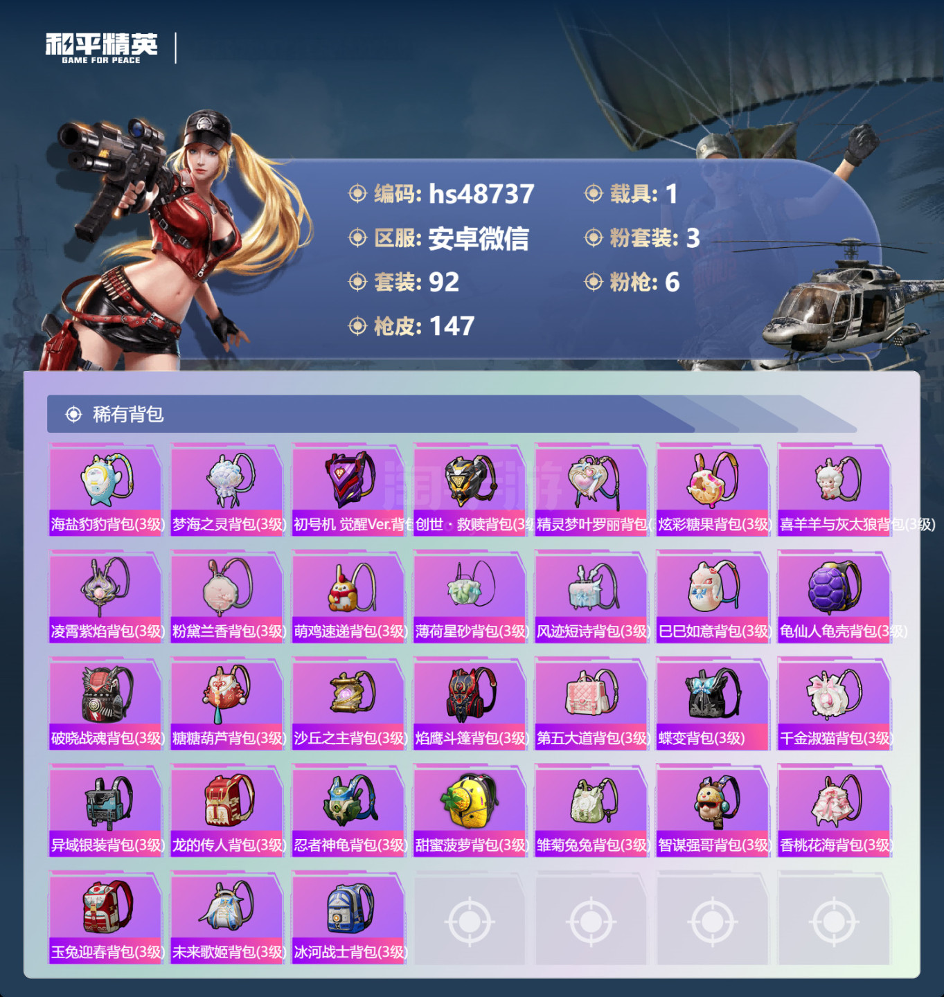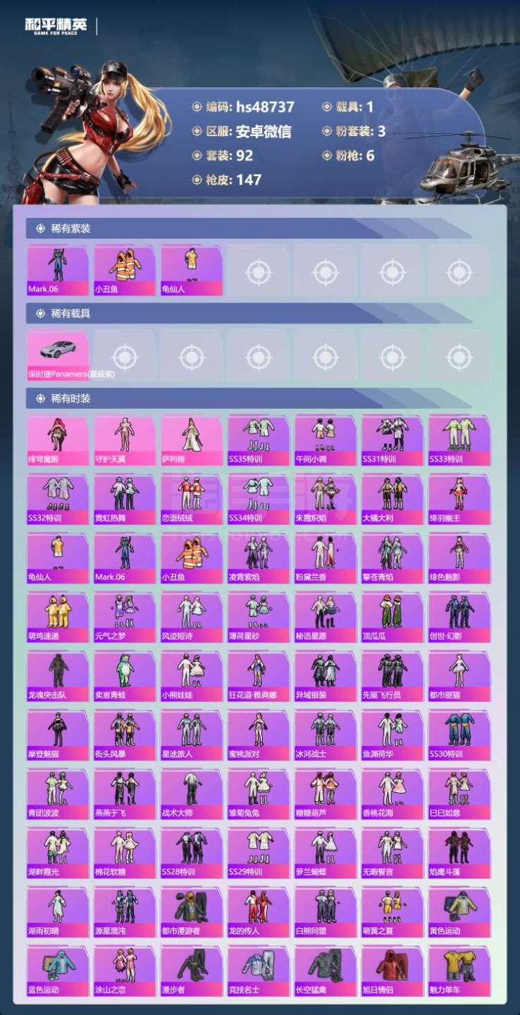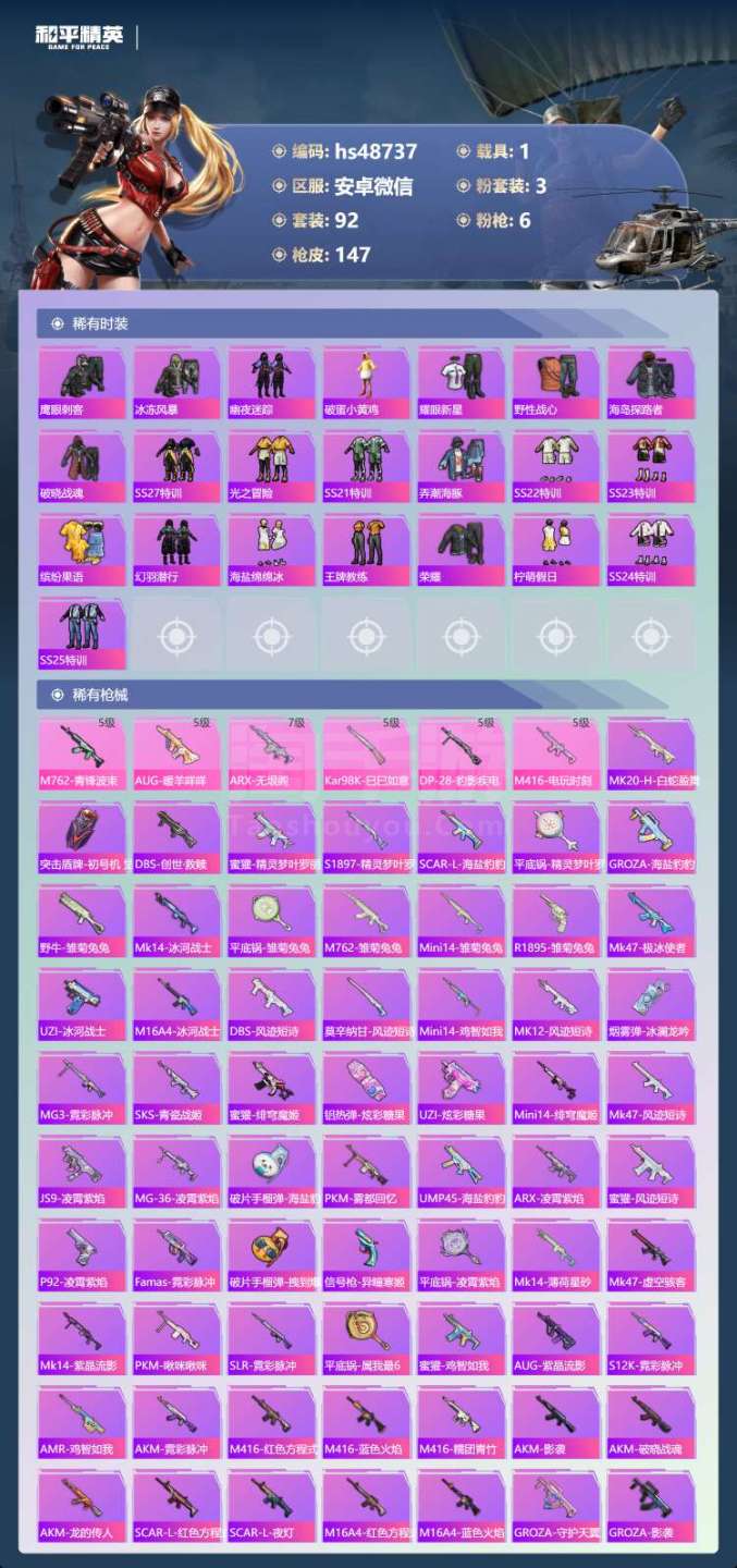 hs48737 安卓v-12王牌印记-3粉装-6特效枪-1载具-44058热力值-92套装-147
