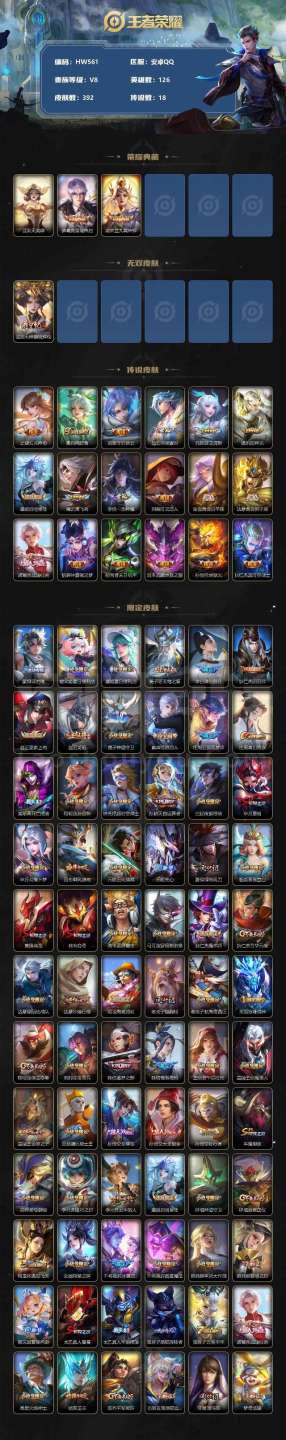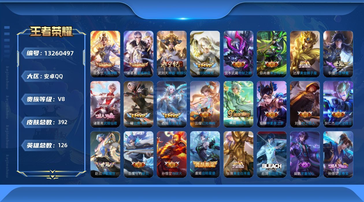 贵族8/皮肤392/典藏2/传说18/史诗132/英雄126/刘邦全皮/钟馗全皮/太乙真人全皮/猪八
