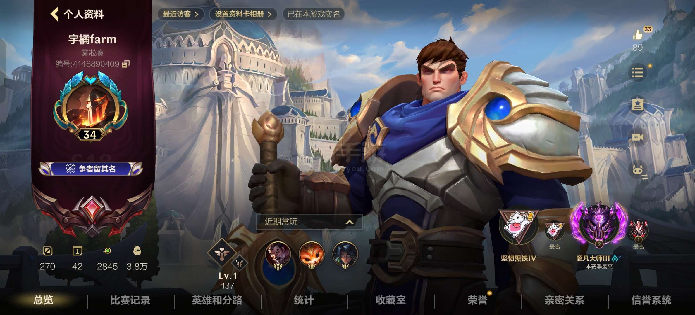 超凡大师段位,最高宗师,一万五蓝色精粹,十几个皮肤,一个史诗一个传说,信誉超好