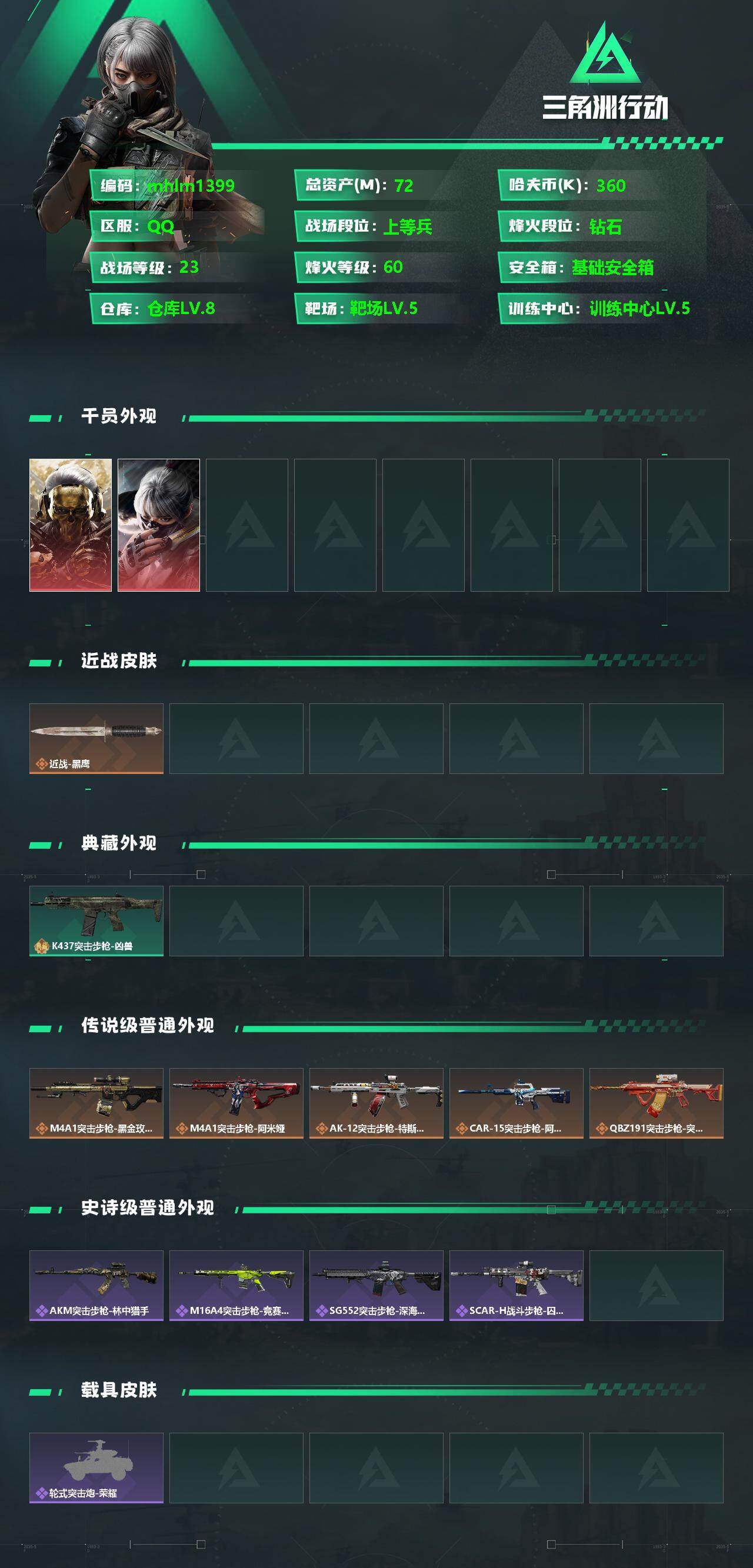 【mhlm1399】总资产:71.6M,哈夫币:36W,武器皮肤110,烽火60级:钻石,战场23级:上等兵,通行证30级:通行证免费版 【安全箱】基础安全箱;【特勤处等级】仓库LV.8,指挥中心LV.5,训练中心LV.5,靶场LV.5,潜水中心LV.1,收藏室LV.1;【干员皮肤2】:红狼蚀金玫瑰,骇爪水墨云图;【已有捆绑包3】:蚀金玫瑰捆绑包,捞点薯条捆绑包,特斯拉线圈捆绑包;【近战皮肤】: