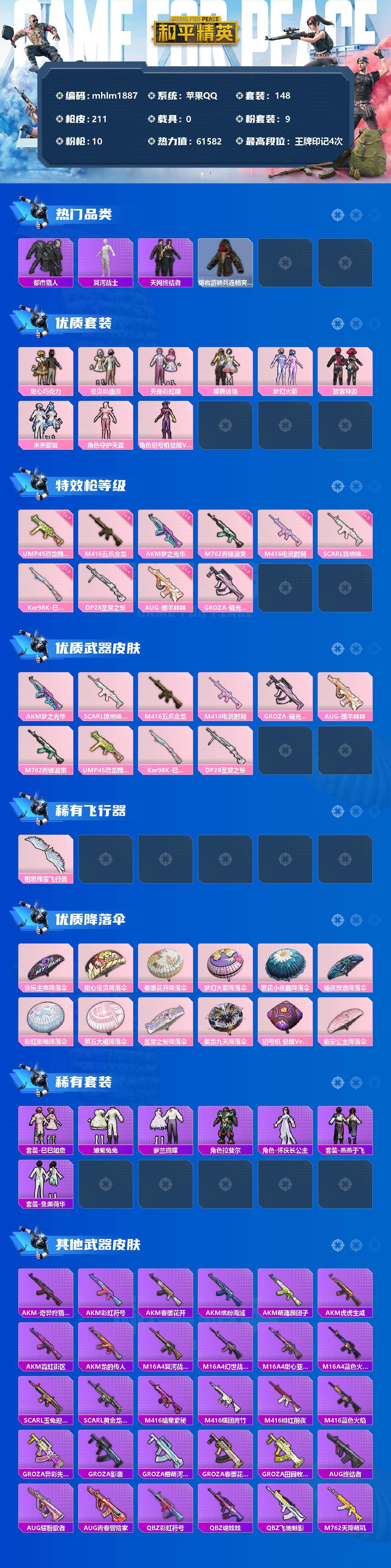 【mhlm1887】苹果 手Q-9粉装-10特效枪-0载具-1粉色飞行器-61582热力值-4王牌印记-148套装-211枪皮