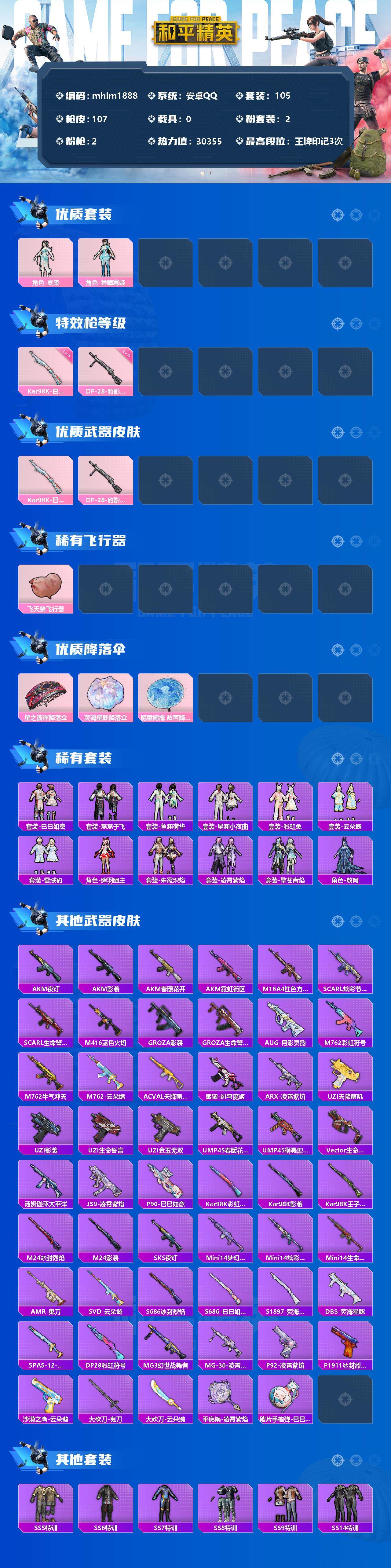 【mhlm1888】安卓 手Q-2粉装-2特效枪-0载具-1粉色飞行器-30355热力值-3王牌印记-105套装-107枪皮